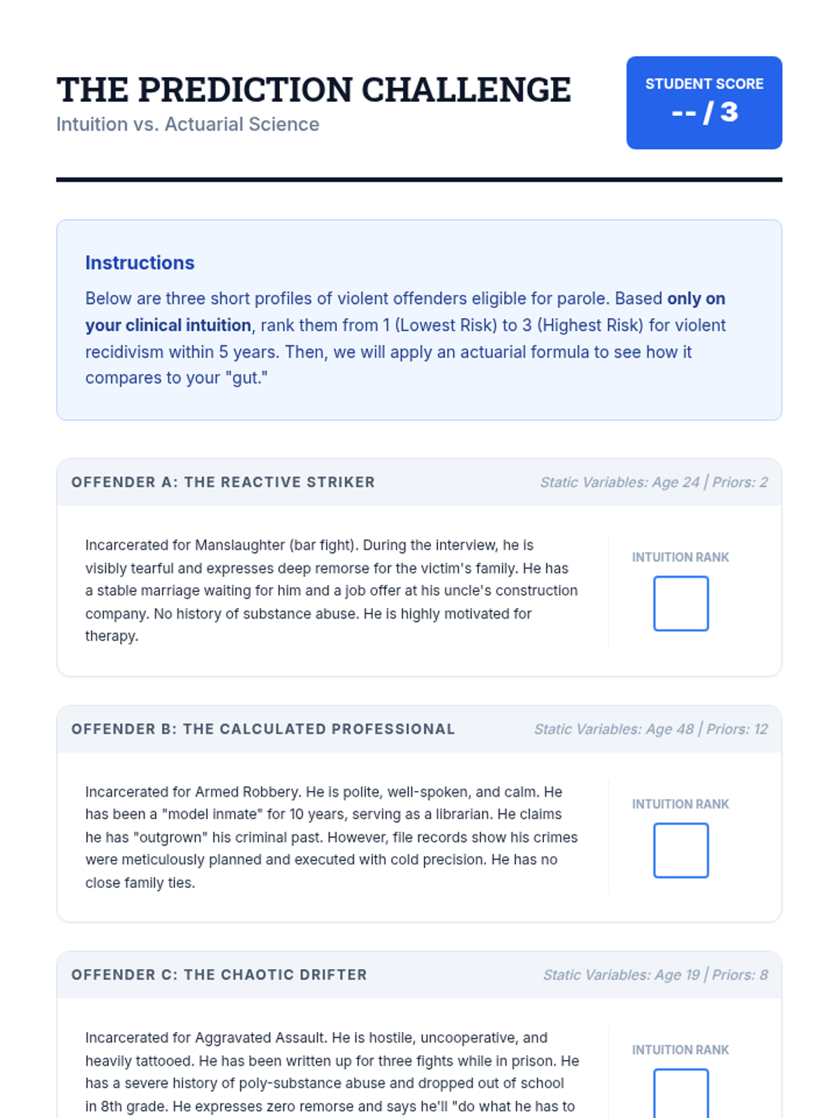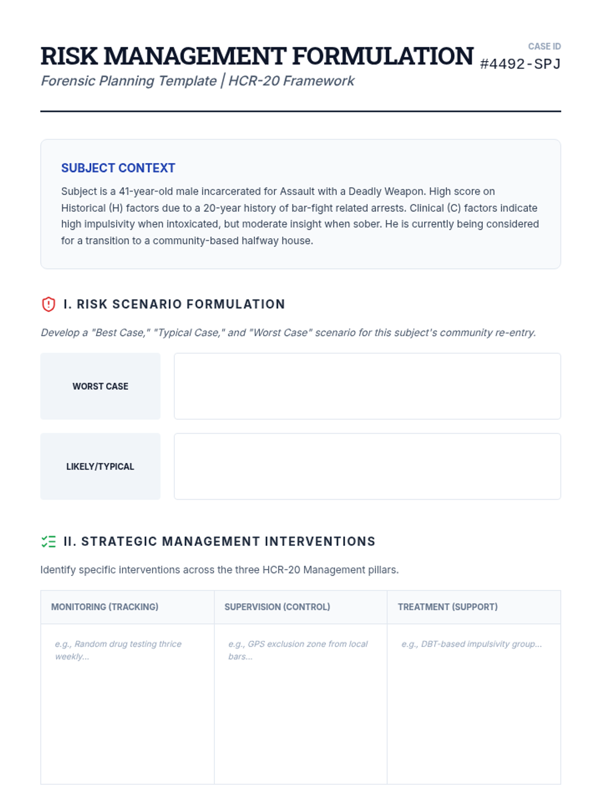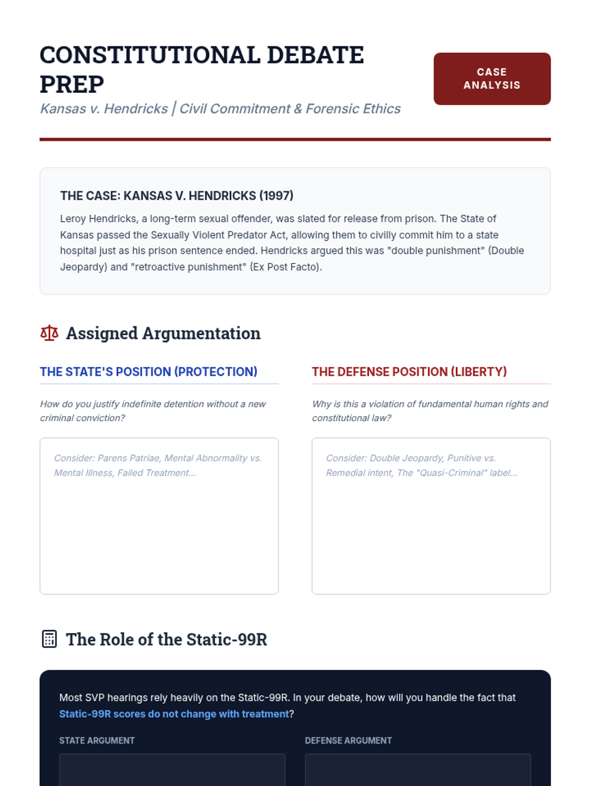 An advanced clinical sequence for graduate students focusing on the assessment of psychopathy and the prediction of future dangerousness. Students examine clinical and actuarial methods, the ethics of risk labeling, and the implementation of tools like the PCL-R and HCR-20 in forensic settings.