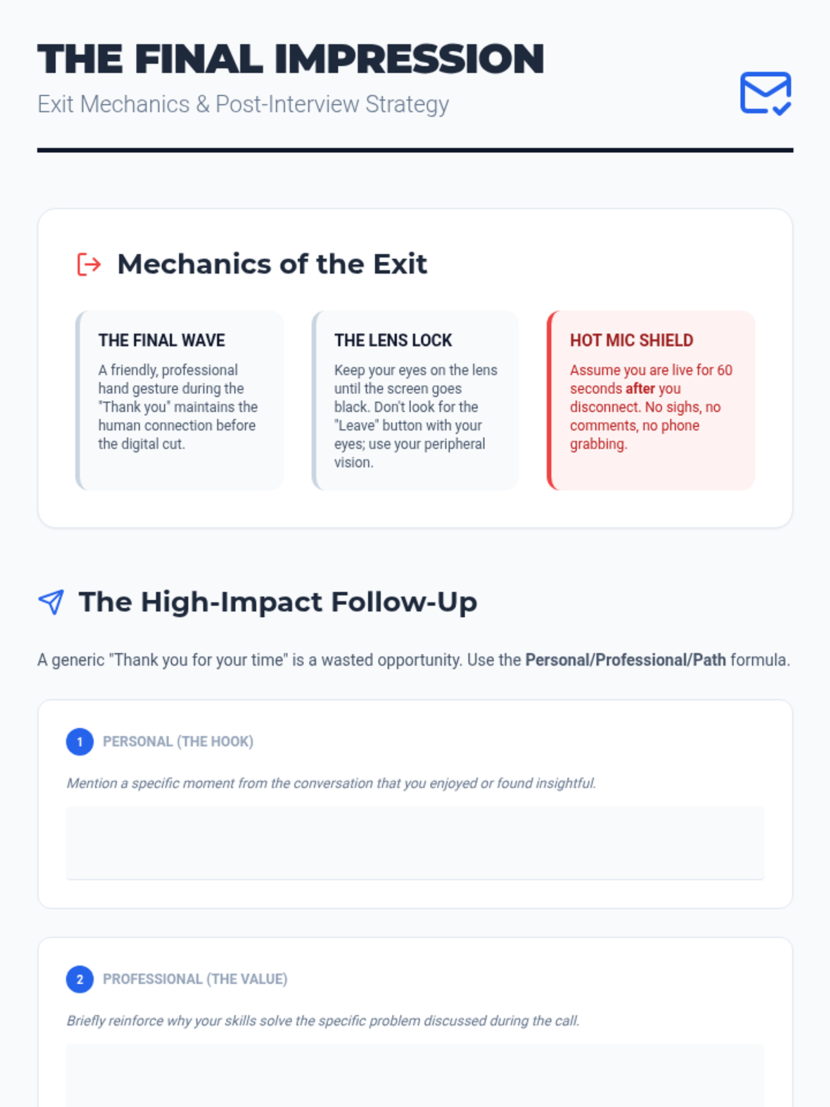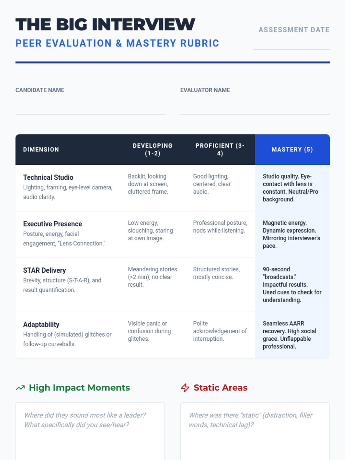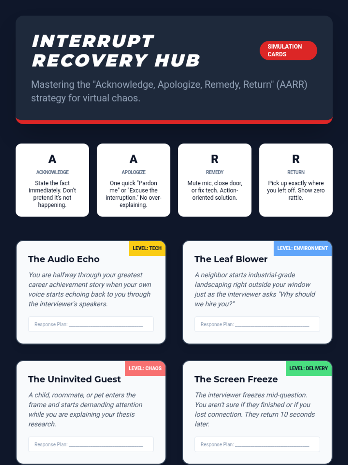 A comprehensive sequence for graduate students to synthesize technical setup, non-verbal communication, and behavioral performance into a professional virtual interview presence. Students move from pre-interview preparation to real-time delivery and post-interview follow-up.