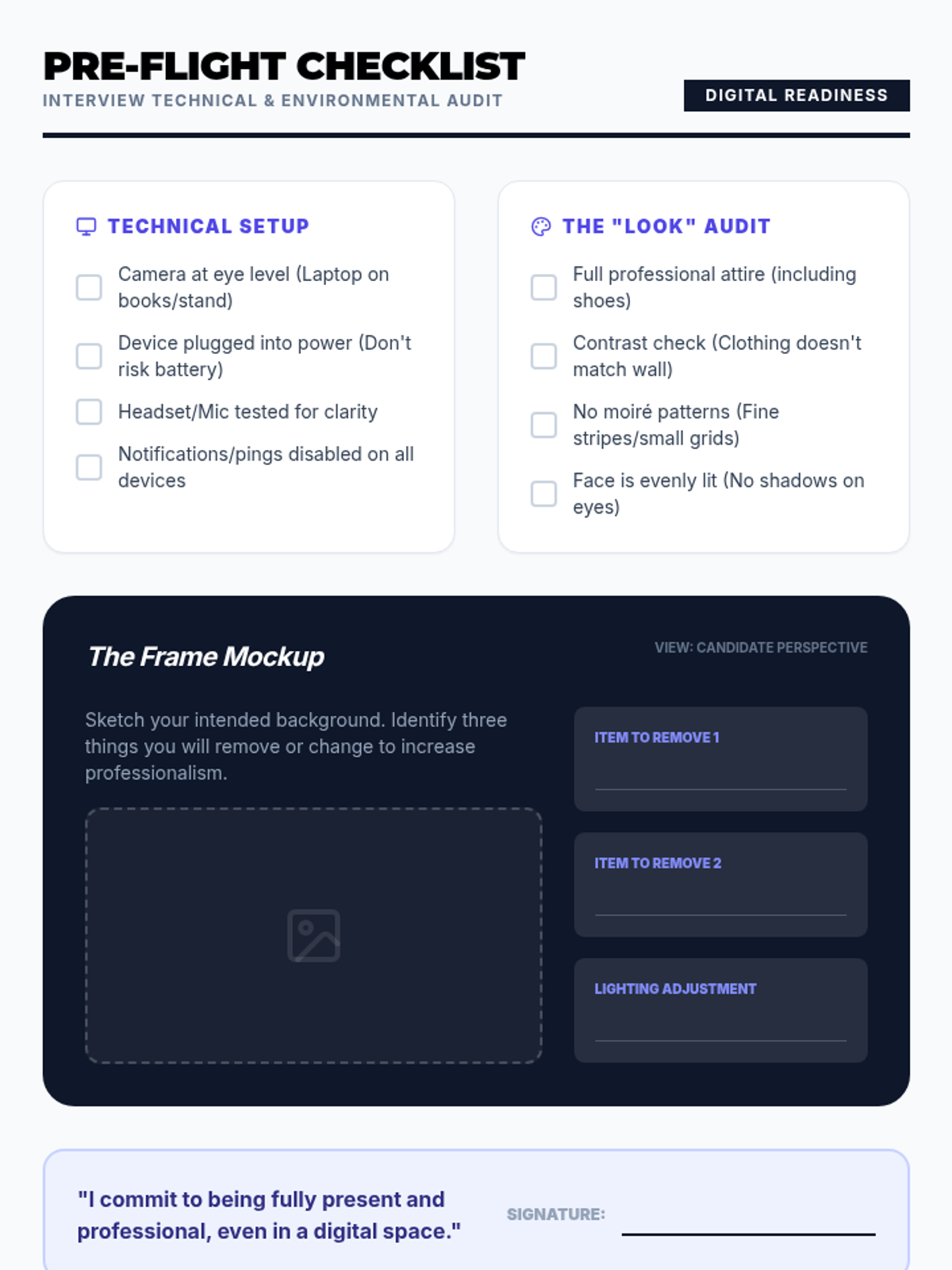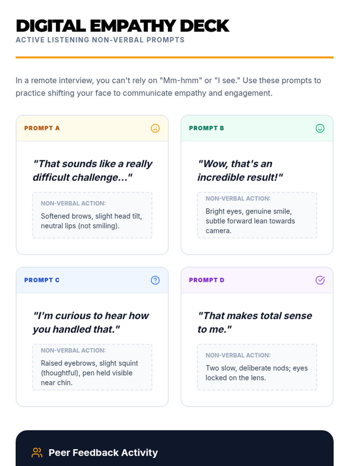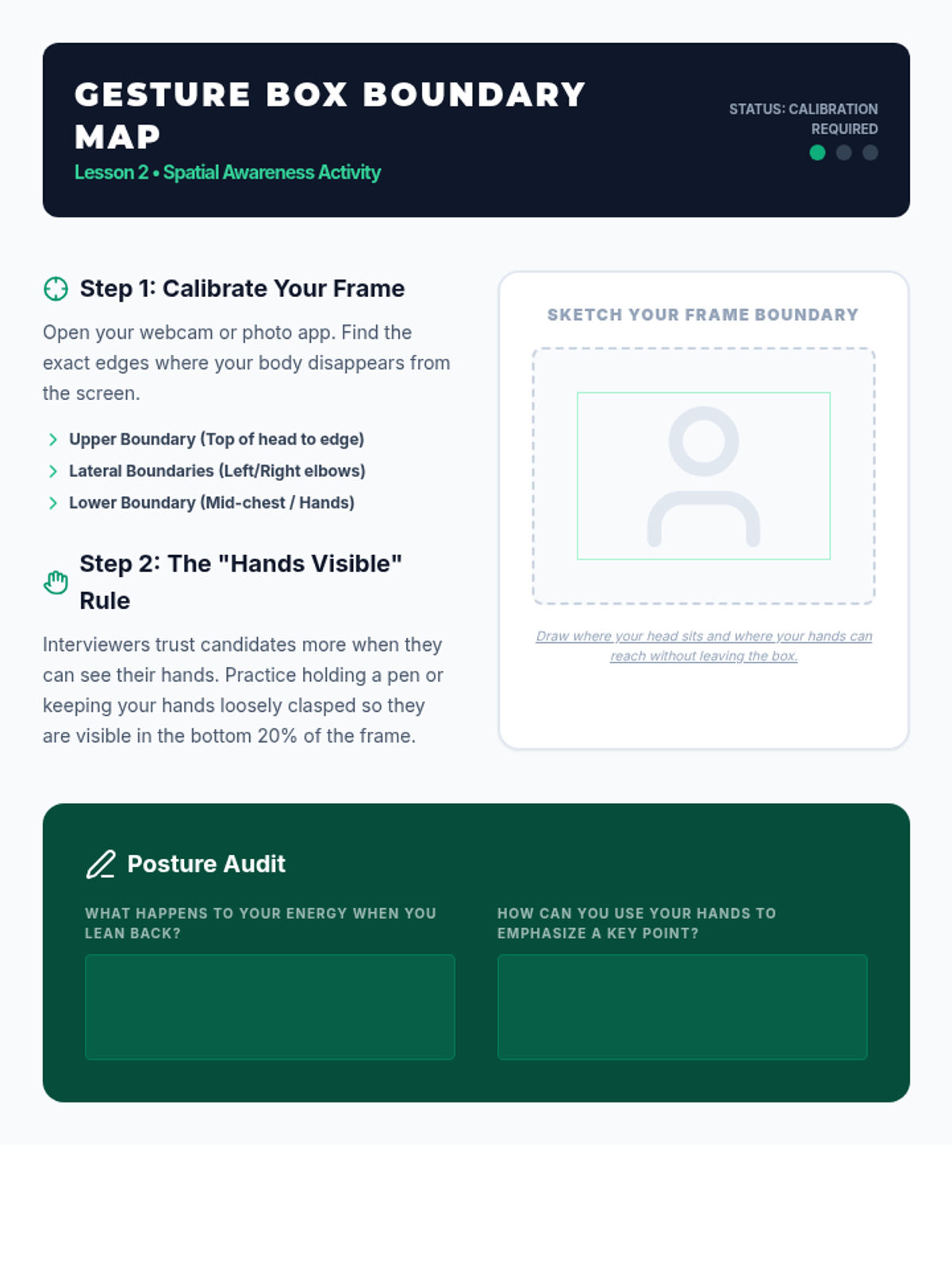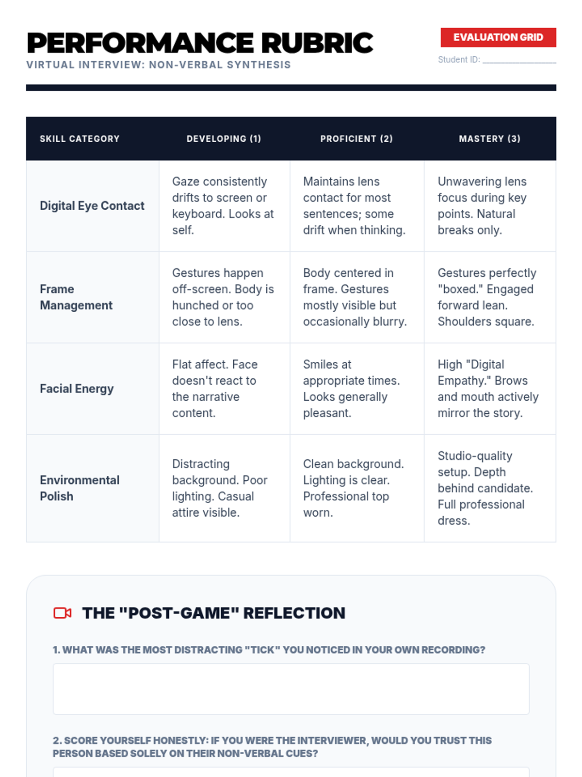 A comprehensive 12th-grade sequence focusing on the non-verbal nuances of virtual interviews, from digital eye contact to frame-aware gesturing and silent active listening.