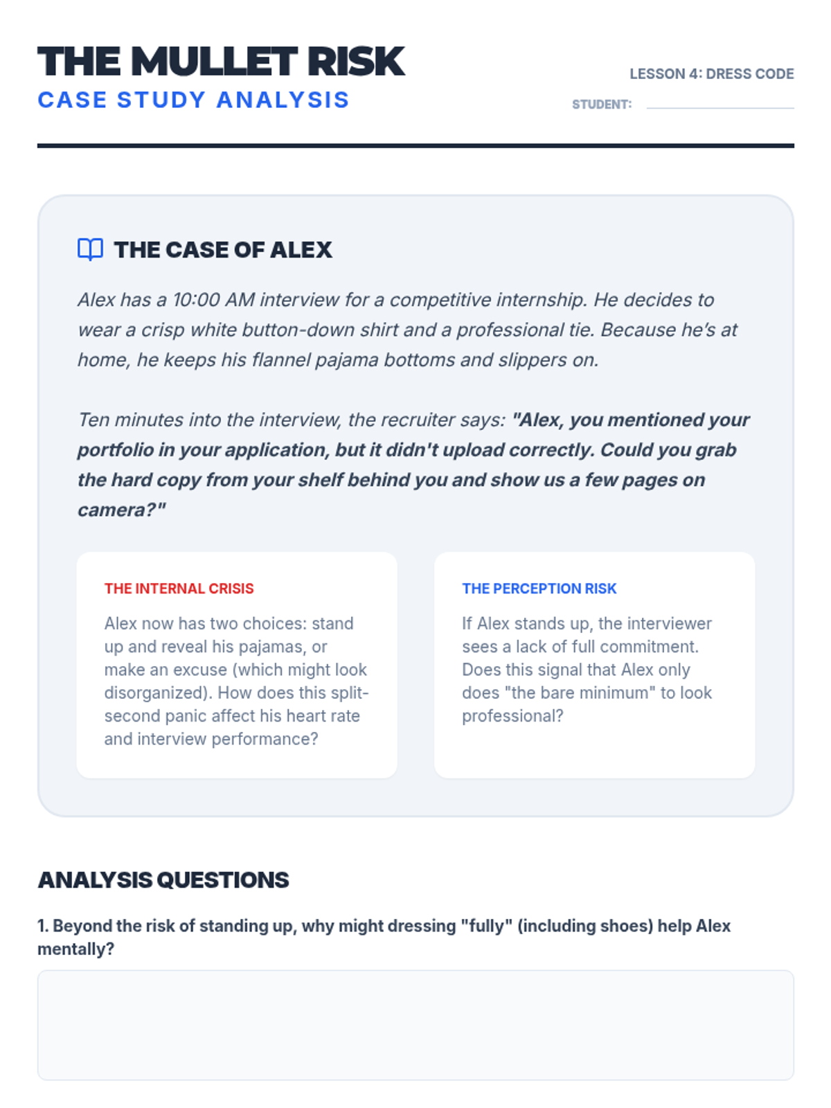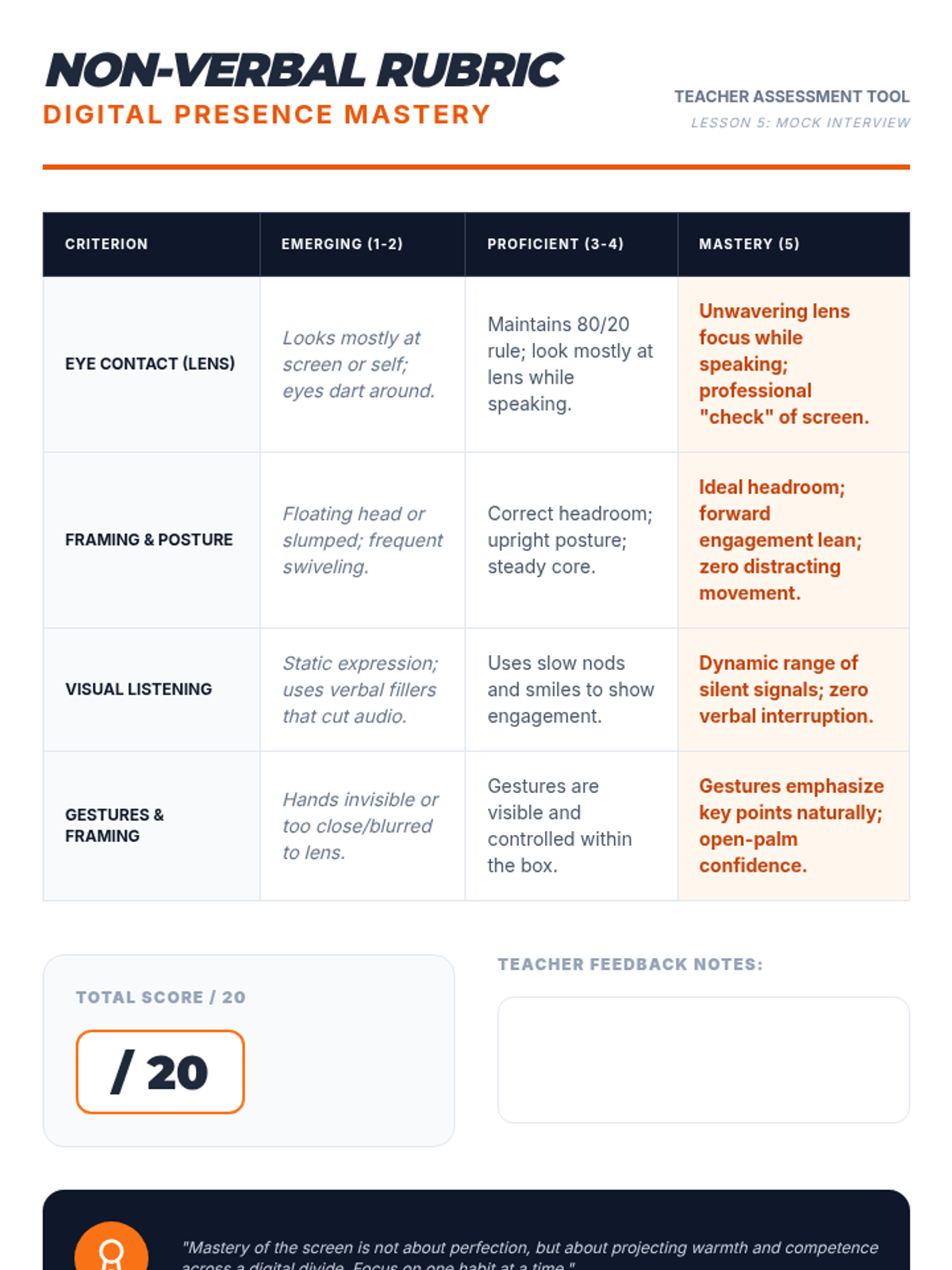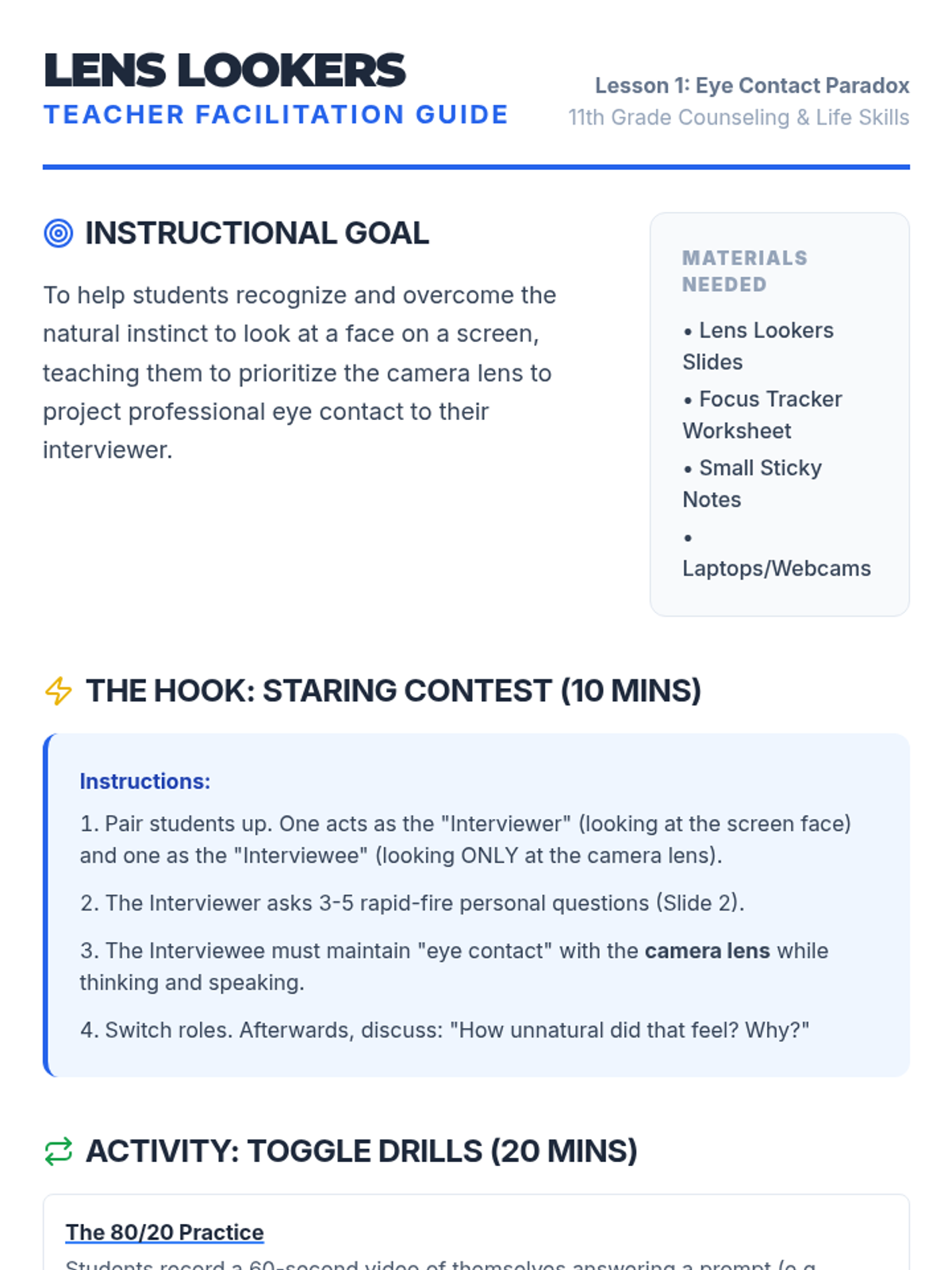 This sequence helps 11th-grade students master non-verbal communication in virtual interviews. It covers the 'eye contact paradox' of looking at the camera, managing digital body language within the video frame, using visual active listening to avoid audio interference, and selecting appropriate virtual attire.