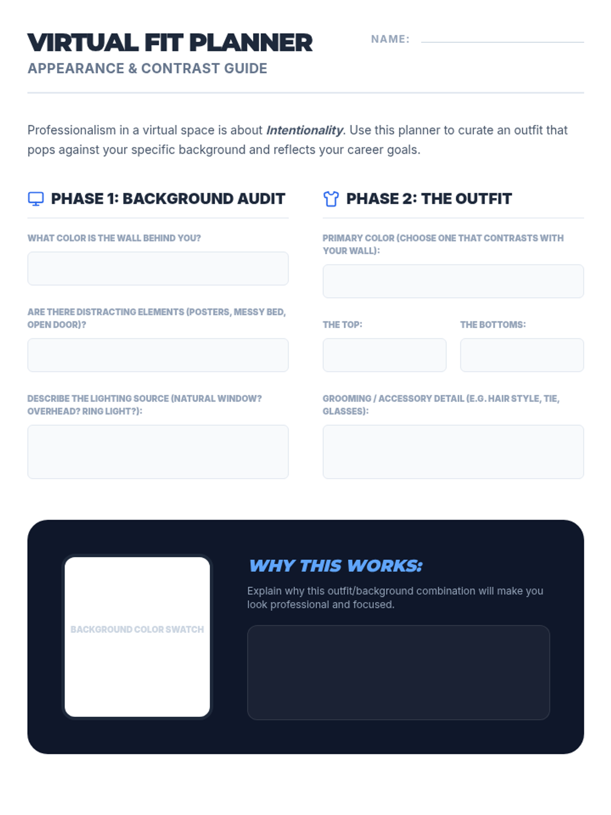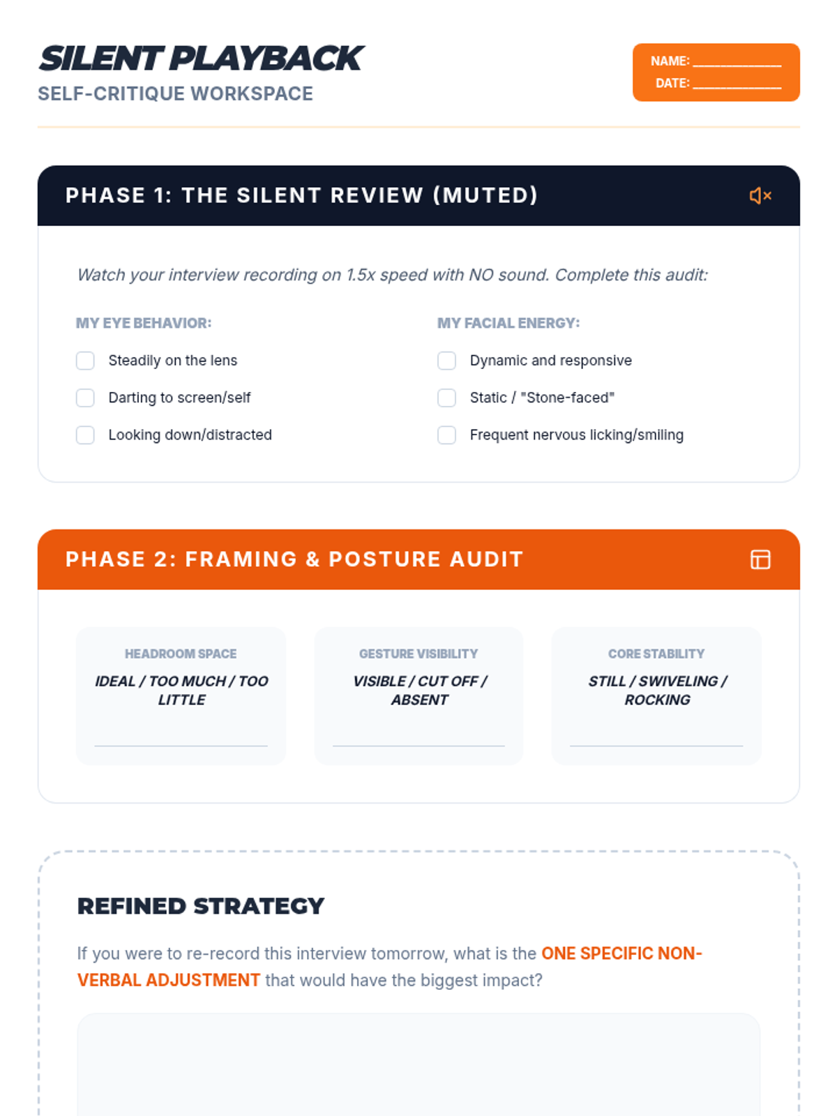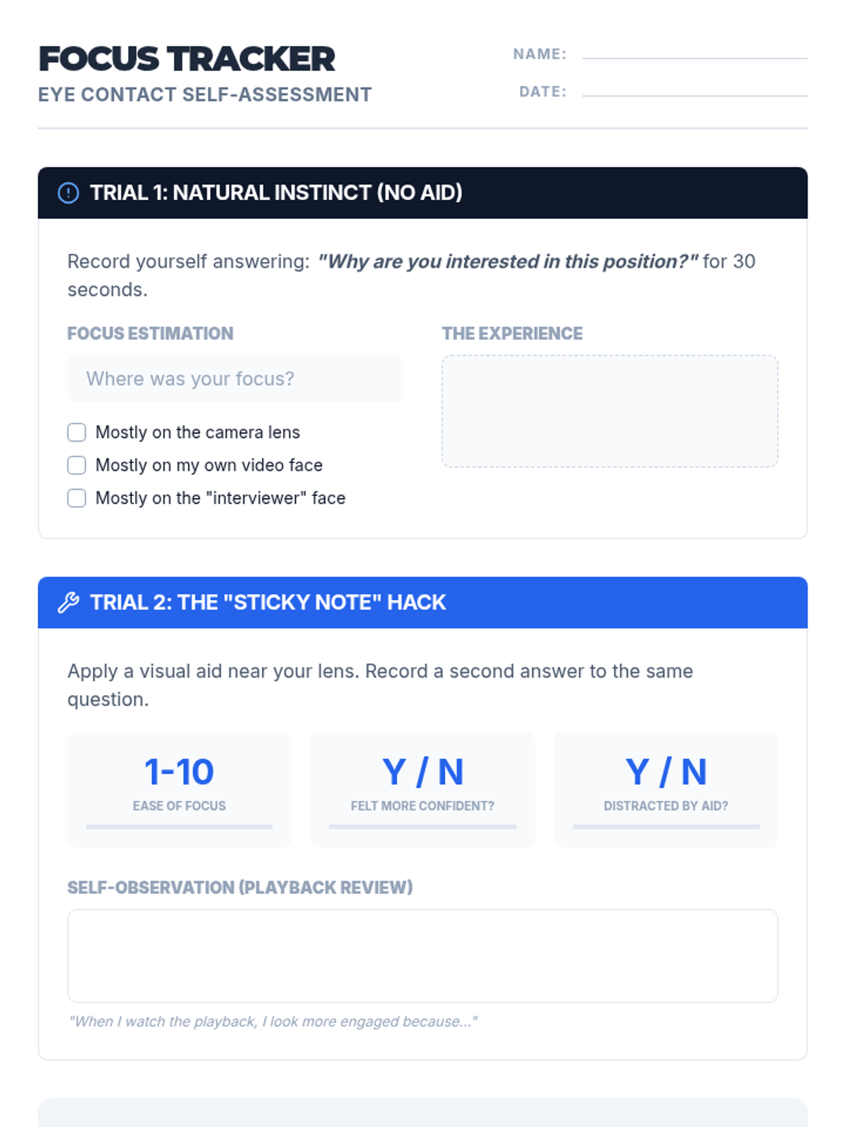 This sequence helps 11th-grade students master non-verbal communication in virtual interviews. It covers the 'eye contact paradox' of looking at the camera, managing digital body language within the video frame, using visual active listening to avoid audio interference, and selecting appropriate virtual attire.