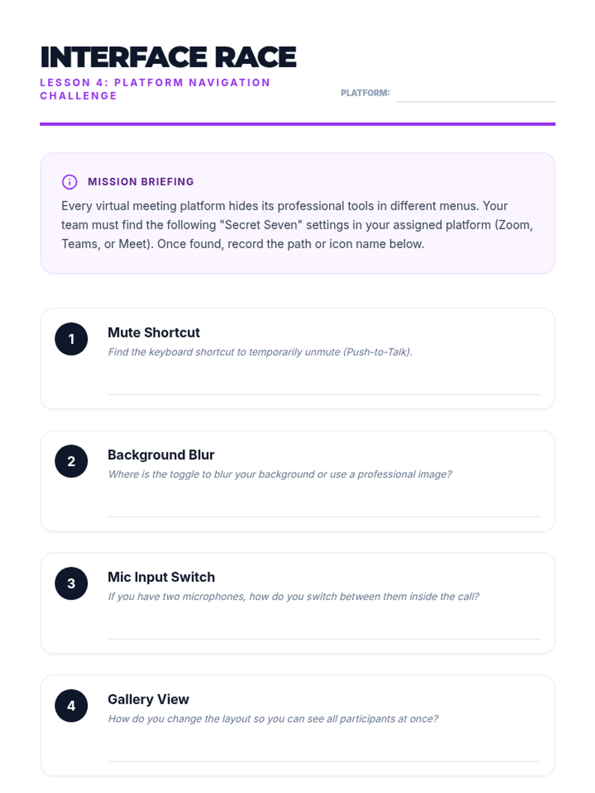 This sequence prepares 8th-grade students for professional virtual interactions by focusing on hardware, software, and environmental setup. Students will learn to configure cameras, microphones, and platforms to present a polished, professional image.