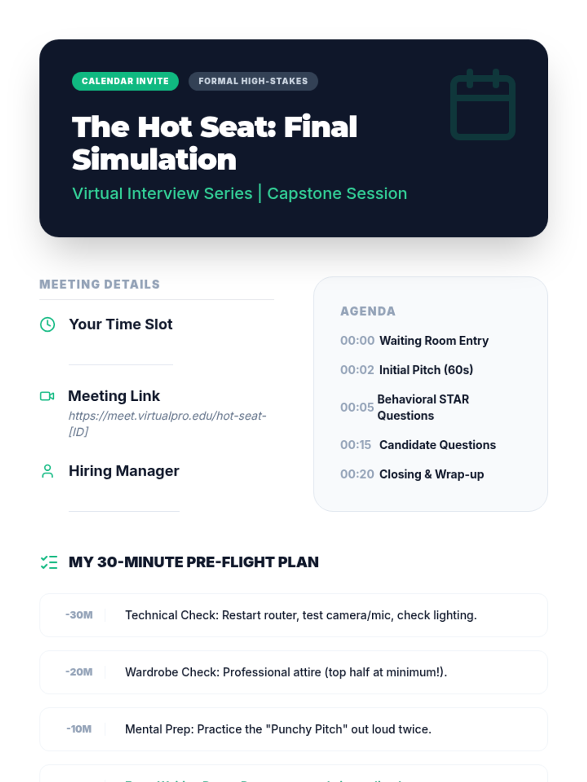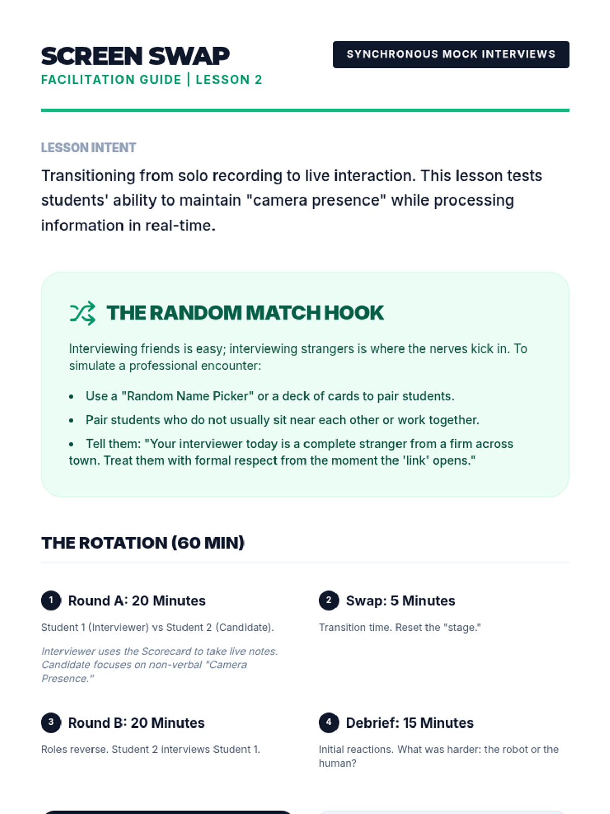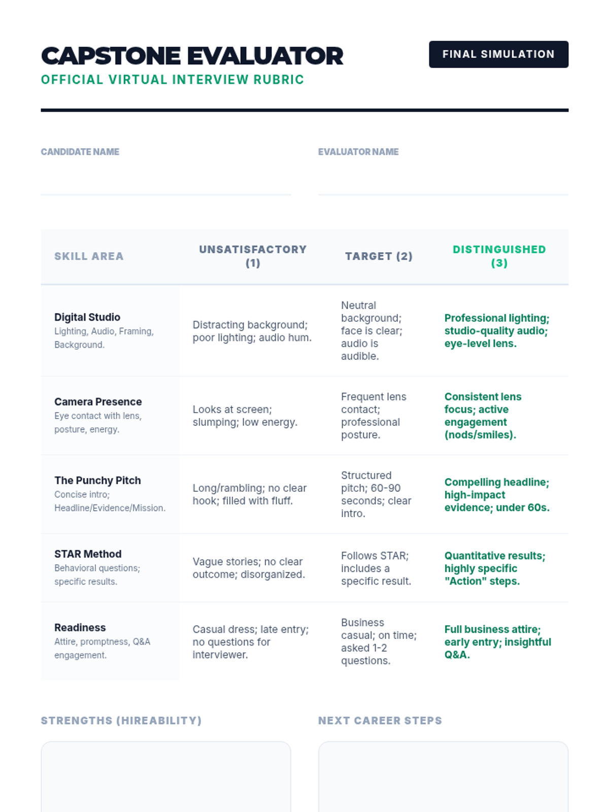 A comprehensive sequence for 10th graders to master virtual interviewing through asynchronous recordings, peer feedback loops, and a high-stakes capstone simulation. Students develop technical setup proficiency, non-verbal communication, and concise verbal pitching.