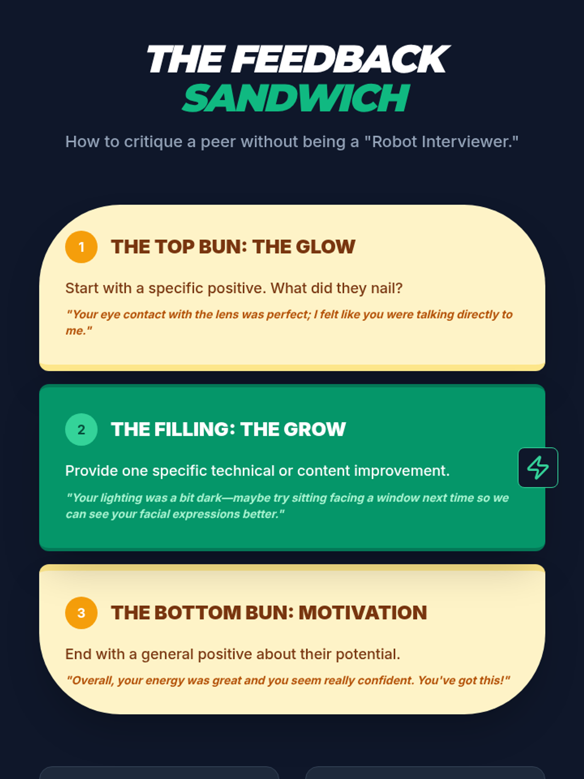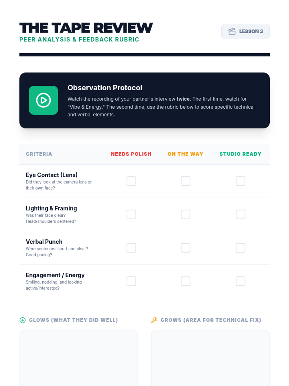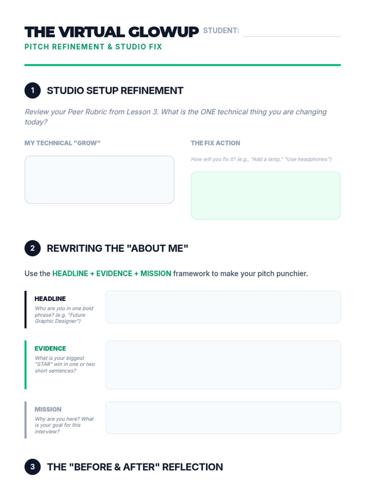 A comprehensive sequence for 10th graders to master virtual interviewing through asynchronous recordings, peer feedback loops, and a high-stakes capstone simulation. Students develop technical setup proficiency, non-verbal communication, and concise verbal pitching.