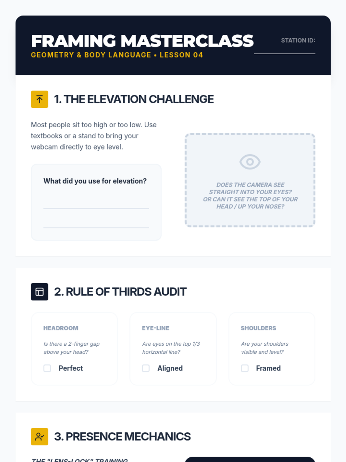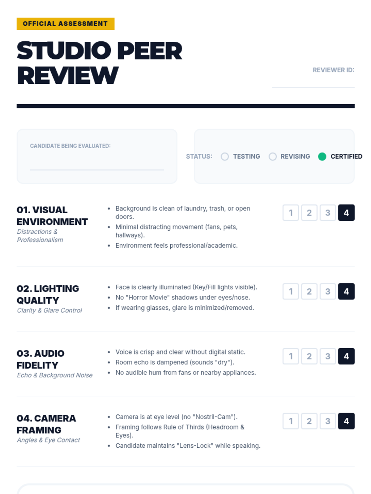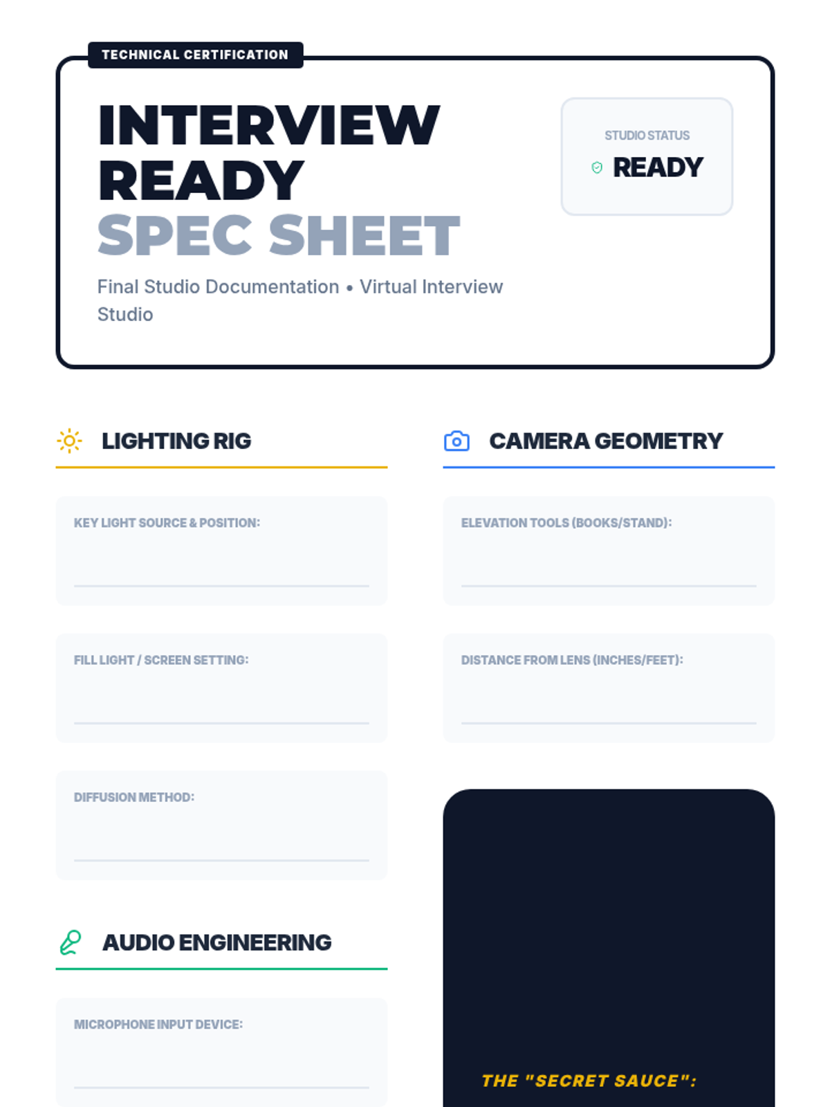 A comprehensive workshop-style sequence for 11th-grade students to master the technical aspects of virtual interviews. Students transform their personal spaces into professional broadcast environments by focusing on background auditing, lighting physics, audio engineering, and camera framing.