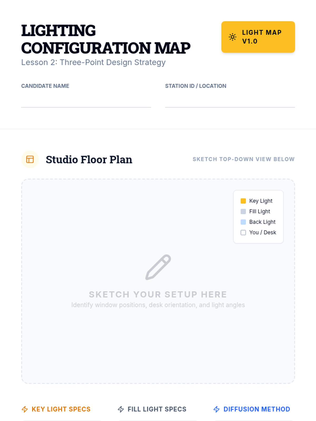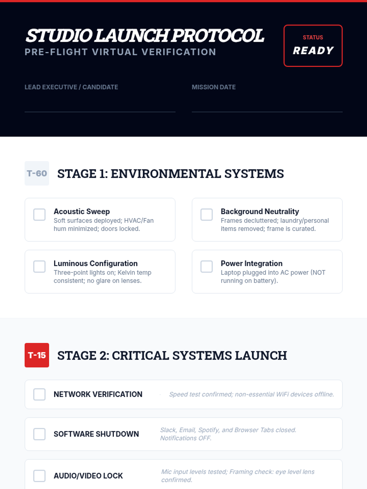 This graduate-level sequence treats the virtual interview space as a professional production set. Students will master acoustics, lighting physics, camera framing, and visual rhetoric to engineer a high-stakes professional presence.
