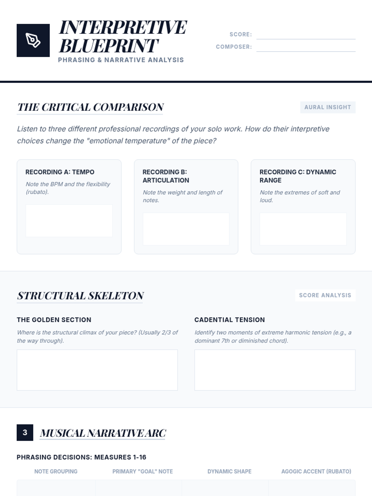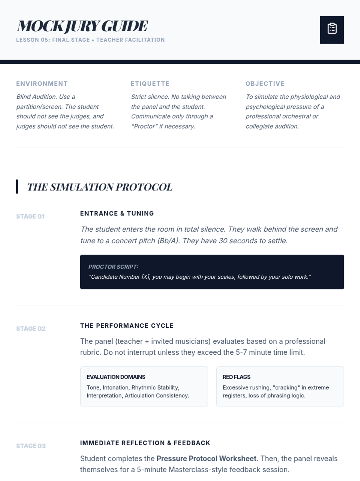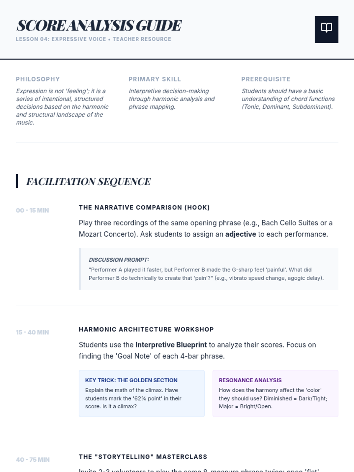 A comprehensive 5-lesson sequence designed for advanced high school musicians to bridge the gap between technical mechanics and expressive artistry. Students engage in self-diagnostic analysis, master technical strategies for tone and velocity, and conclude with a professional-style mock audition.