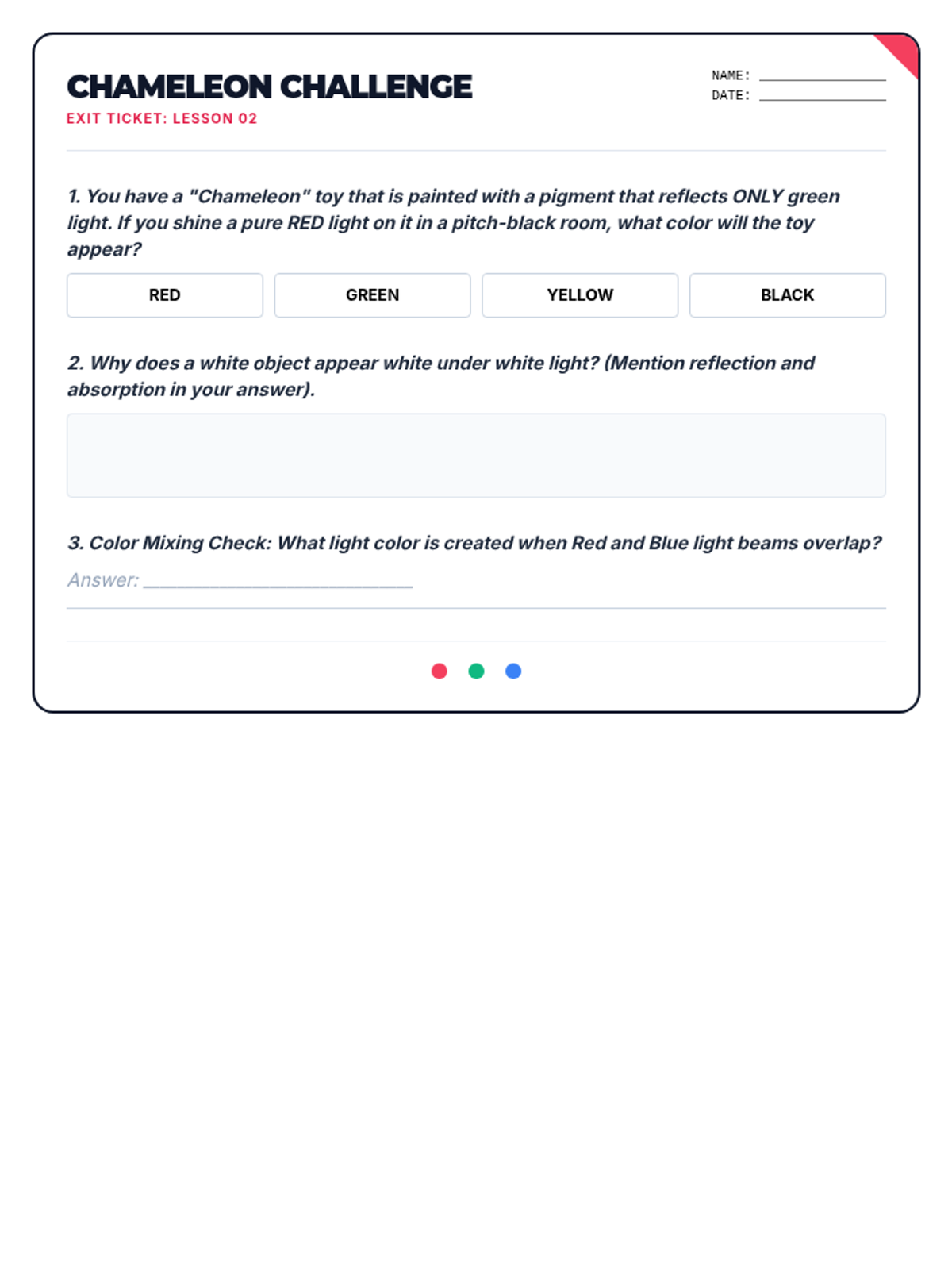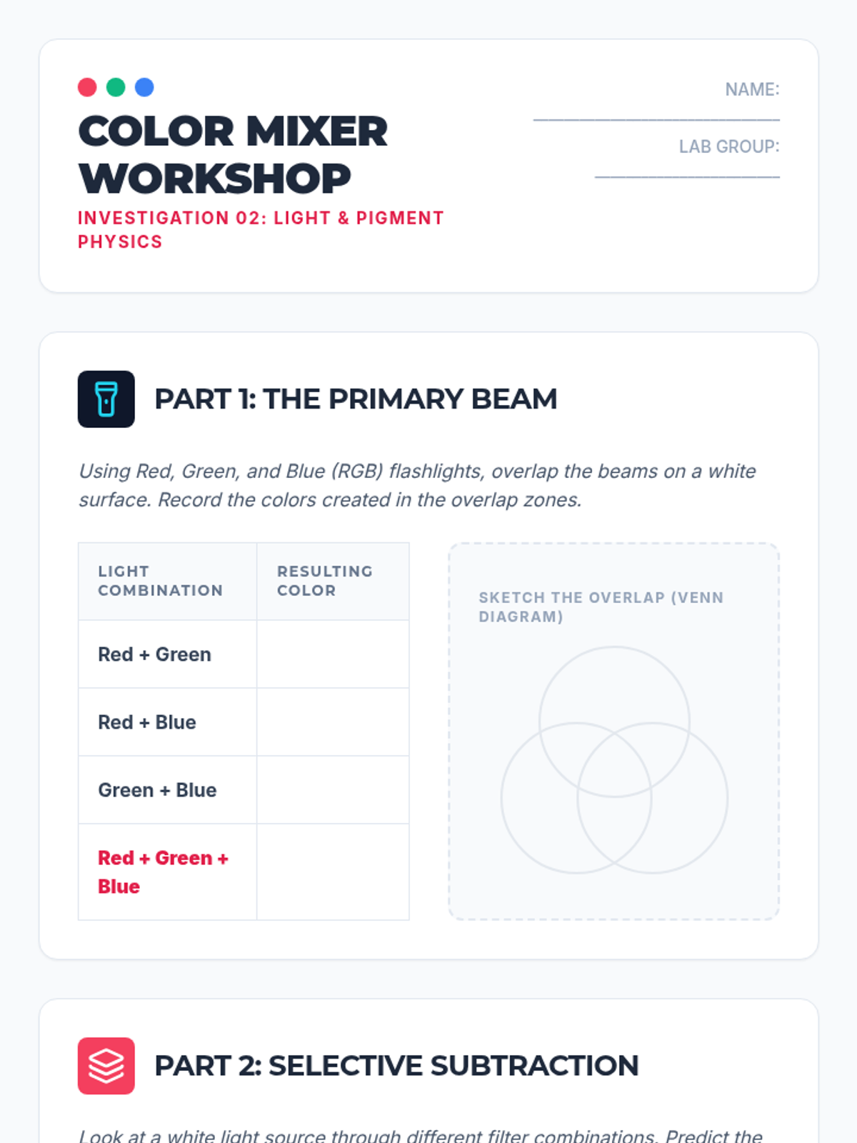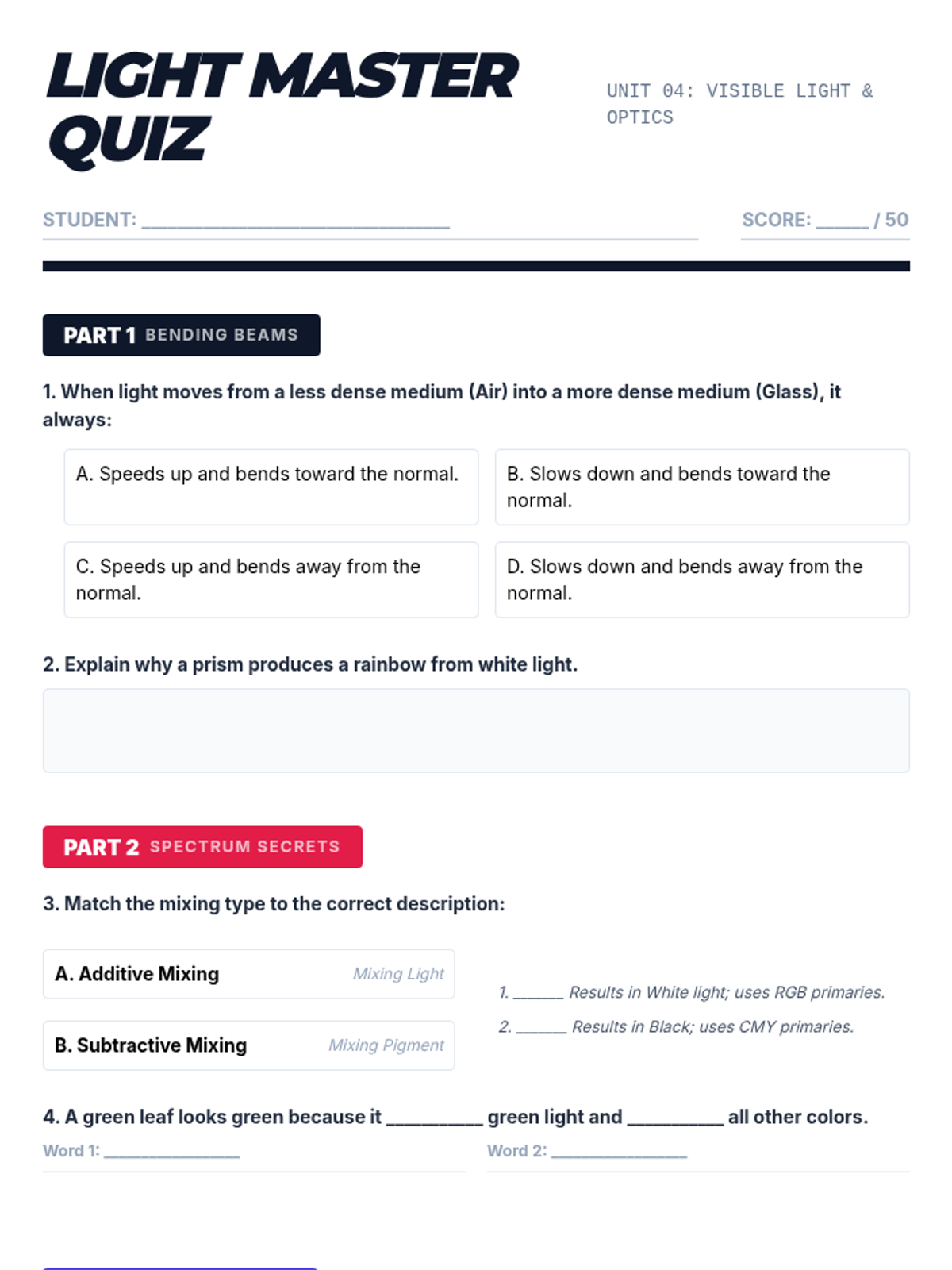 An inquiry-driven physics sequence exploring visible light, refraction, color theory, spectroscopy, and optics. Students investigate how light interacts with matter and how these interactions shape our perception of reality.