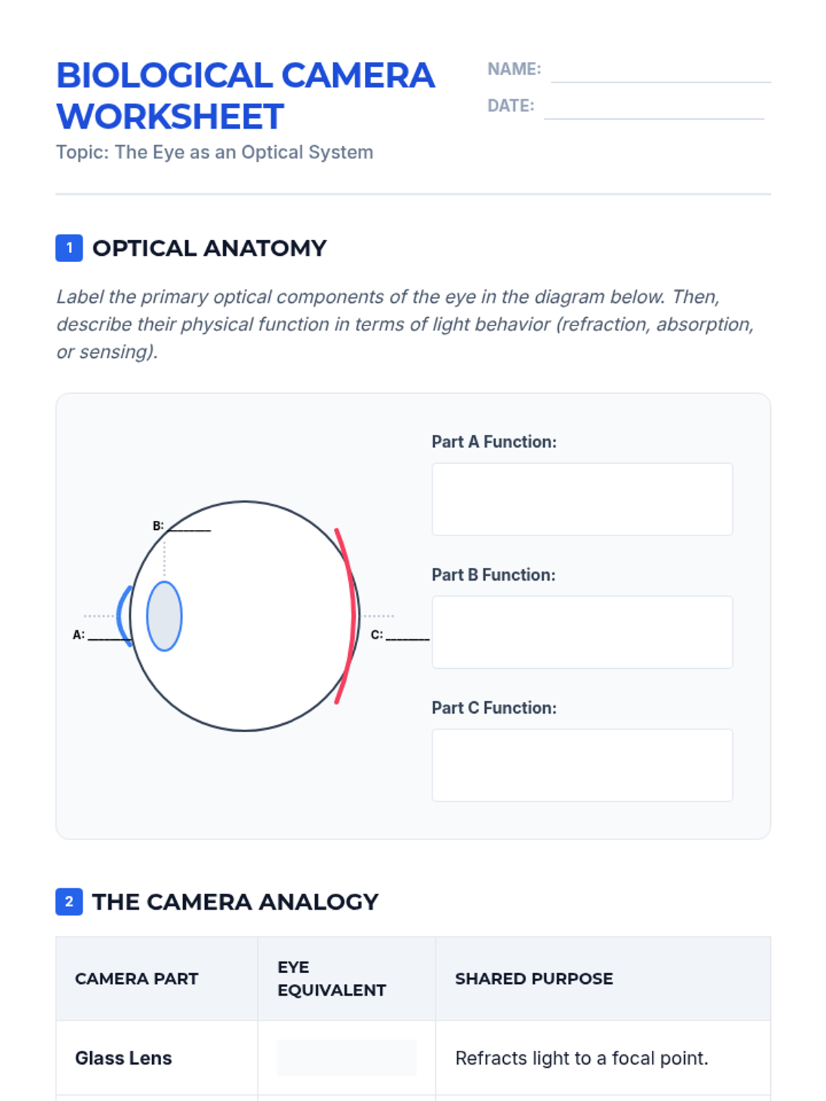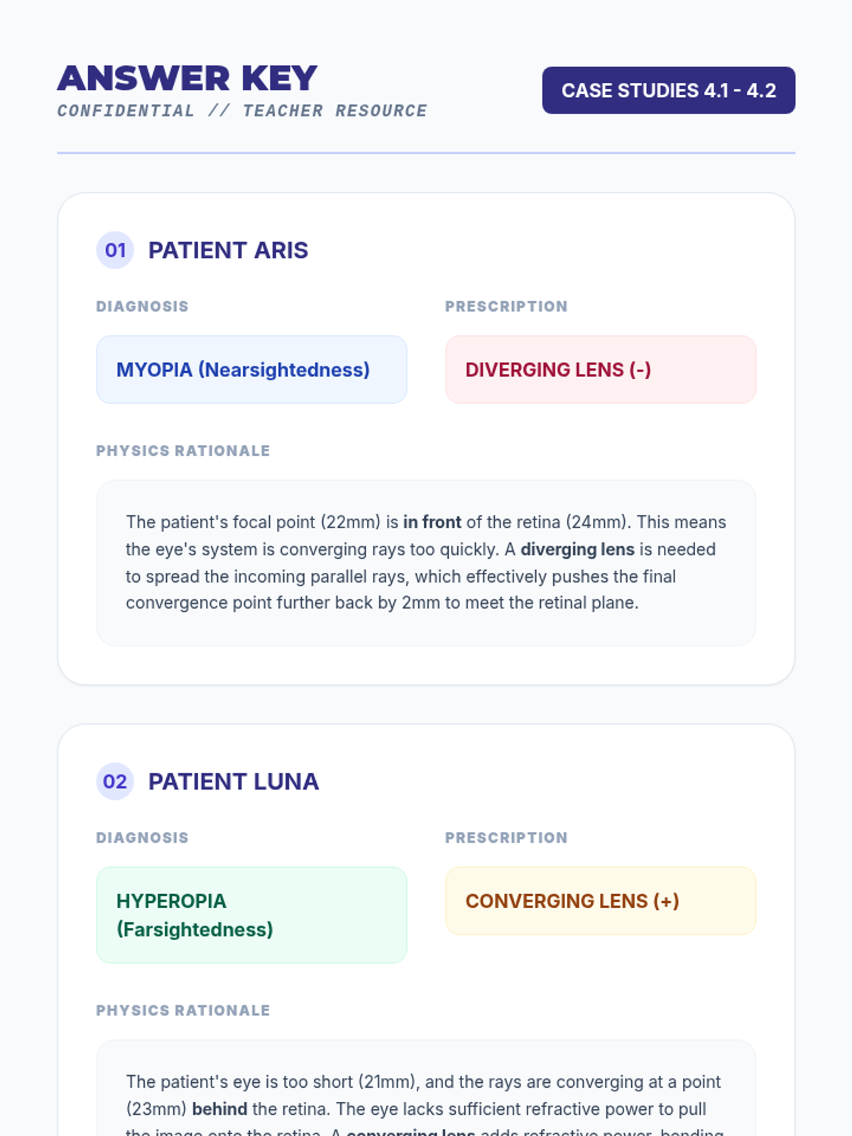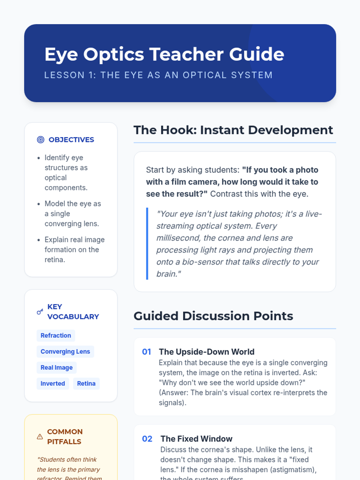 A comprehensive 9th-grade physics sequence exploring the human eye as an optical system. Students investigate refraction, accommodation, and vision defects, culminating in the application of corrective lenses and a look at modern laser surgery.