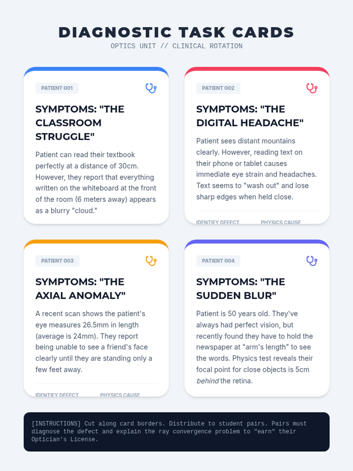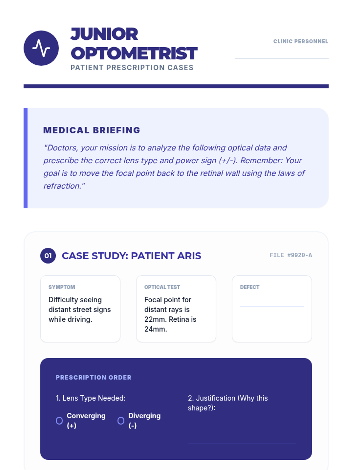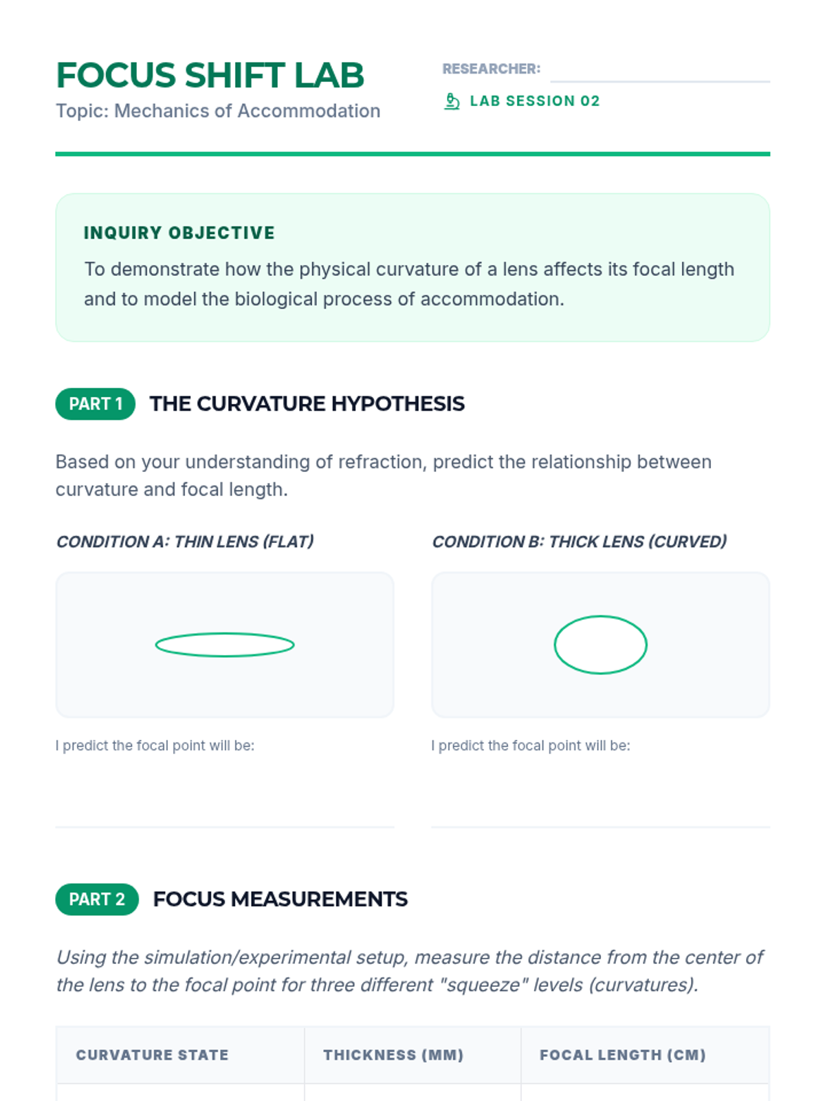 A comprehensive 9th-grade physics sequence exploring the human eye as an optical system. Students investigate refraction, accommodation, and vision defects, culminating in the application of corrective lenses and a look at modern laser surgery.