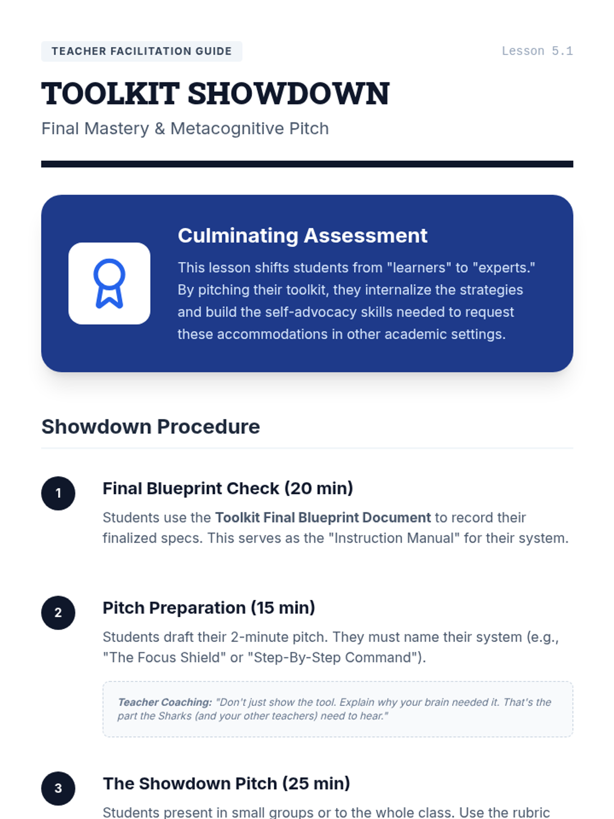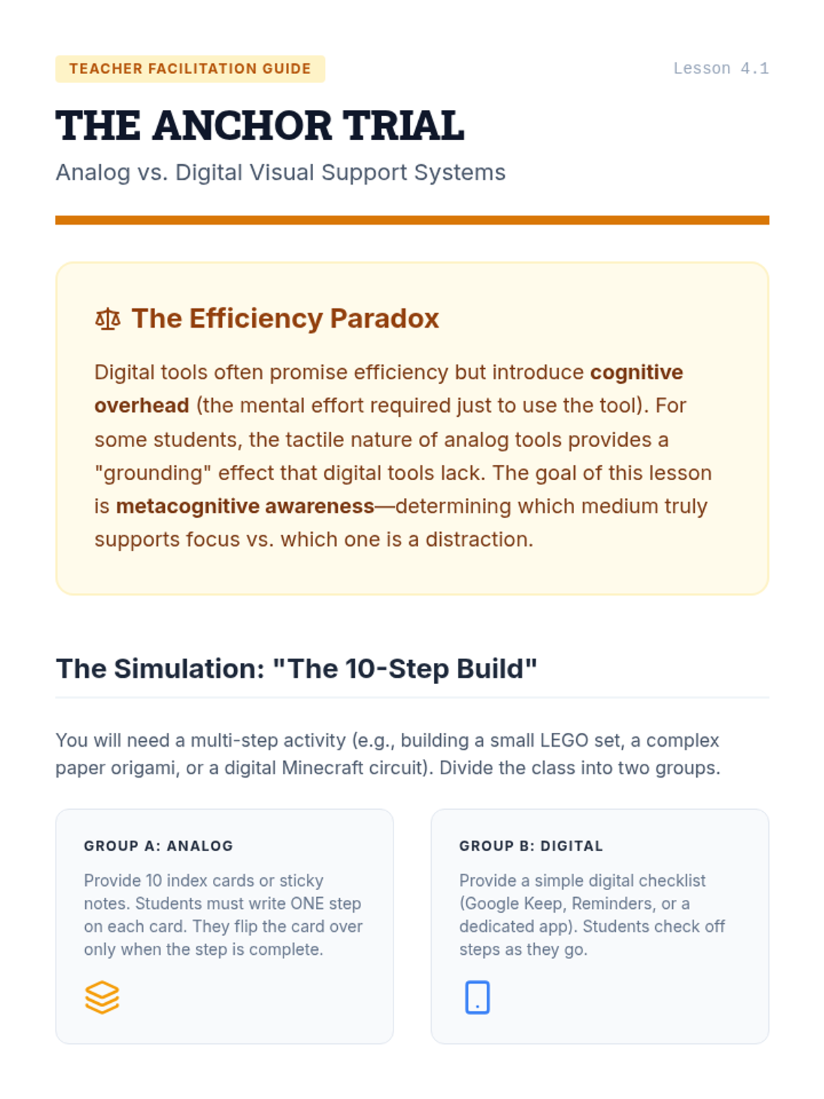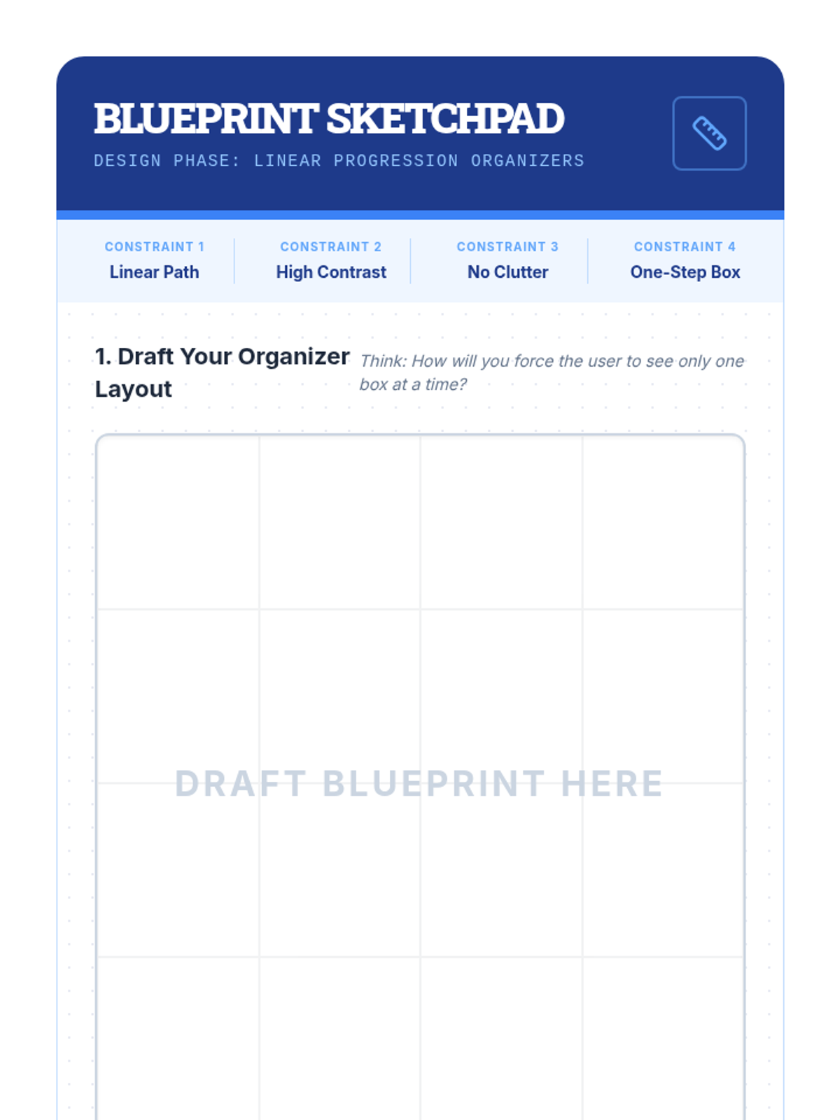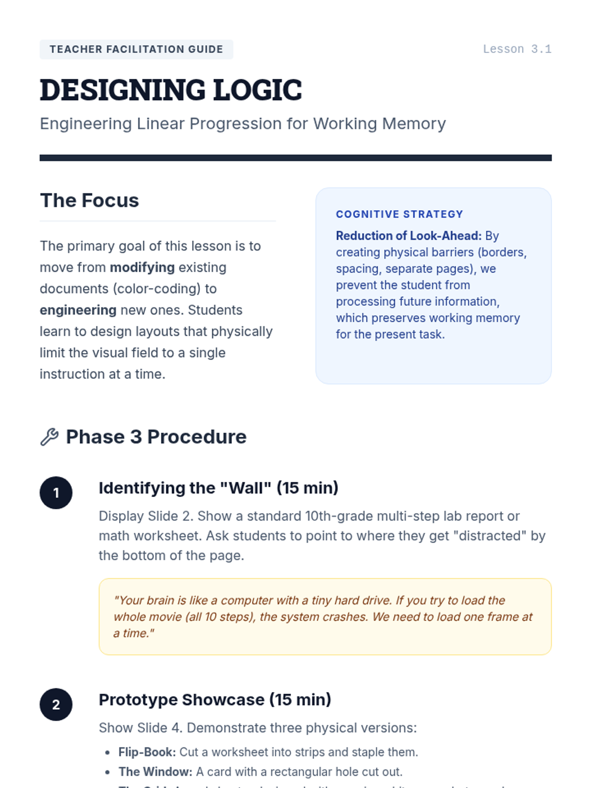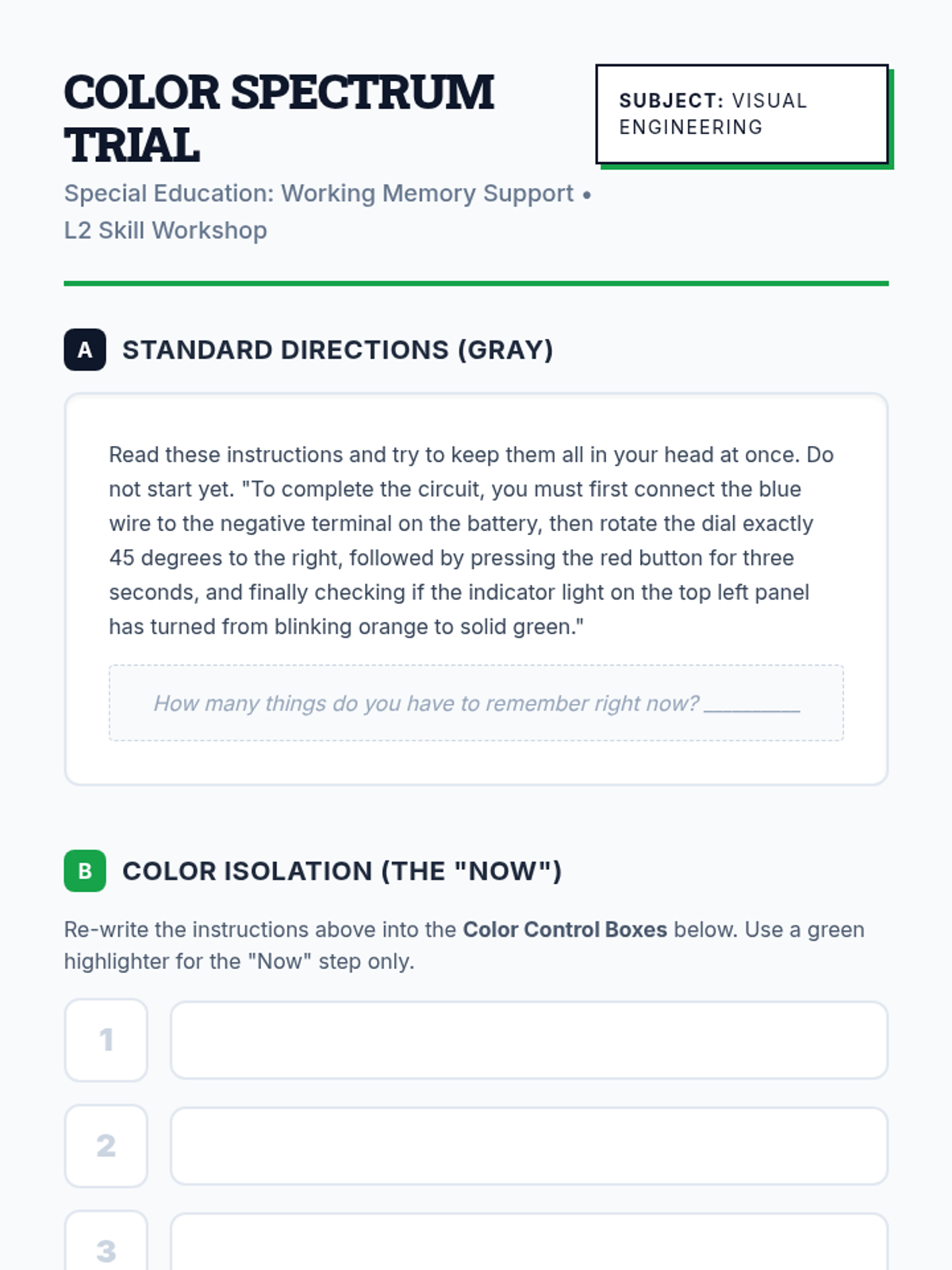 A project-based sequence for 10th-grade students to create external memory aids and visual anchors that compensate for working memory limitations. Students explore visual processing, color-coding, and linear design to build a personalized 'Visual Toolkit' for managing single-step directions.