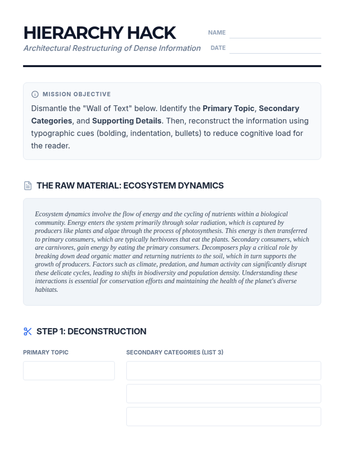 This workshop-style sequence for graduate students focuses on the practical application of visual encoding and hierarchical organization strategies to support learners with working memory challenges. Participants will learn to use typographic cues, color-coding, symbolic shorthand, and visual mapping to enhance information synthesis and retention.