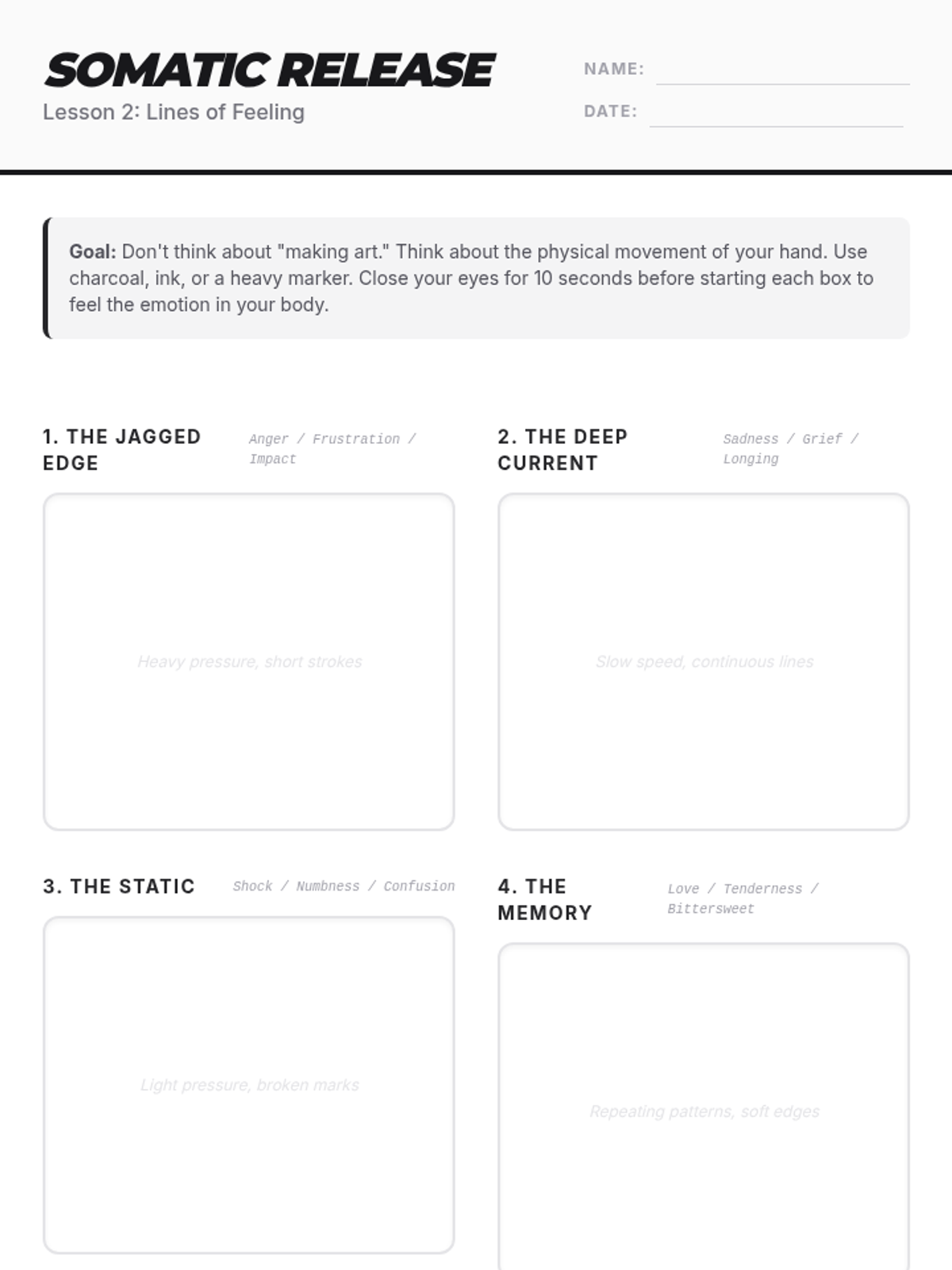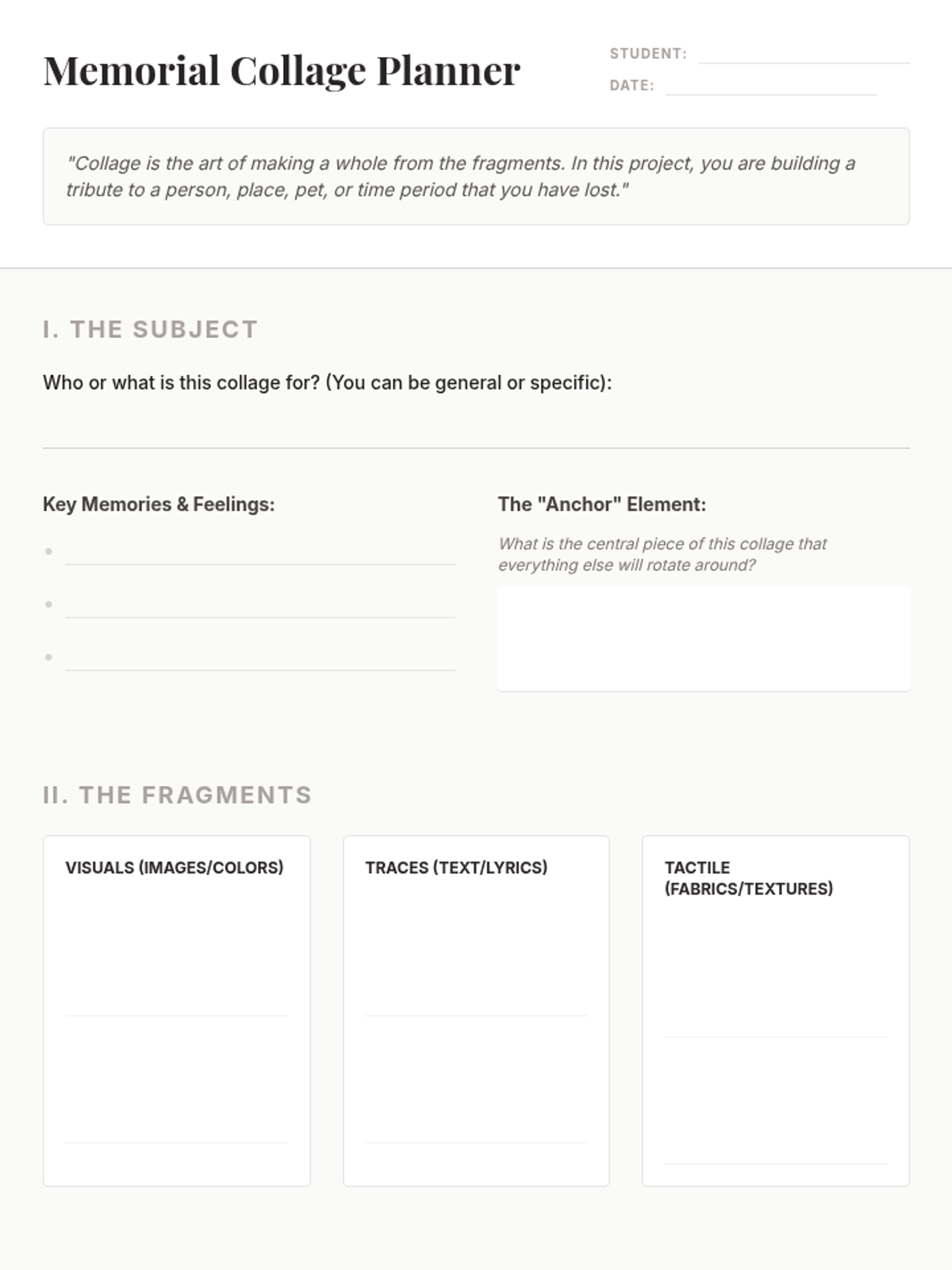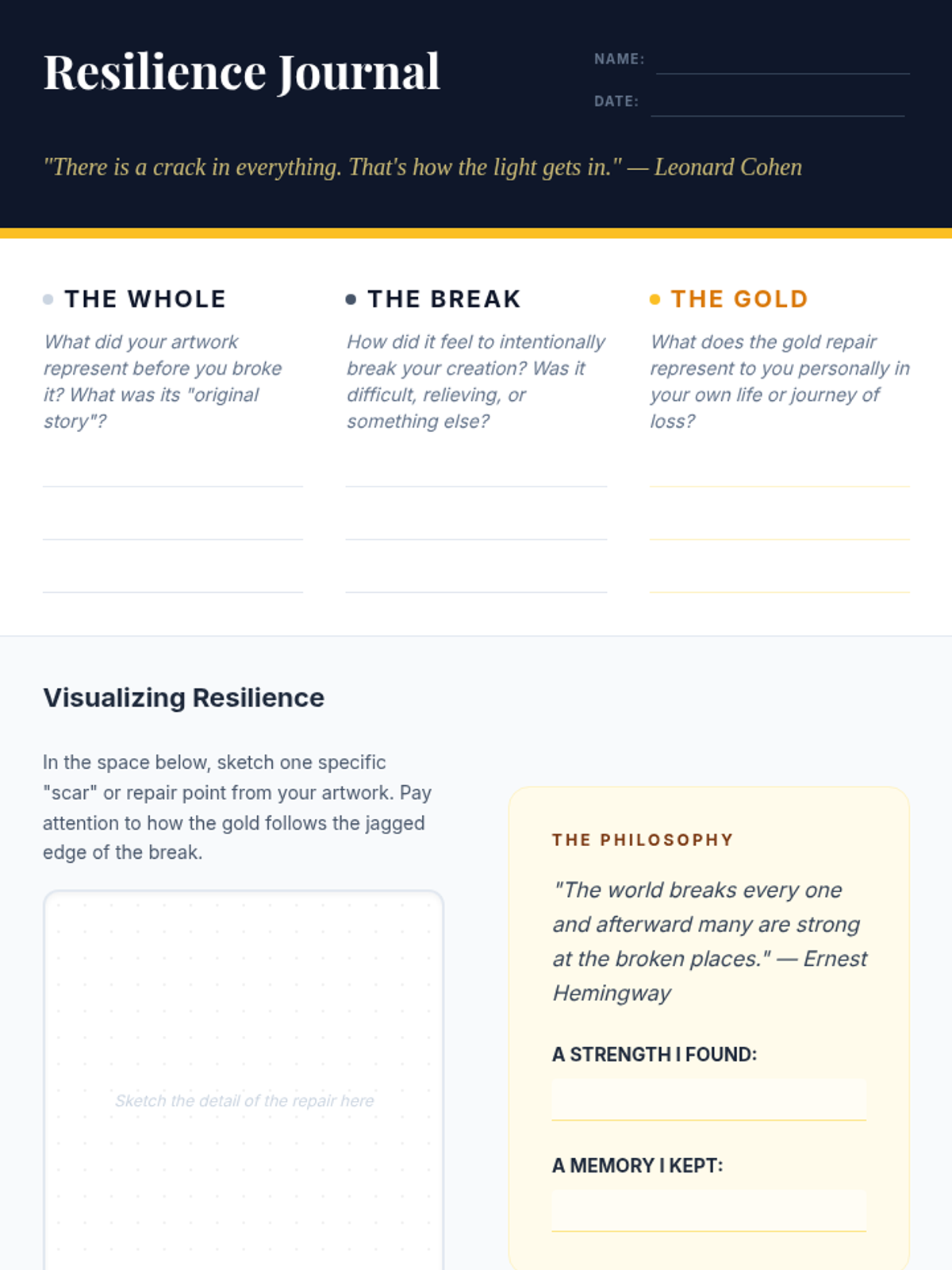 A visual arts-based sequence for 9th graders to externalize grief and complex emotions. Using color theory, abstract line work, collage, and the metaphor of Kintsugi, students build a toolkit for emotional regulation and empathy.