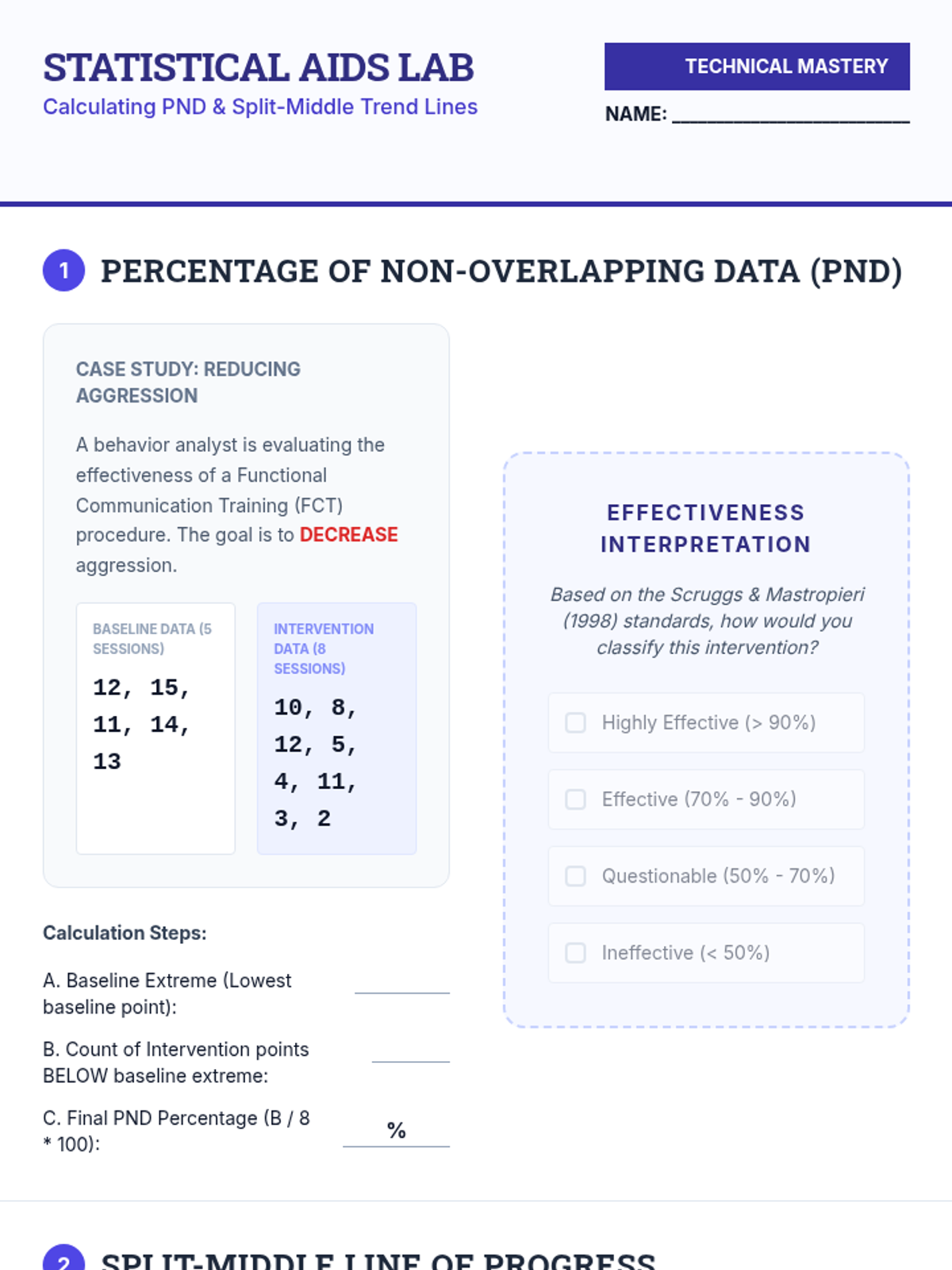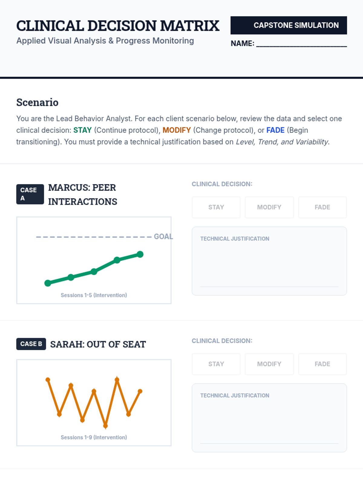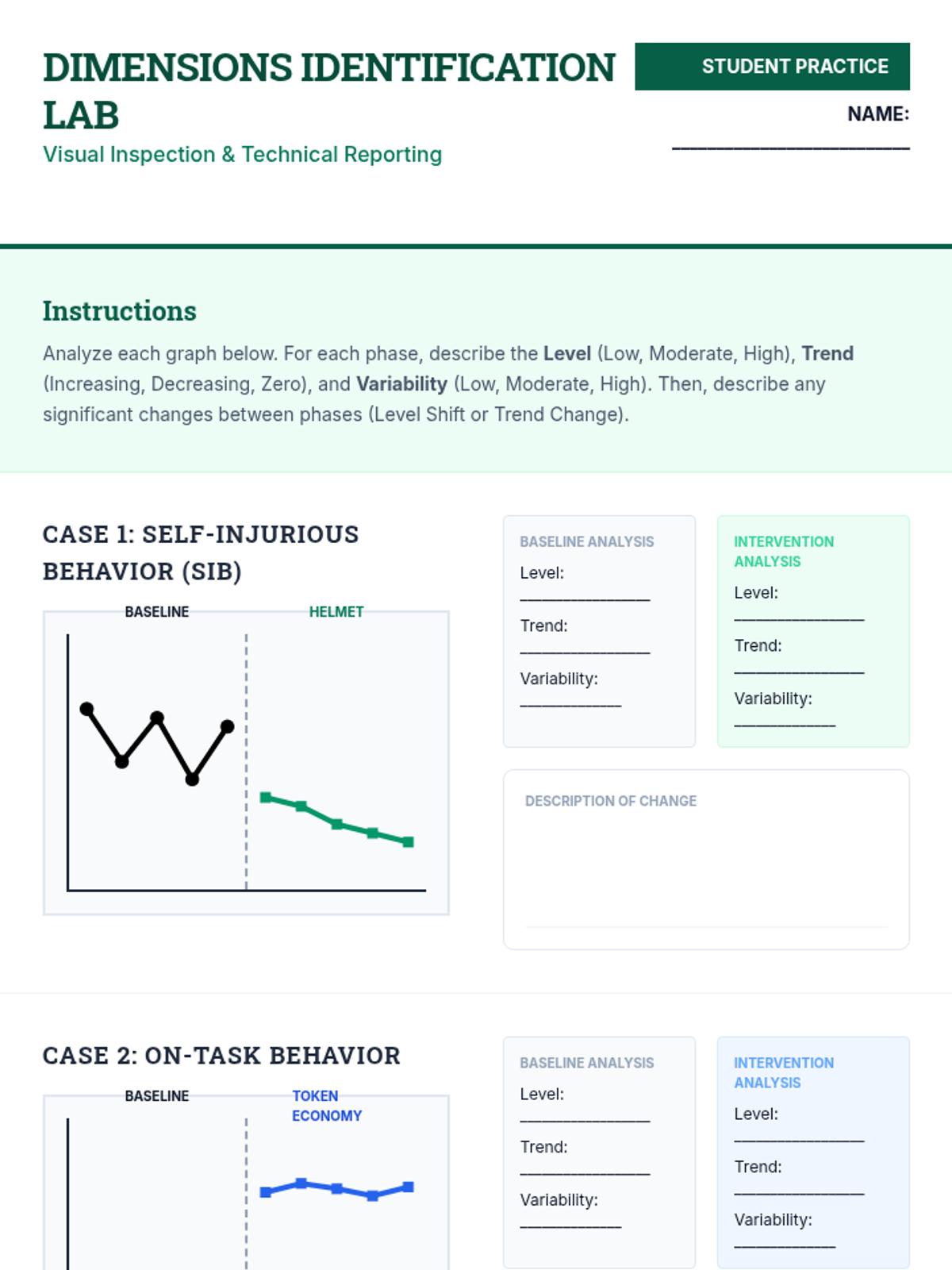 A comprehensive graduate-level sequence on the visual analysis of behavioral data, covering graph construction, interpretive dimensions (level, trend, variability), statistical aids, and experimental design logic. Students learn to make evidence-based clinical decisions through rigorous data interpretation.