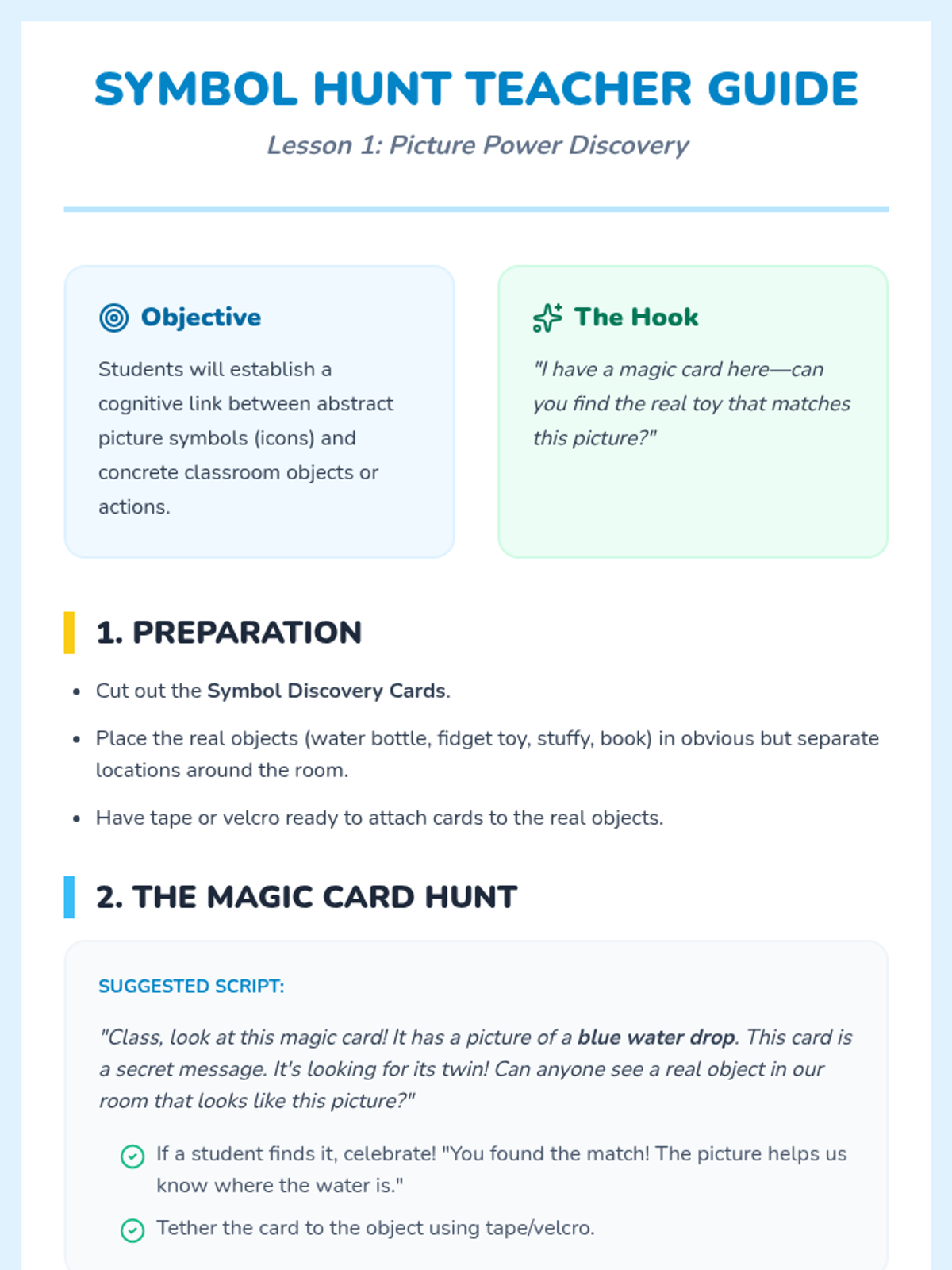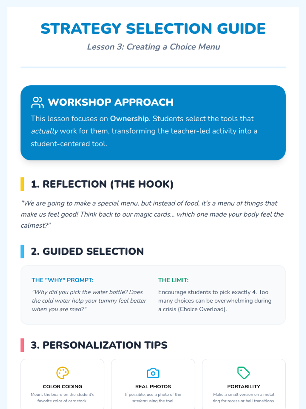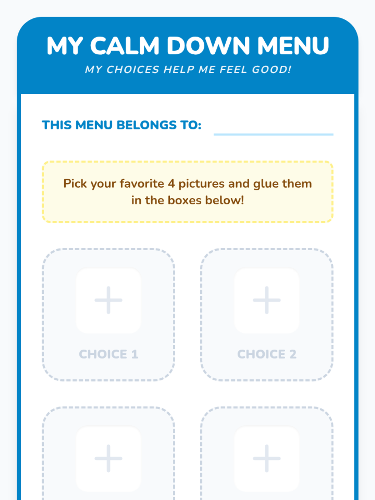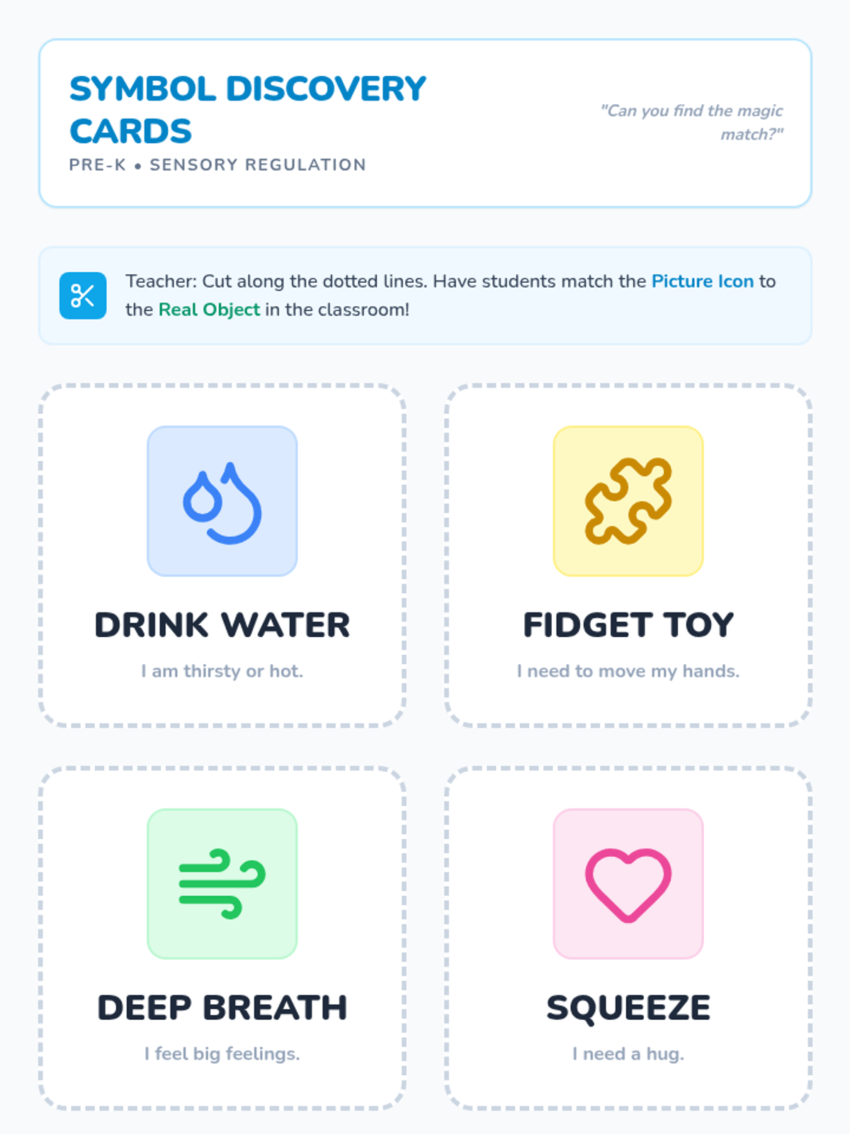 A Pre-K sequence focused on teaching students how to use visual symbols and choice boards to regulate their emotions and select calming strategies. Students progress from basic symbol recognition to creating and practicing with their own personalized 'Calming Plan' visuals.