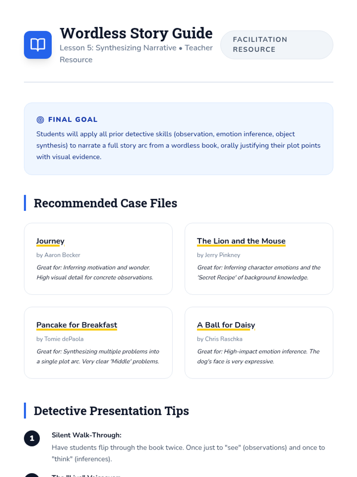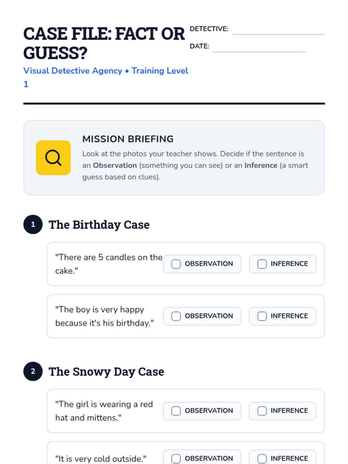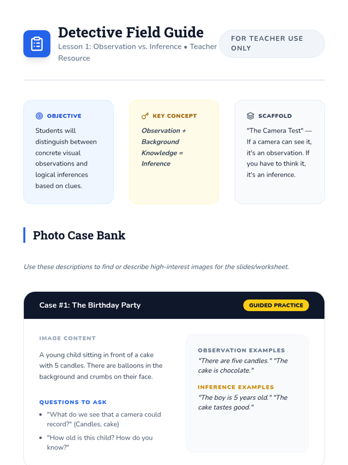 A scaffolded sequence for 2nd-grade students needing academic support, focusing on building inference skills through visual stimuli before transitioning to text-based predictions. Students act as 'Visual Detectives' to bridge concrete observations with abstract conclusions.