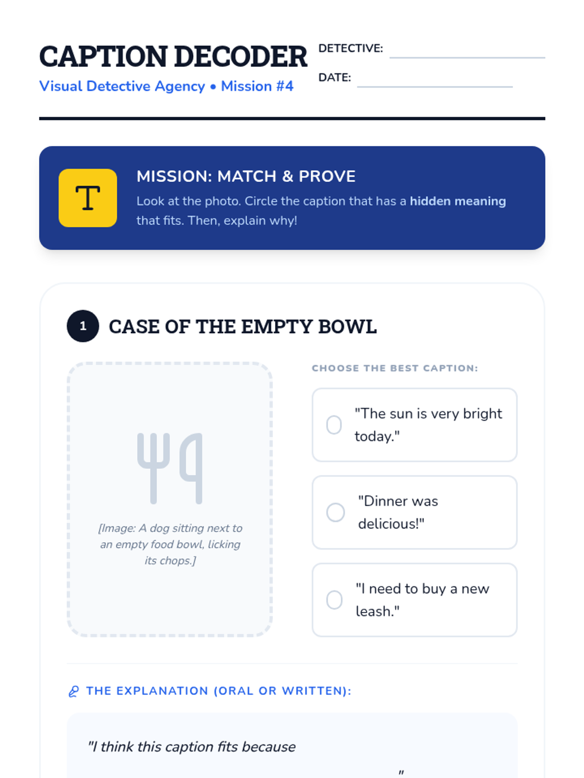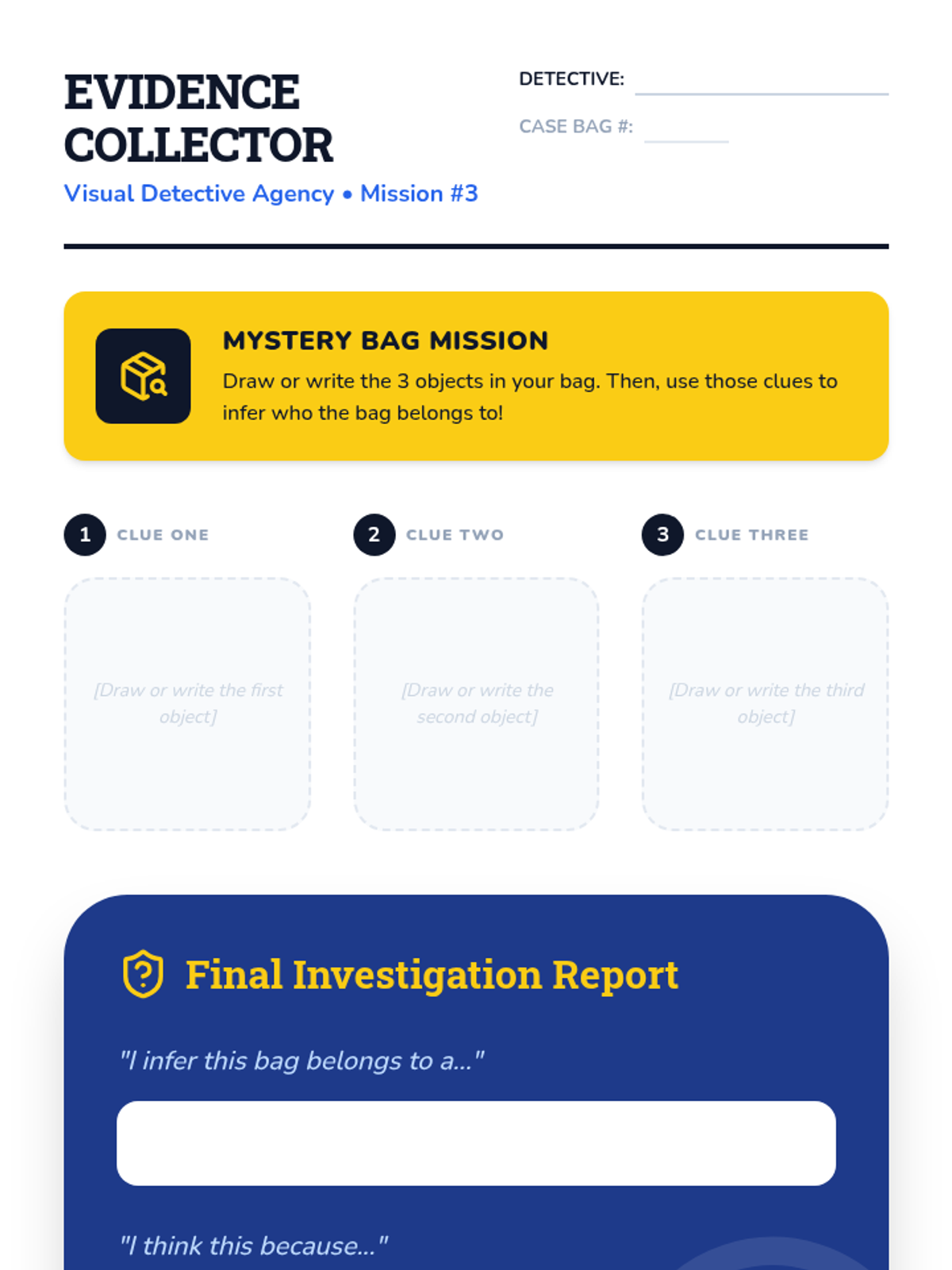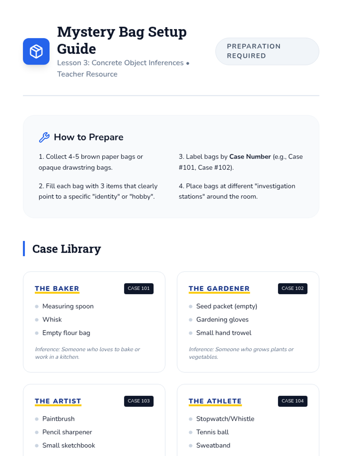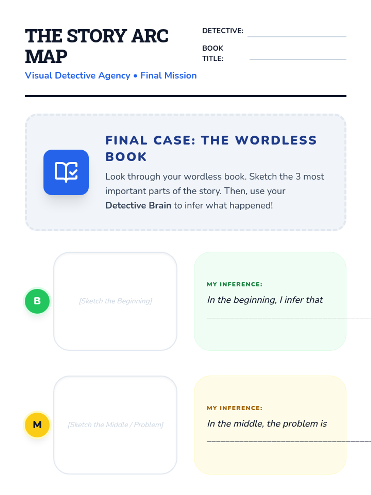 A scaffolded sequence for 2nd-grade students needing academic support, focusing on building inference skills through visual stimuli before transitioning to text-based predictions. Students act as 'Visual Detectives' to bridge concrete observations with abstract conclusions.