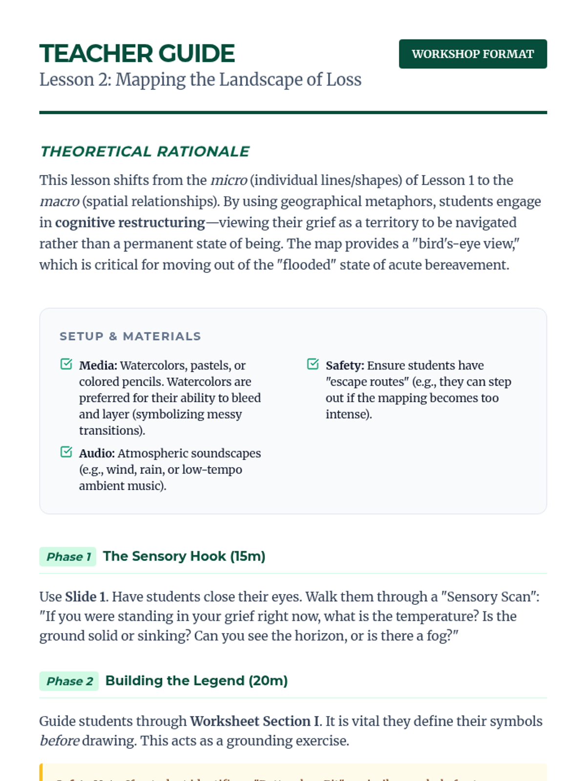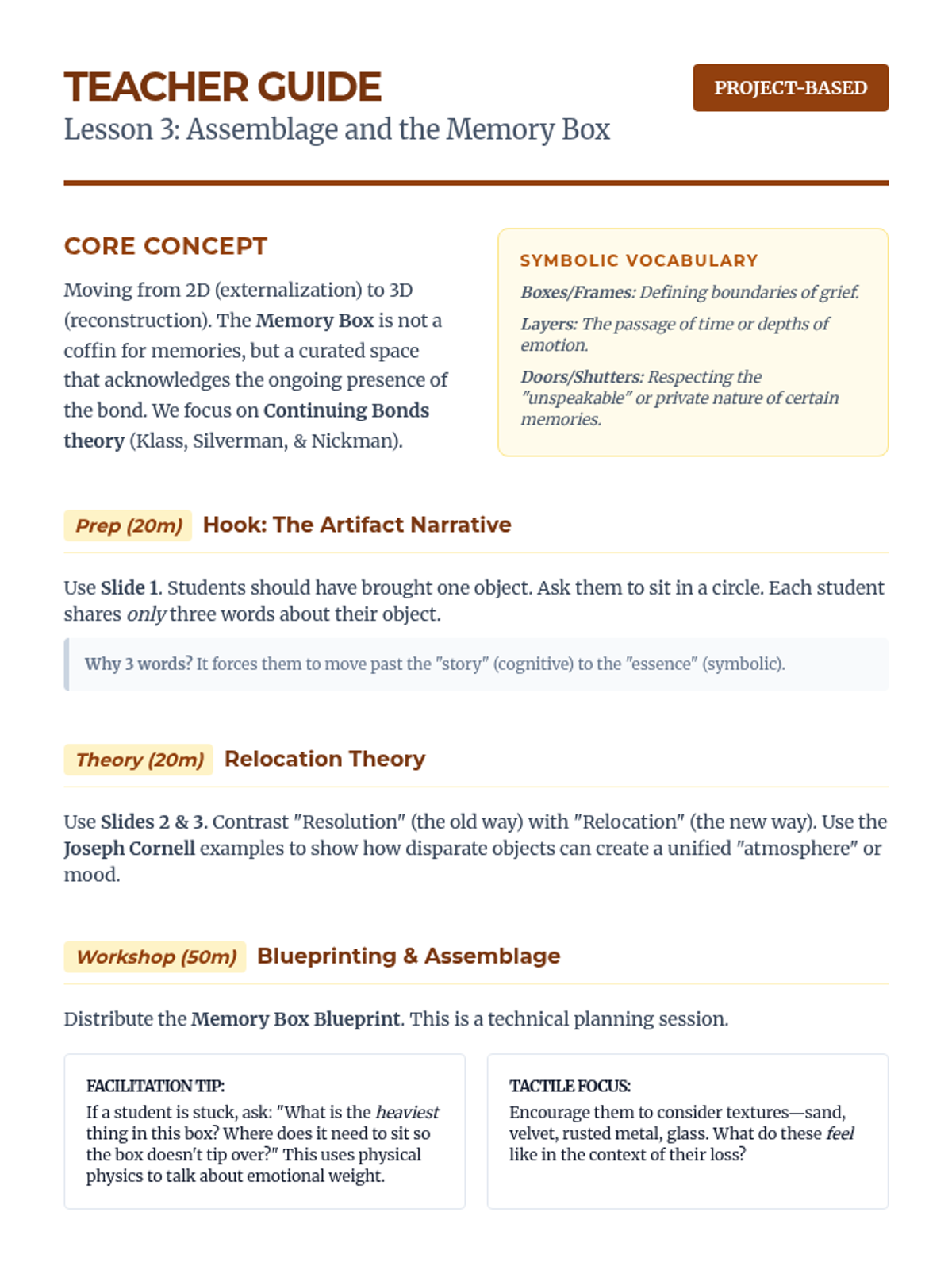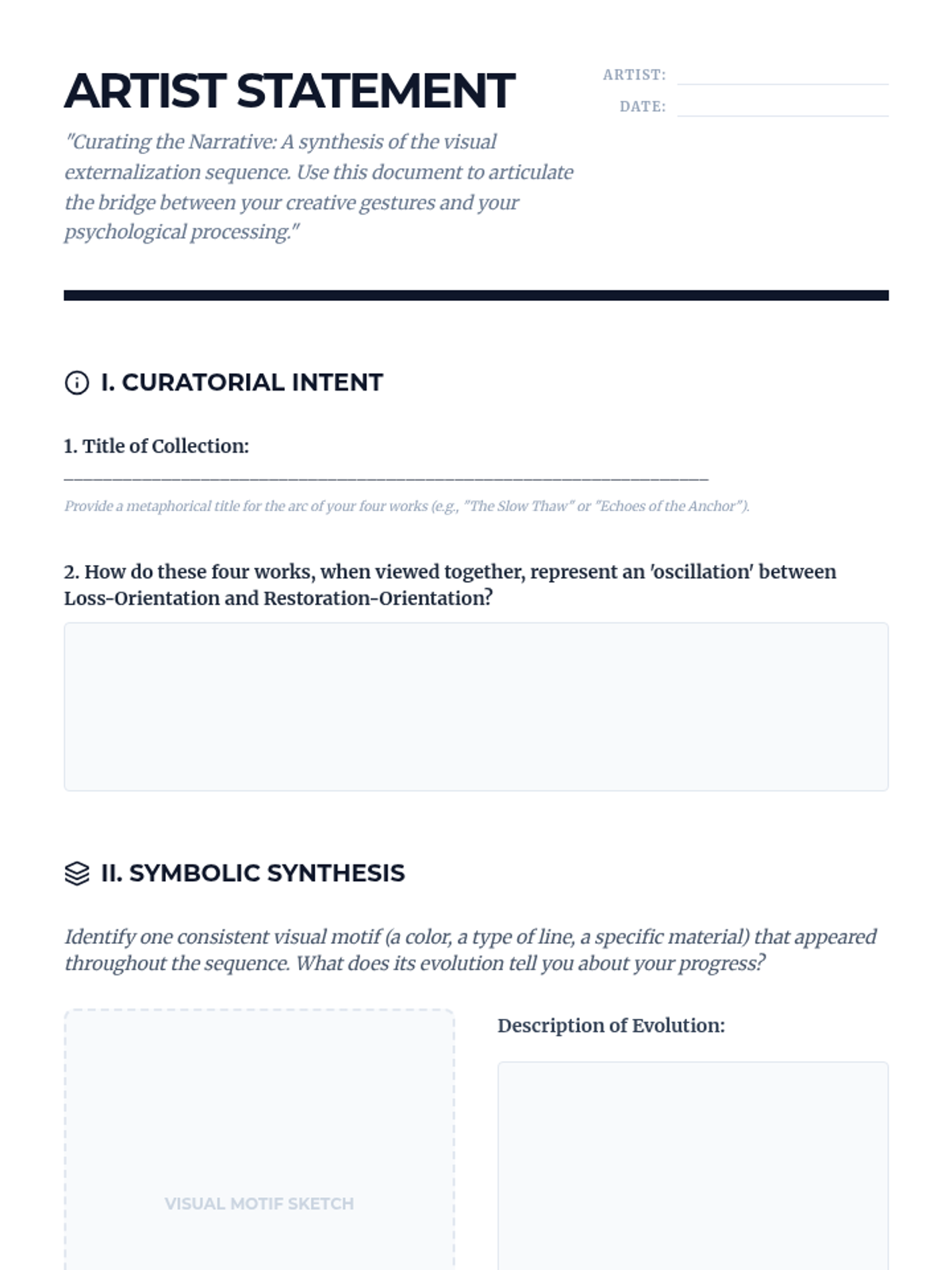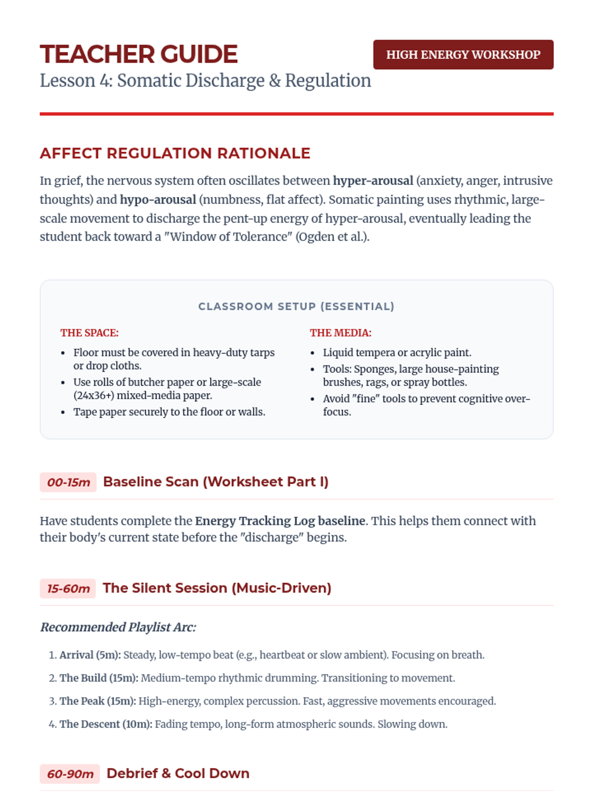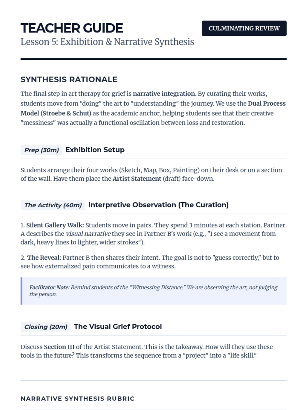 This sequence explores the theoretical foundations and practical applications of visual art therapy techniques in the context of grief counseling. Students balance academic understanding of art therapy efficacy with the experiential learning of creating art, culminating in a personal visual grief protocol.