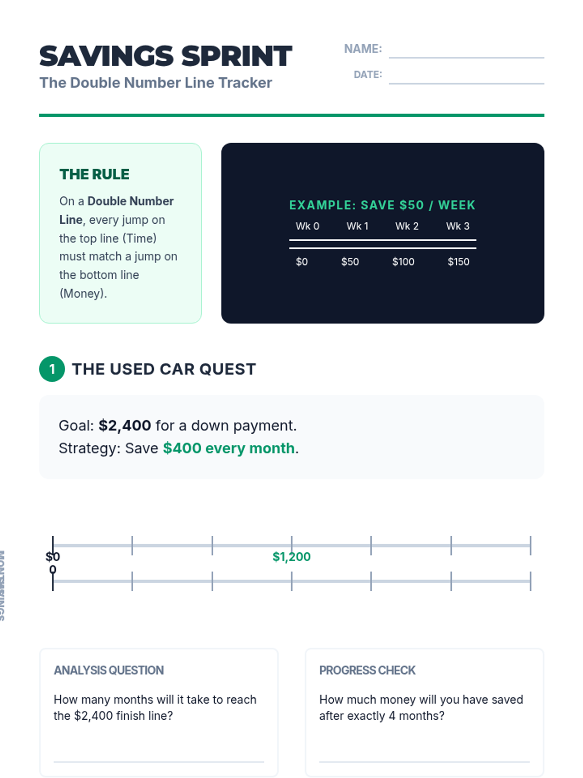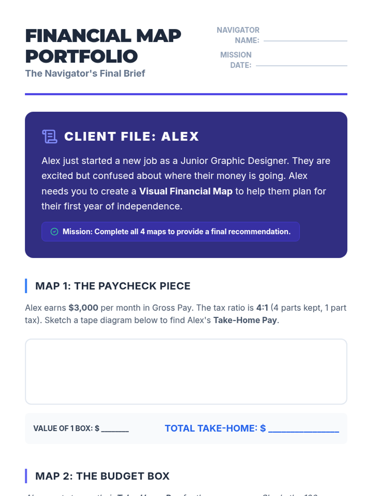 A sequence of five lessons designed for 12th-grade students in special education, focusing on using visual models like bar diagrams, area models, and double number lines to demystify financial math. Students transition from abstract calculations to concrete visual representations of wages, budgeting, savings, and loan comparisons.