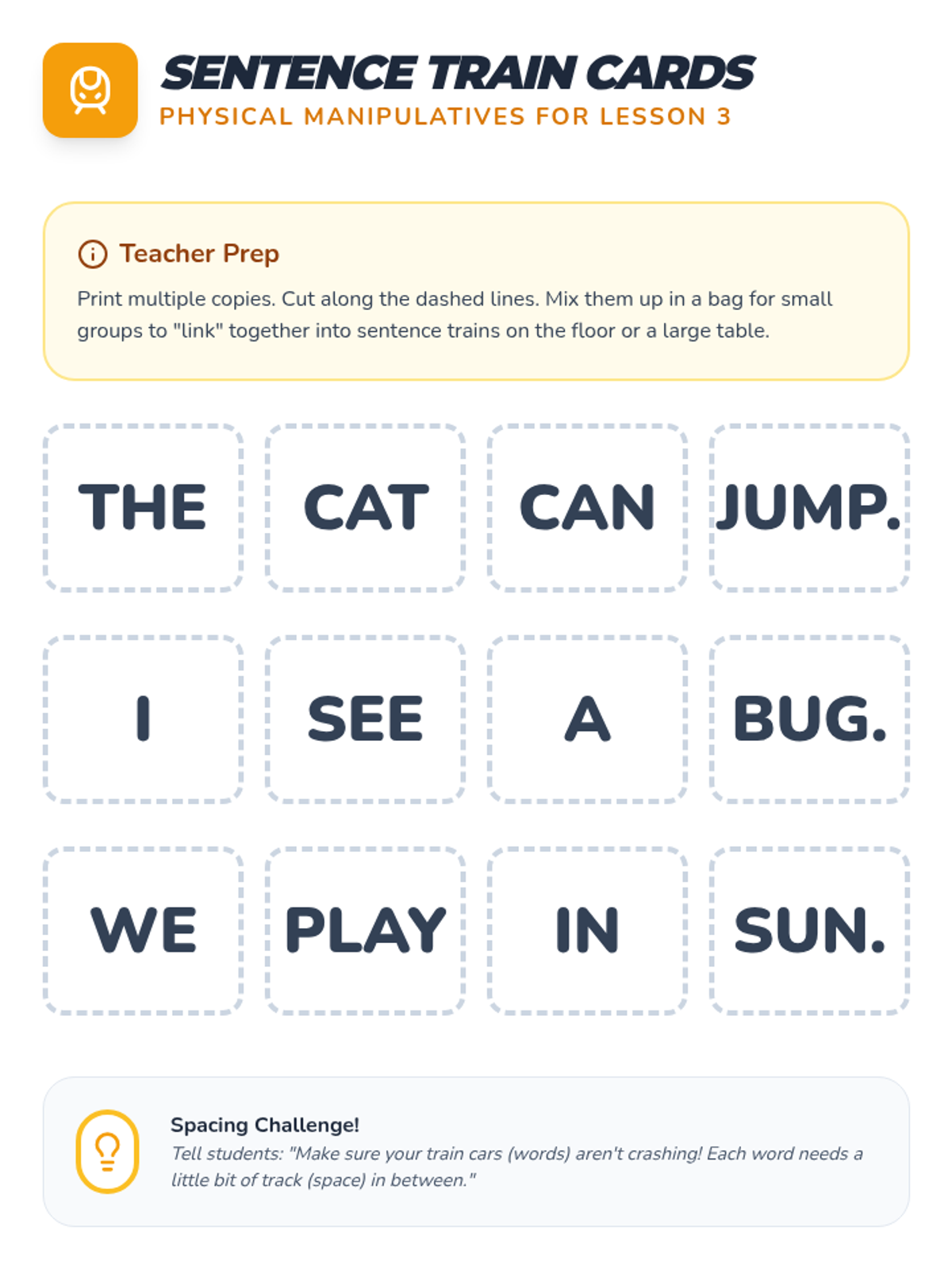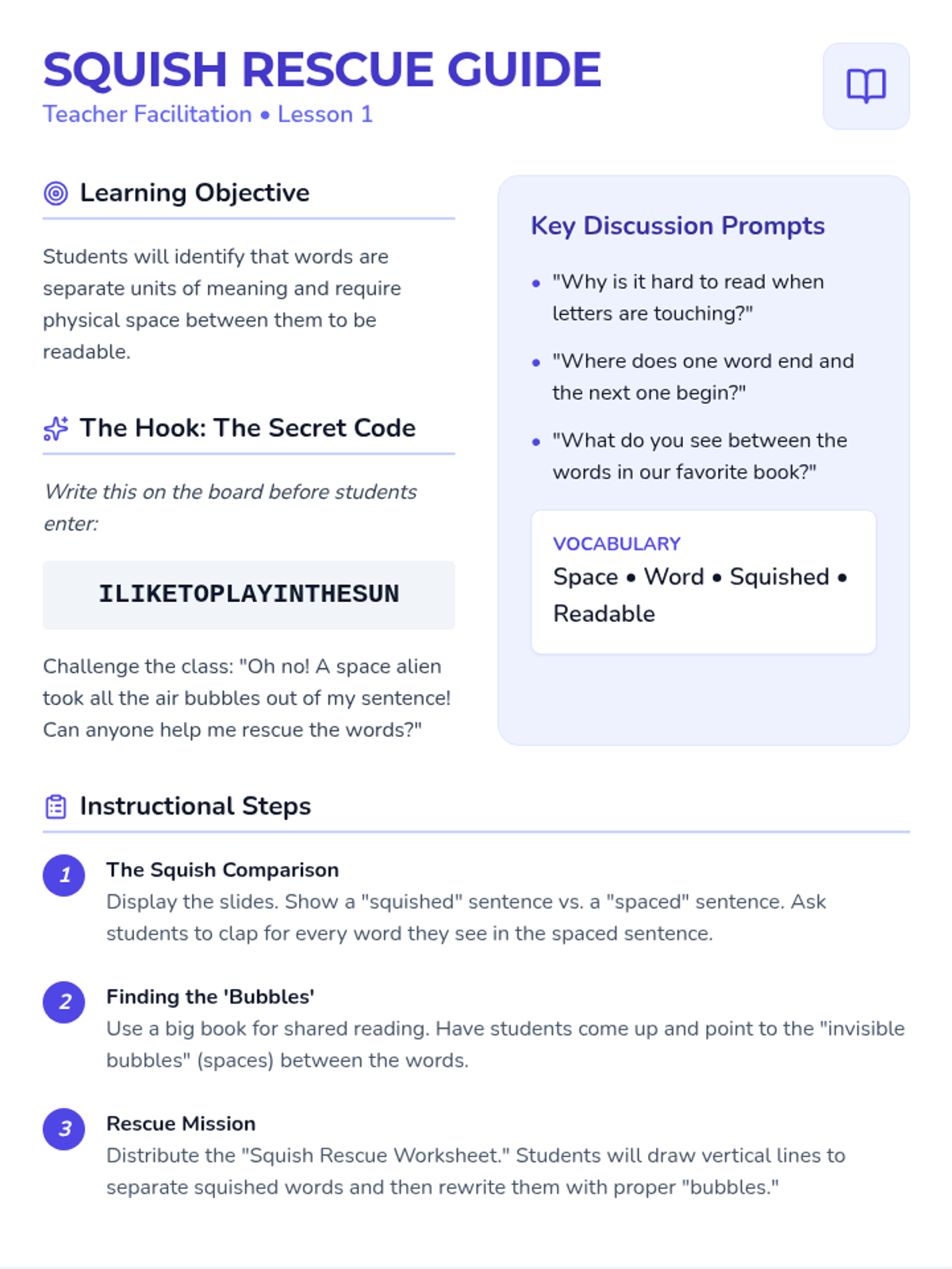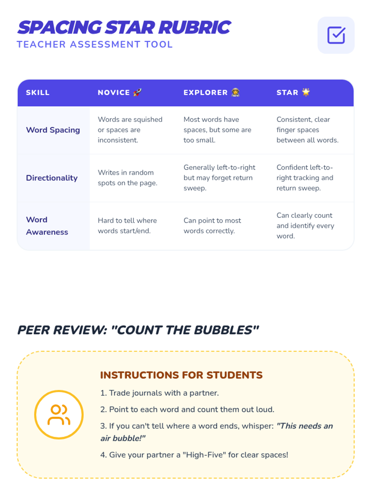 A Kindergarten ELA sequence focused on text formatting, teaching students the importance of word spacing and left-to-right directionality through inquiry, physical manipulatives, and practice.