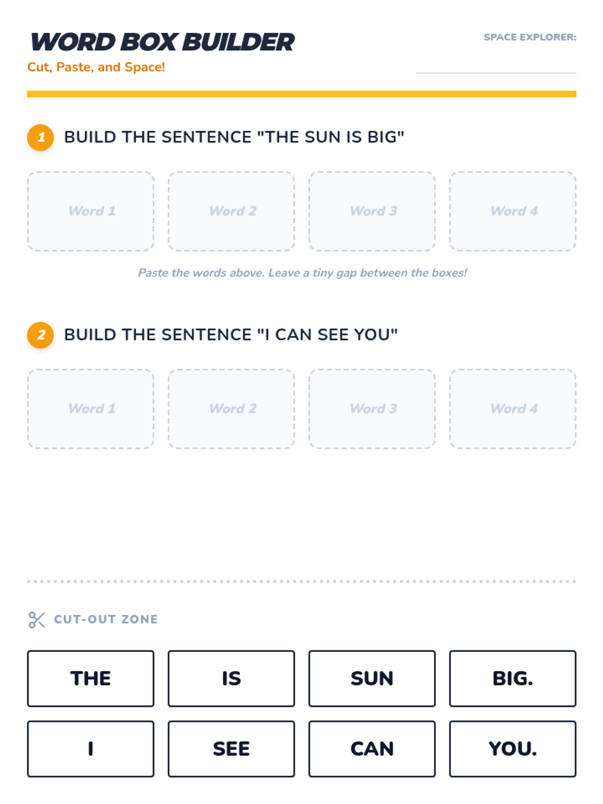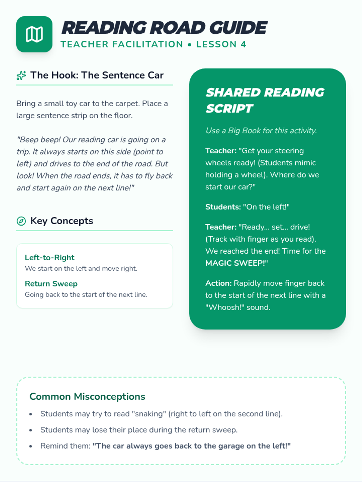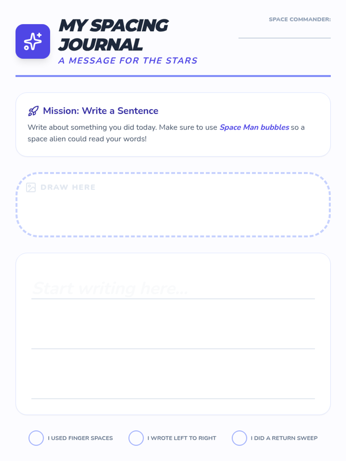 A Kindergarten ELA sequence focused on text formatting, teaching students the importance of word spacing and left-to-right directionality through inquiry, physical manipulatives, and practice.