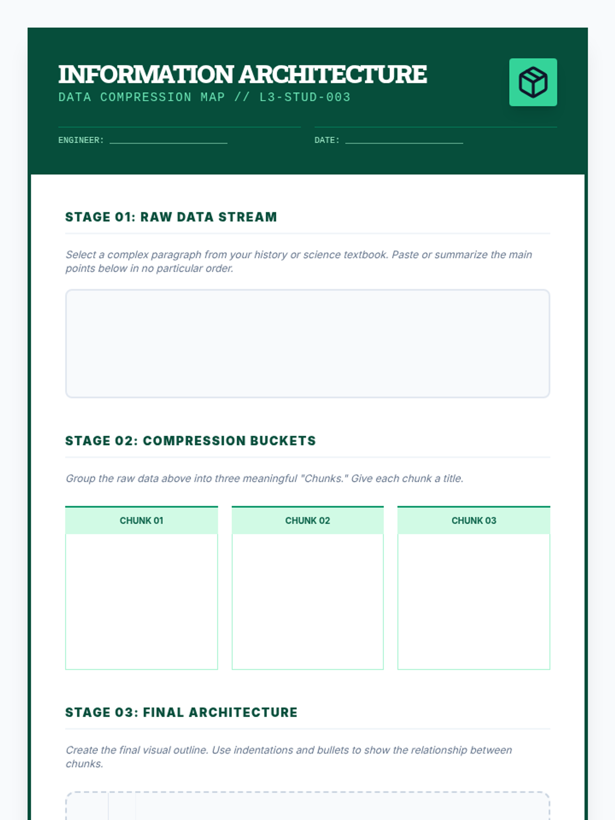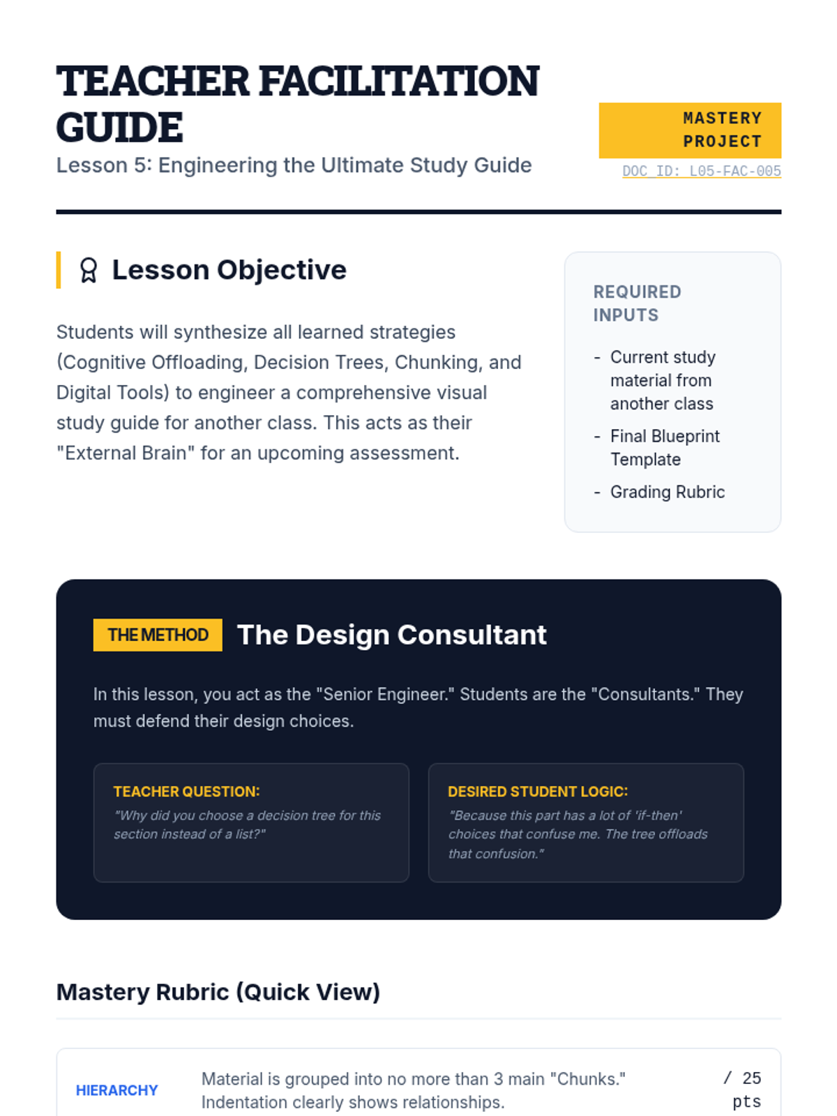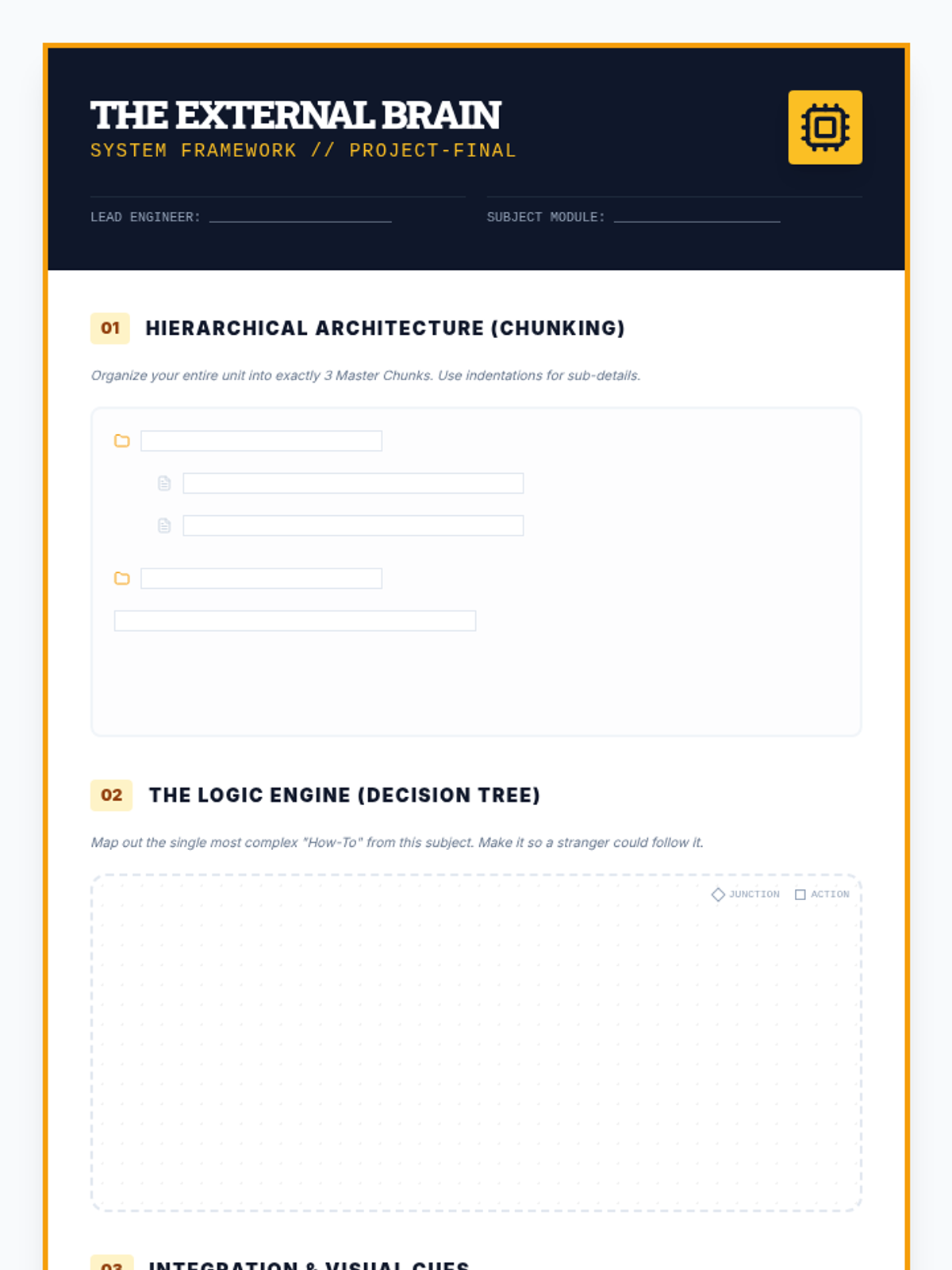 A project-based sequence for 10th graders focusing on 'offloading' cognitive load through visual frameworks and external tools. Students act as 'process engineers' to design systems that support working memory and sustained attention during complex tasks.