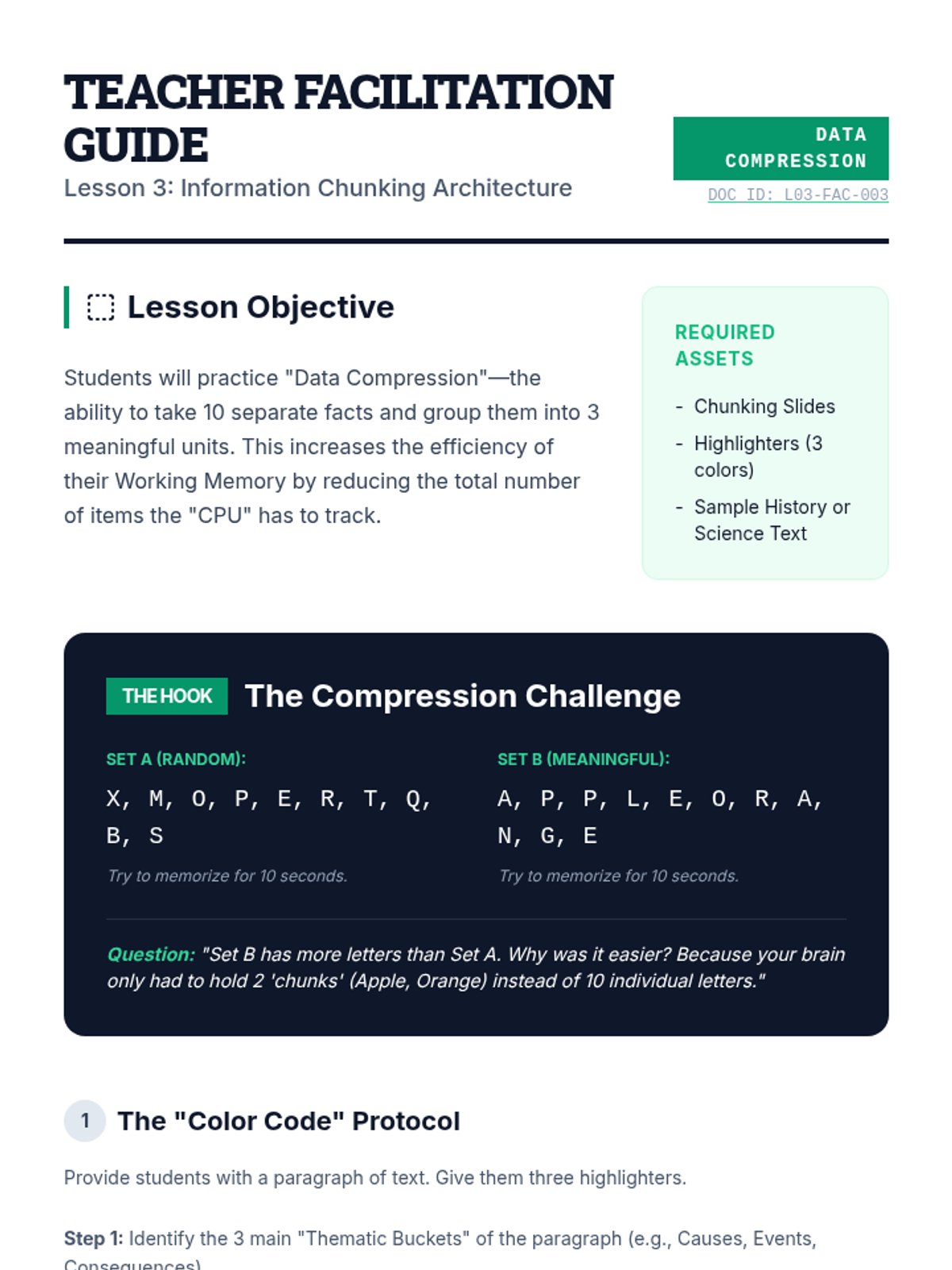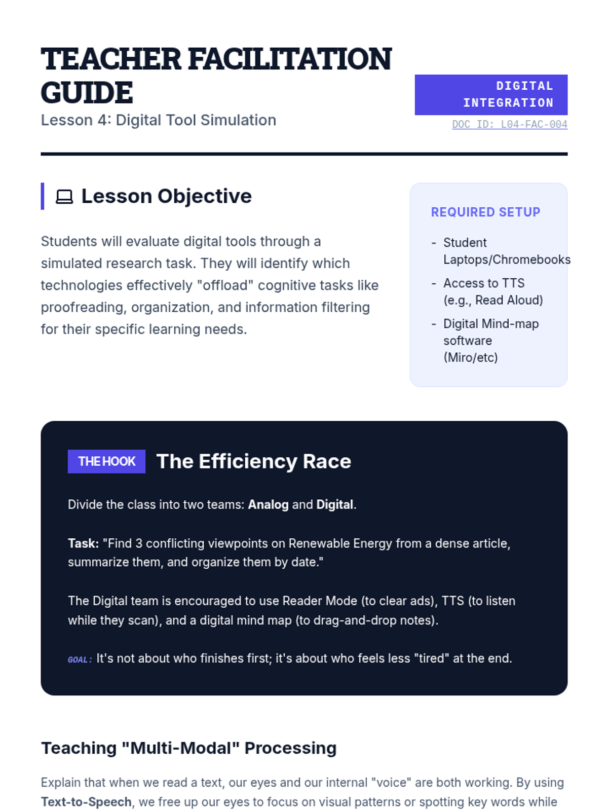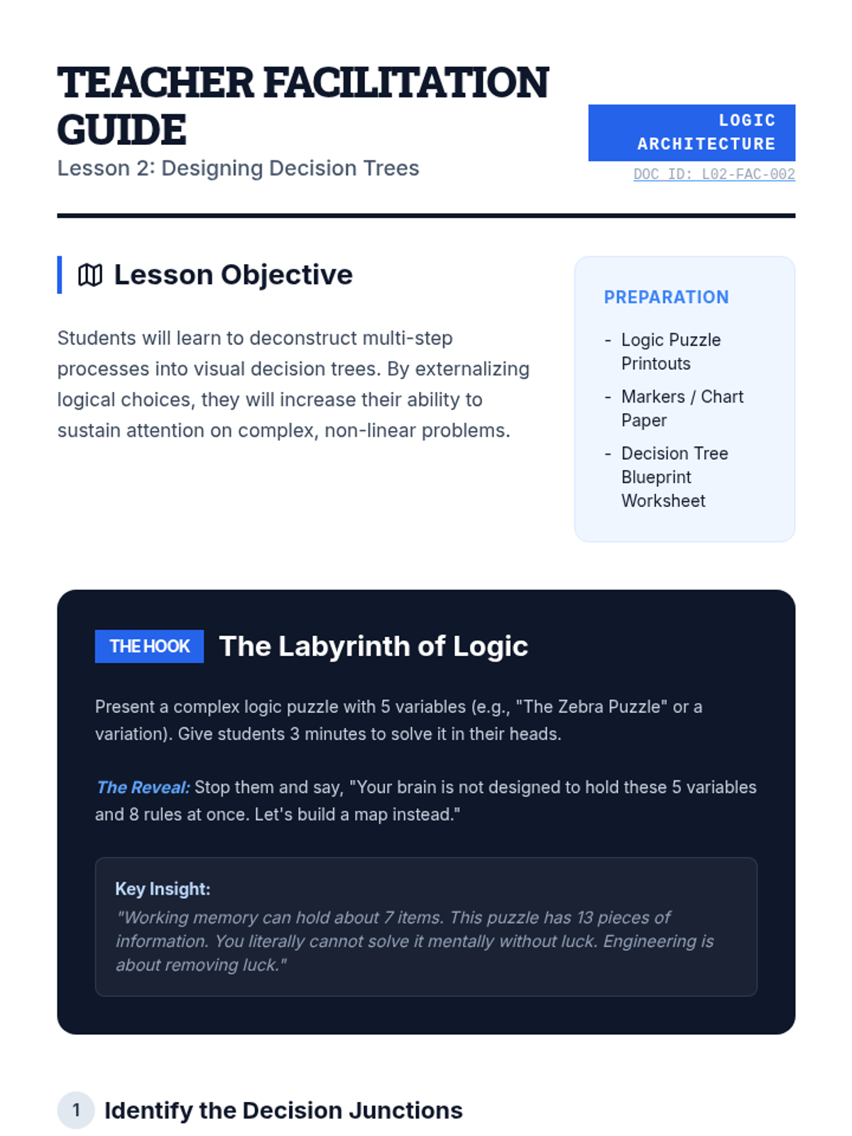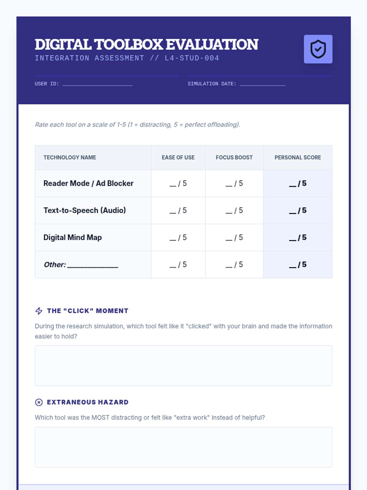 A project-based sequence for 10th graders focusing on 'offloading' cognitive load through visual frameworks and external tools. Students act as 'process engineers' to design systems that support working memory and sustained attention during complex tasks.