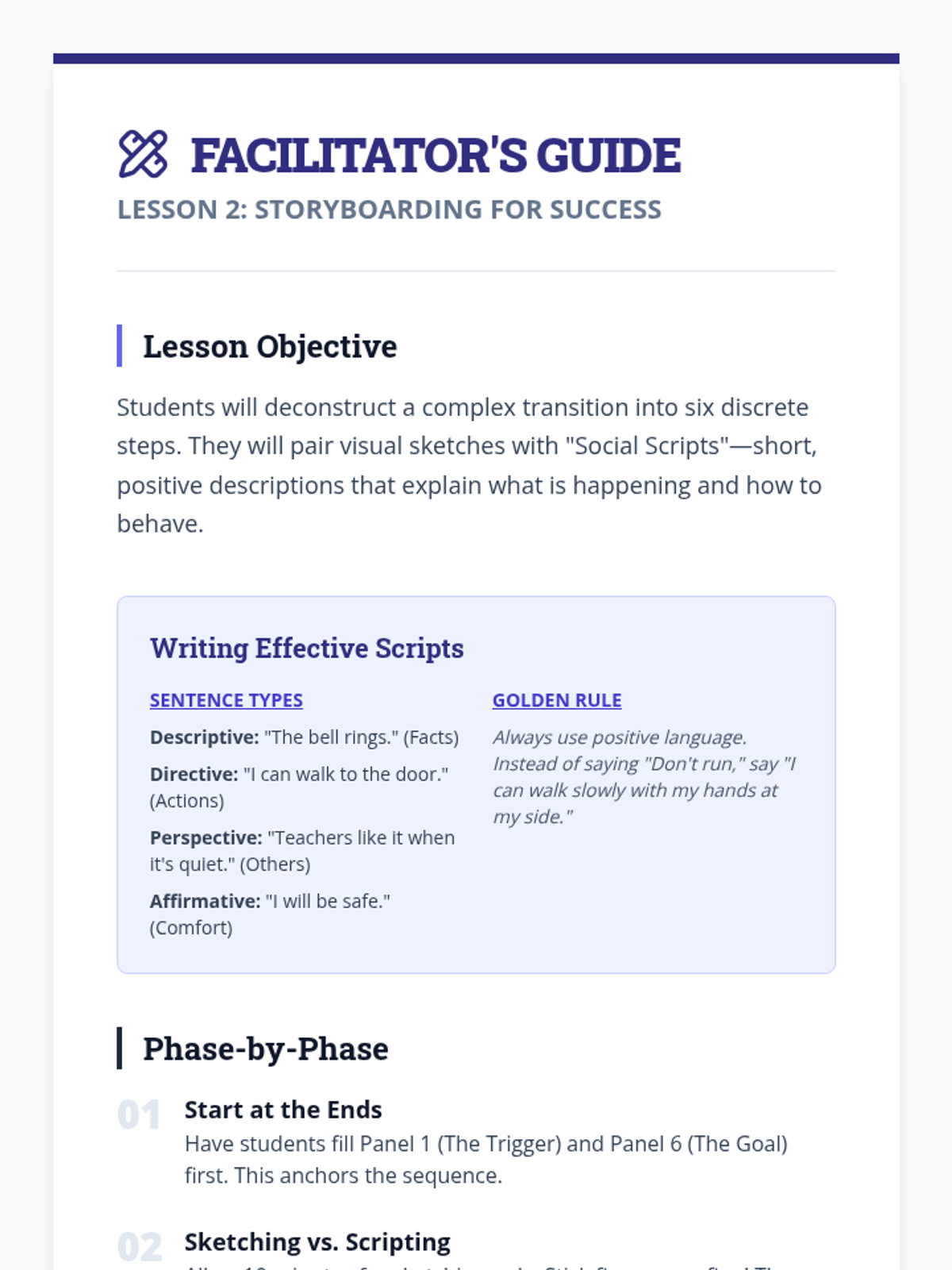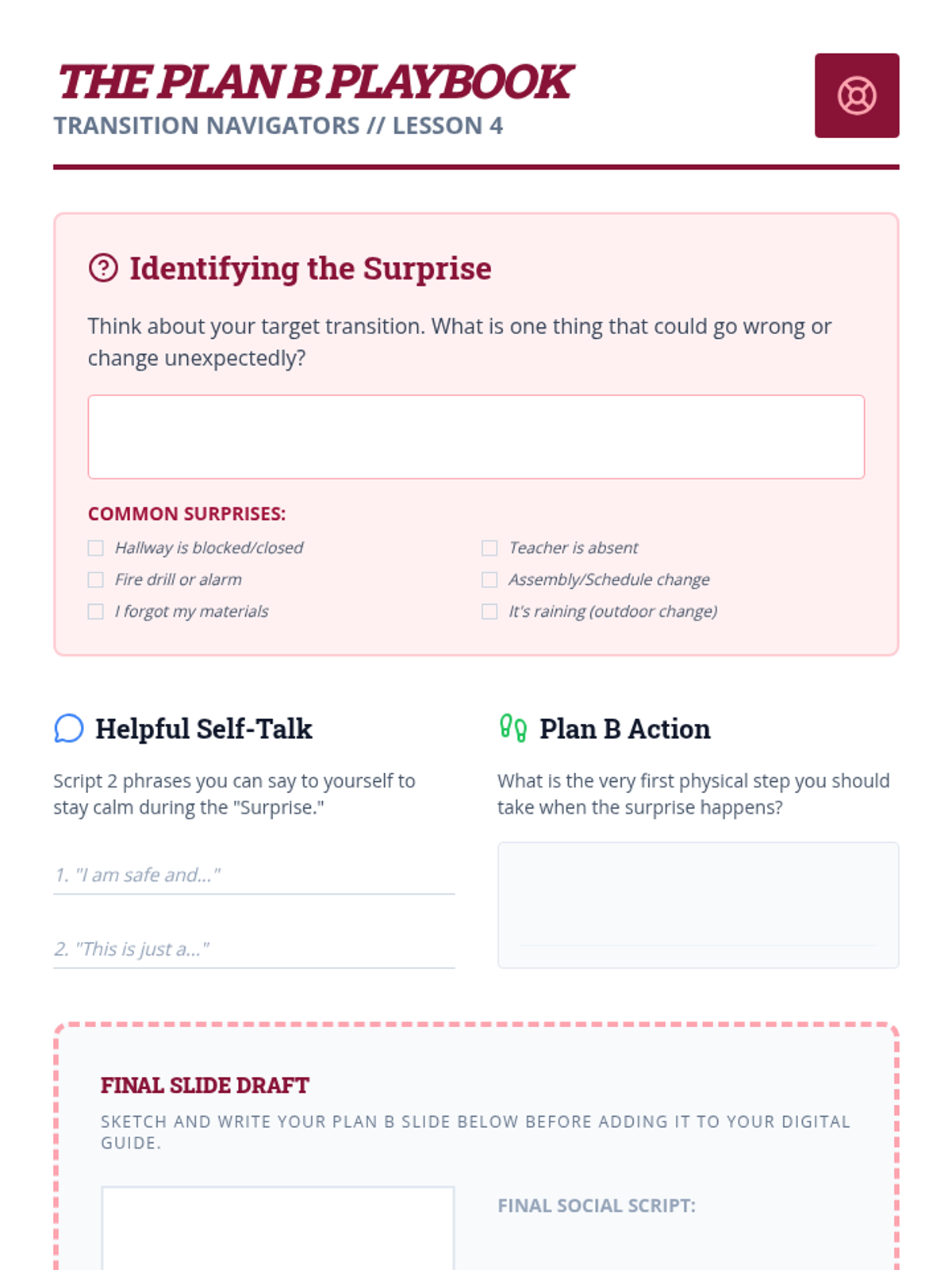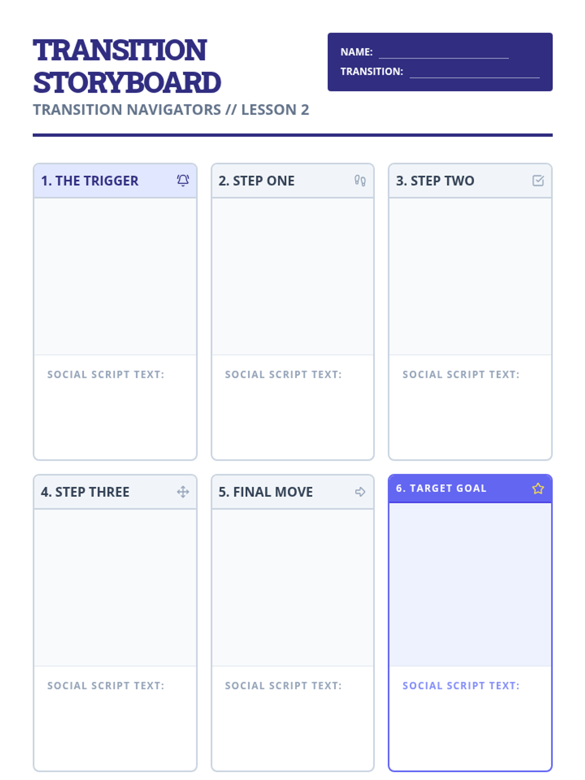 A project-based sequence where 6th-grade students research school transitions, identify anxiety-inducing changes, and design digital visual guides (social narratives) to navigate them successfully. Students develop self-regulation skills, sequencing abilities, and resilience through the creation of portable behavioral supports.