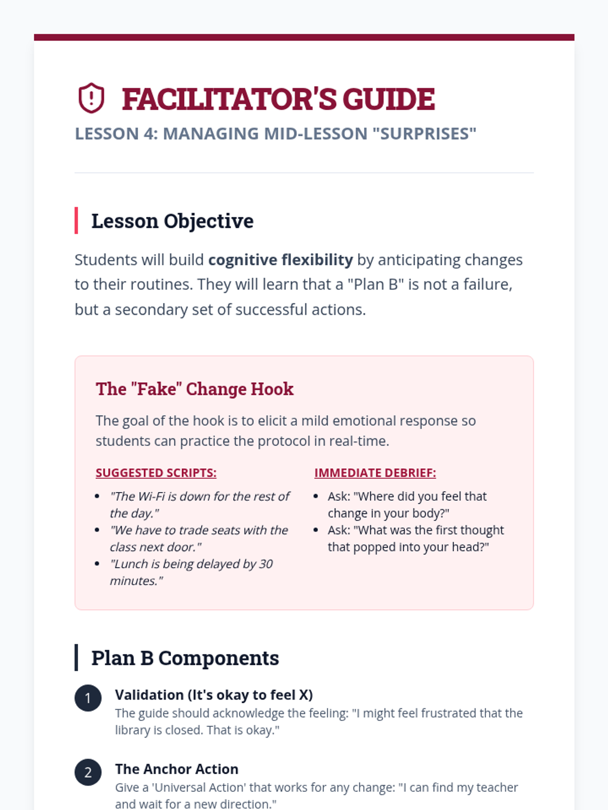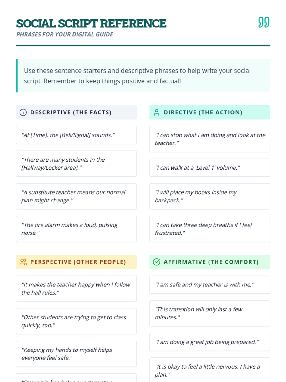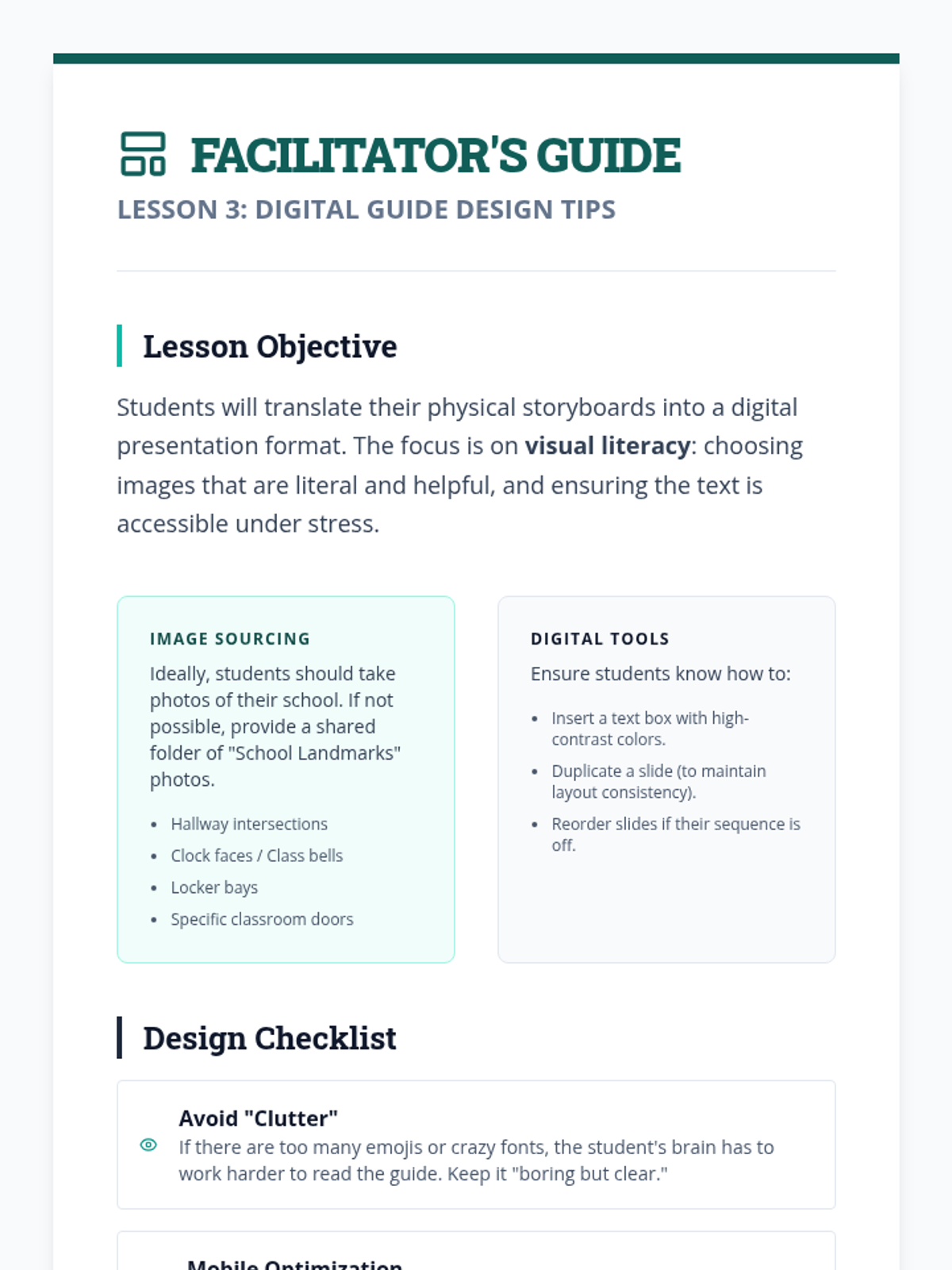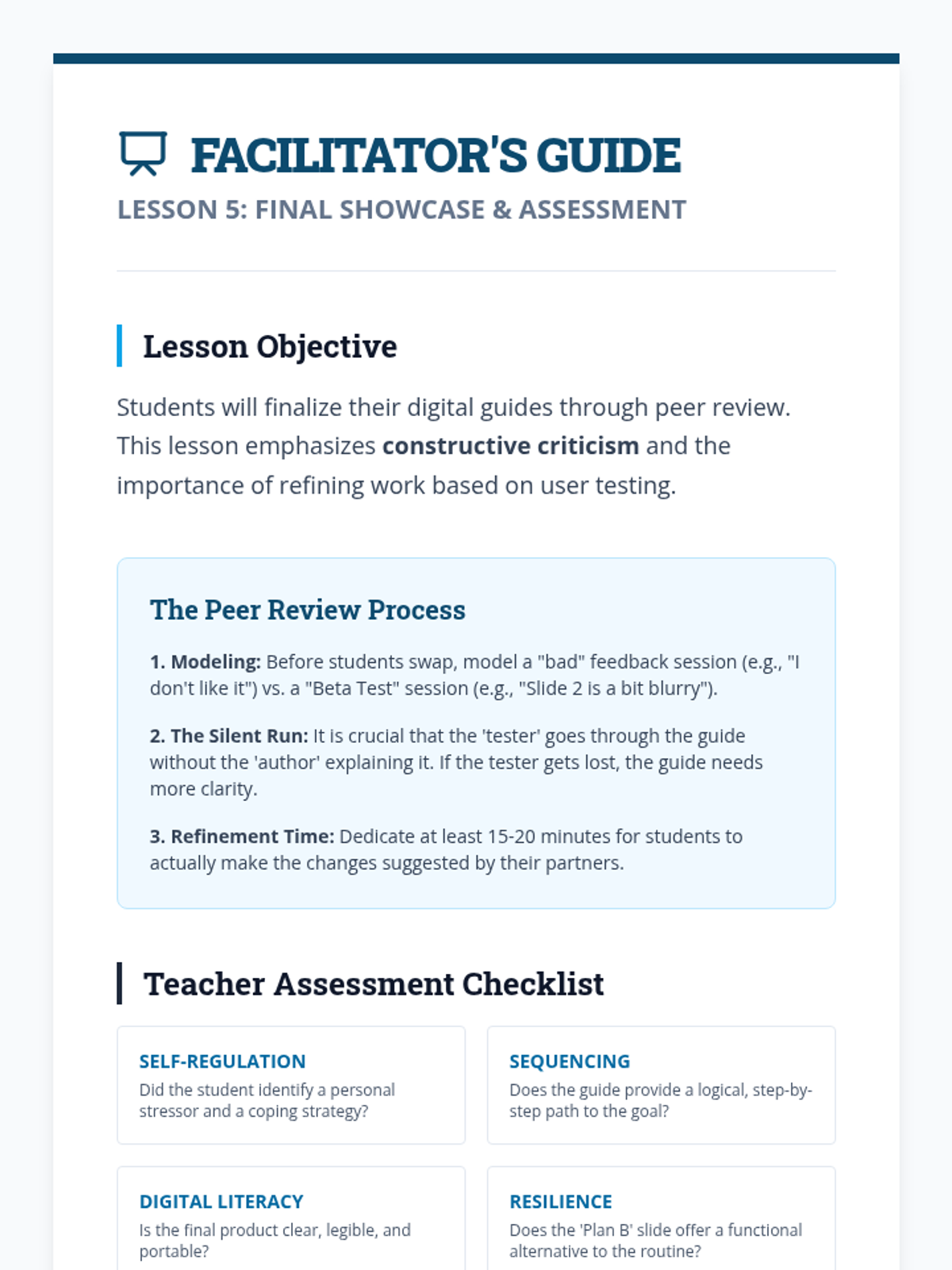 A project-based sequence where 6th-grade students research school transitions, identify anxiety-inducing changes, and design digital visual guides (social narratives) to navigate them successfully. Students develop self-regulation skills, sequencing abilities, and resilience through the creation of portable behavioral supports.