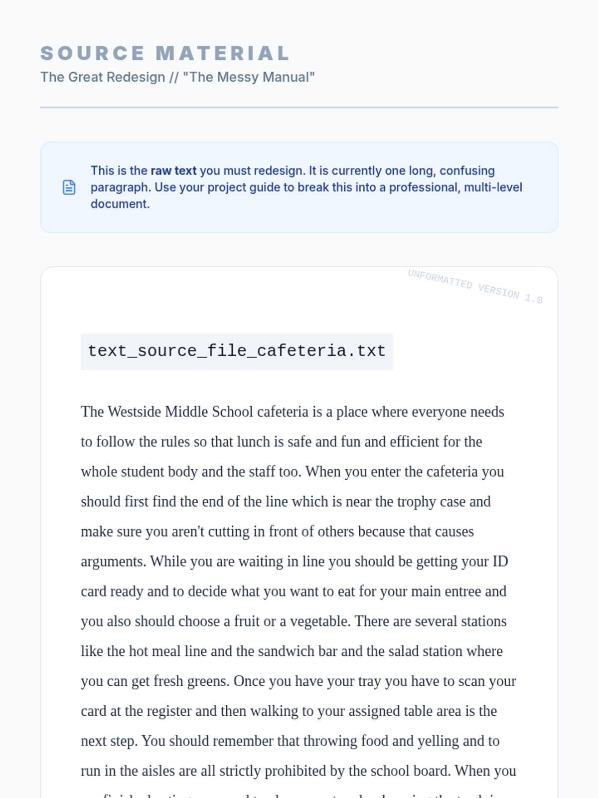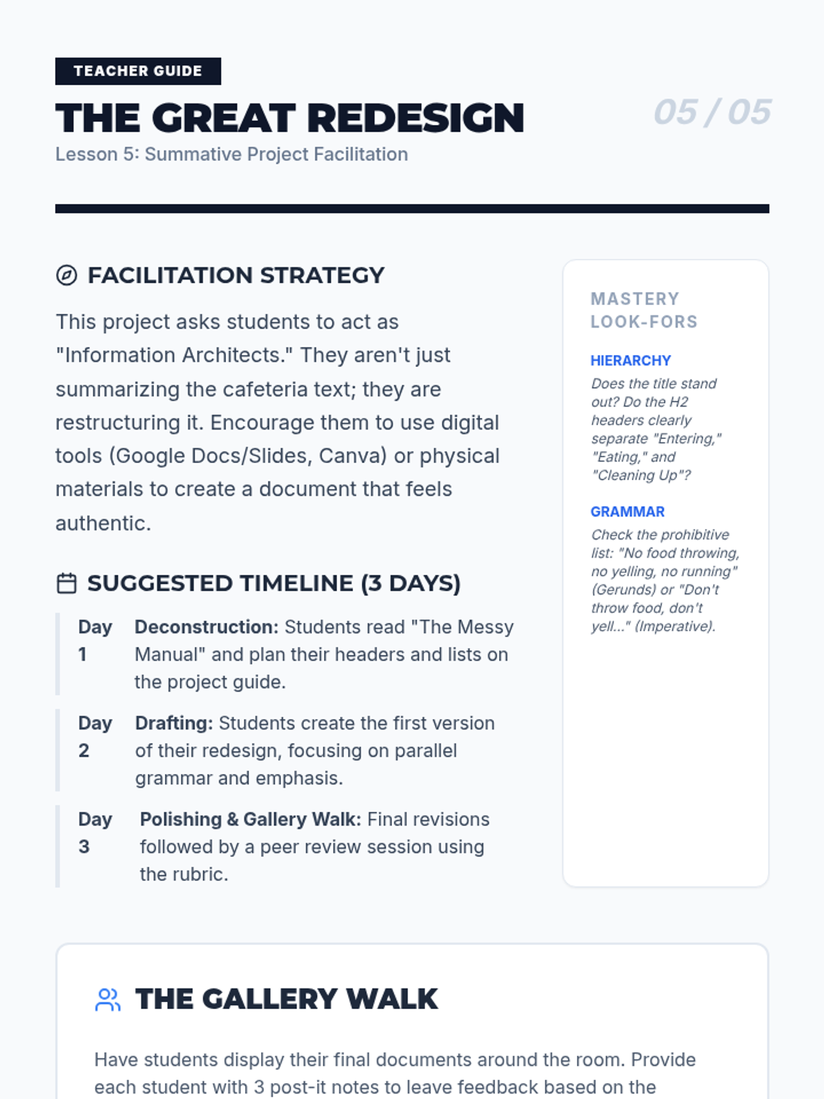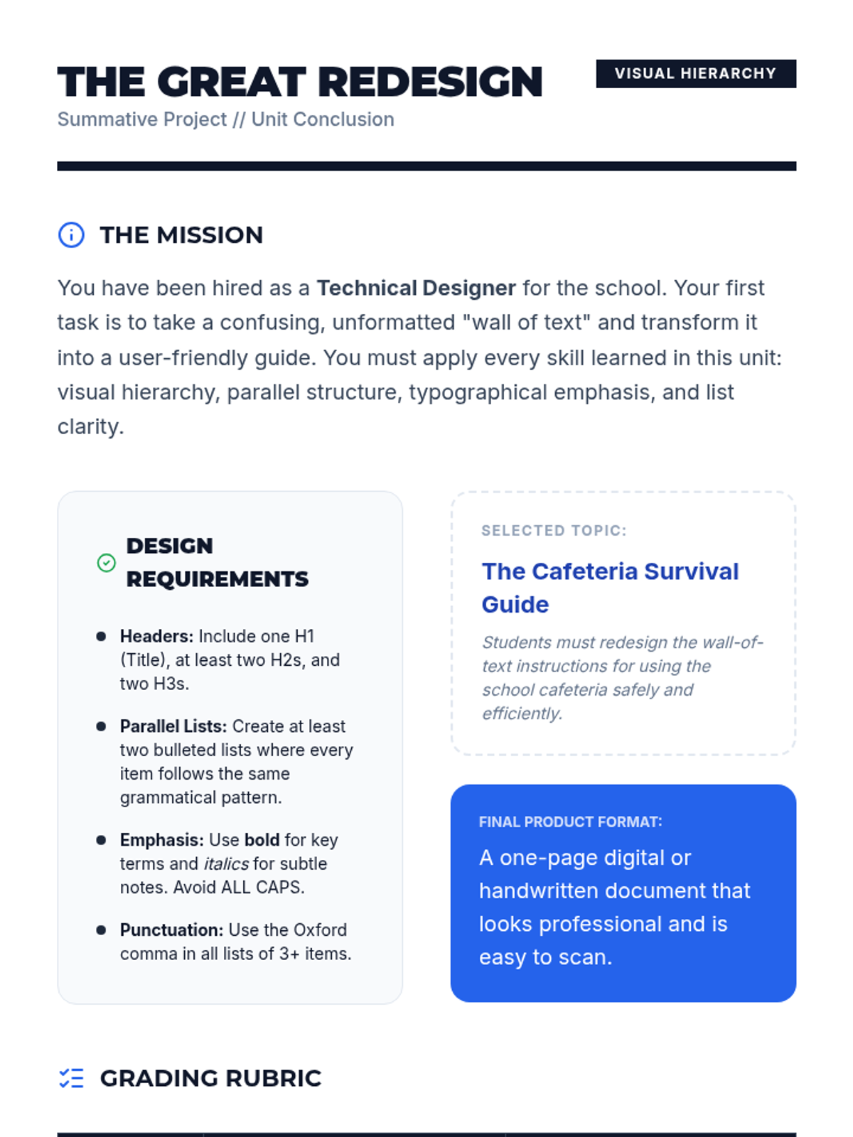 A comprehensive 8th Grade ELA unit on document design and formatting. Students learn to use headers, parallel lists, typography, and punctuation to organize informational text for maximum clarity and impact.