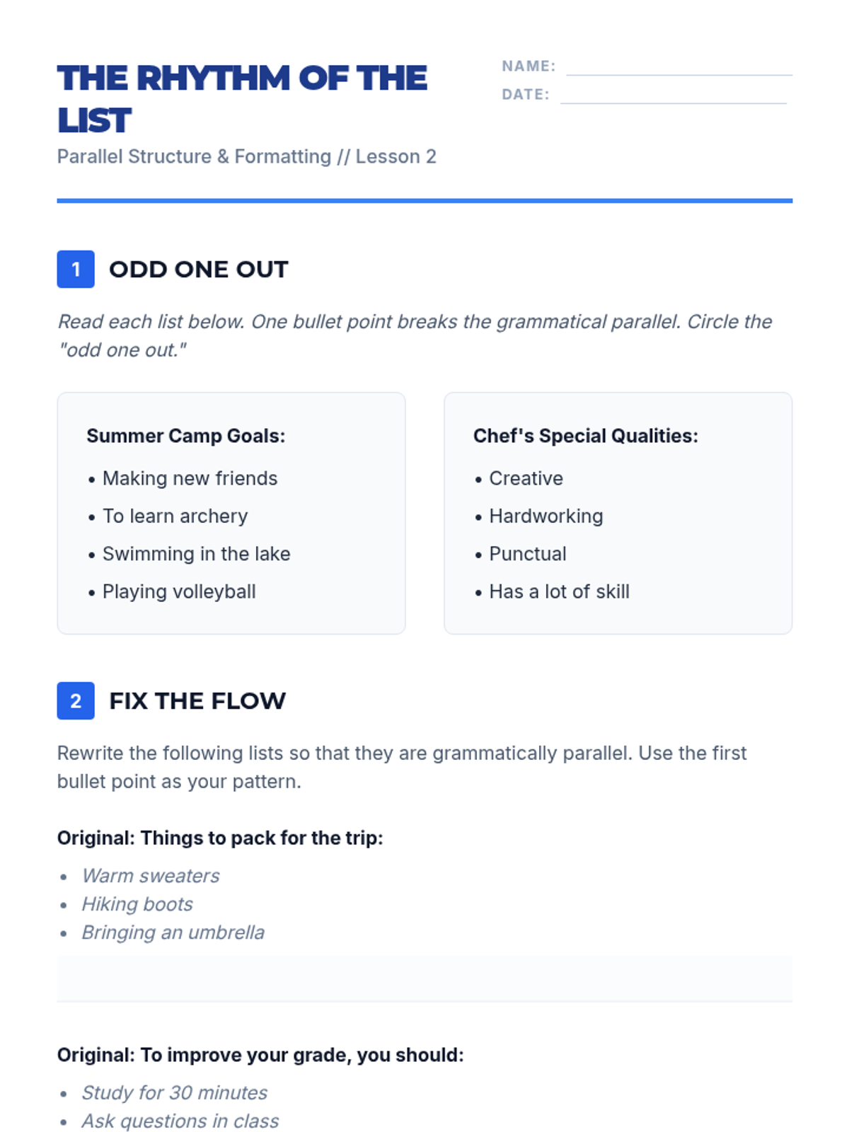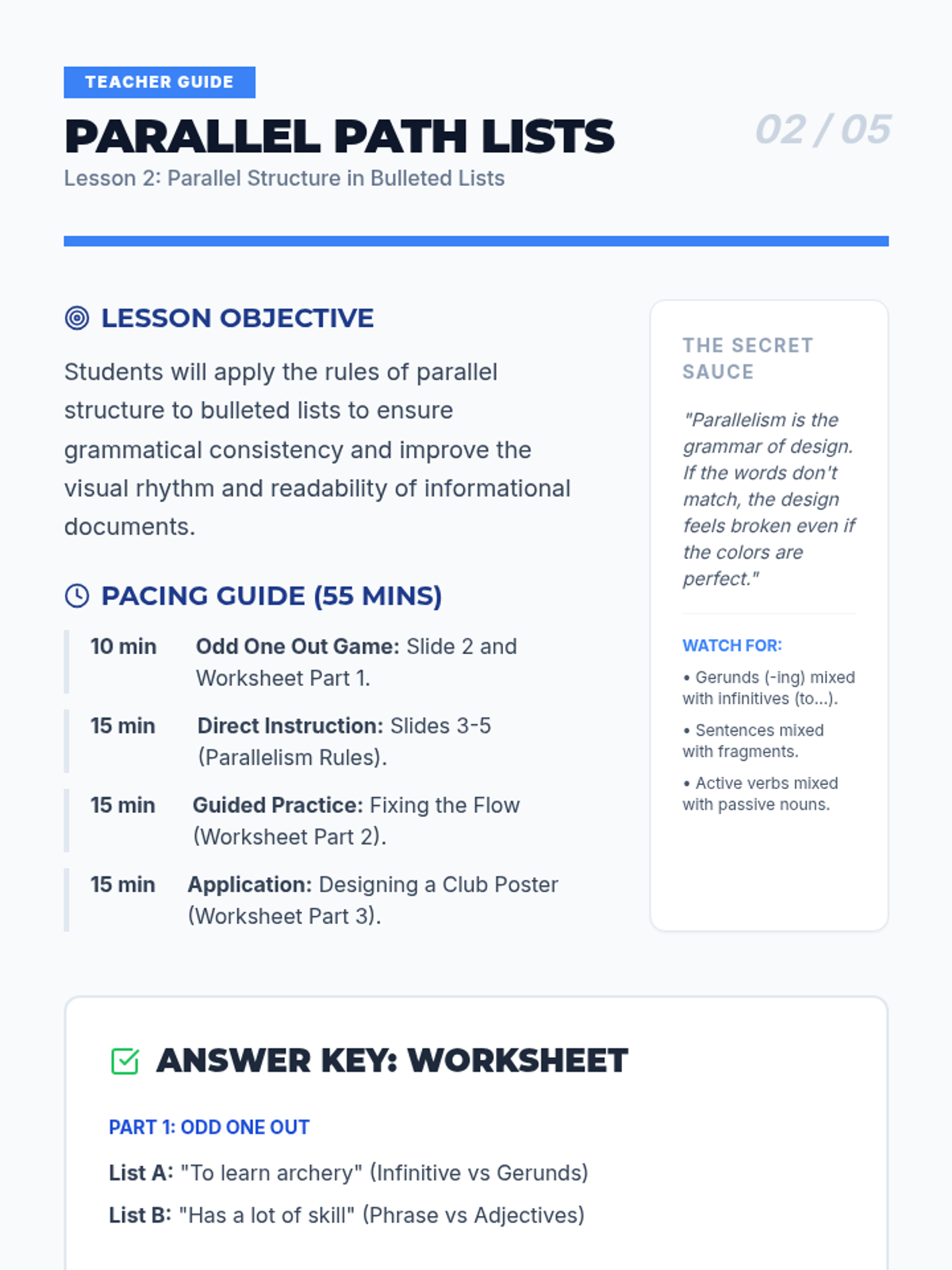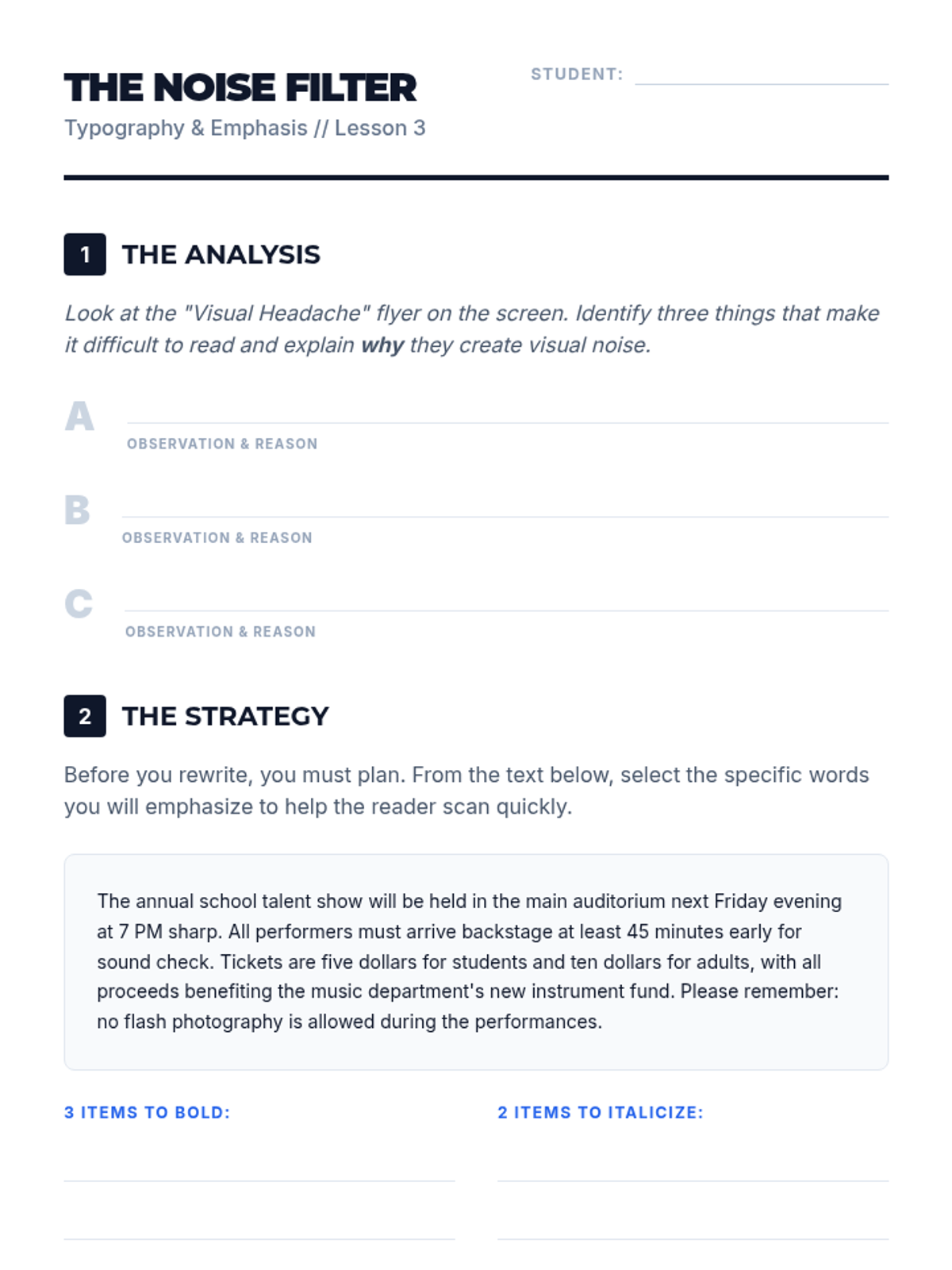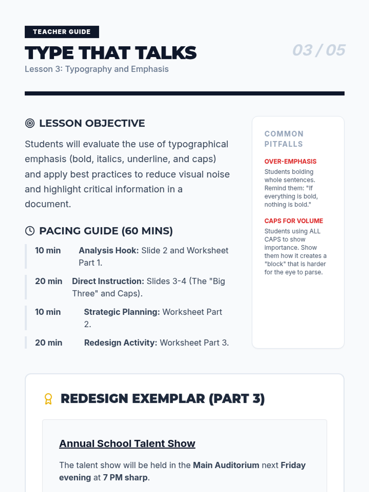 A comprehensive 8th Grade ELA unit on document design and formatting. Students learn to use headers, parallel lists, typography, and punctuation to organize informational text for maximum clarity and impact.