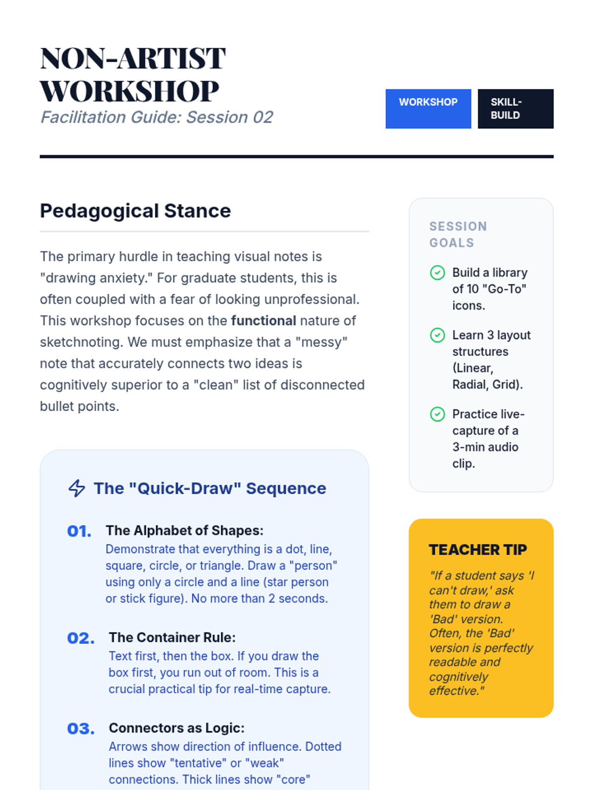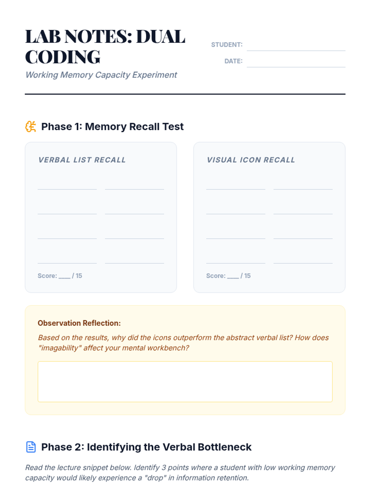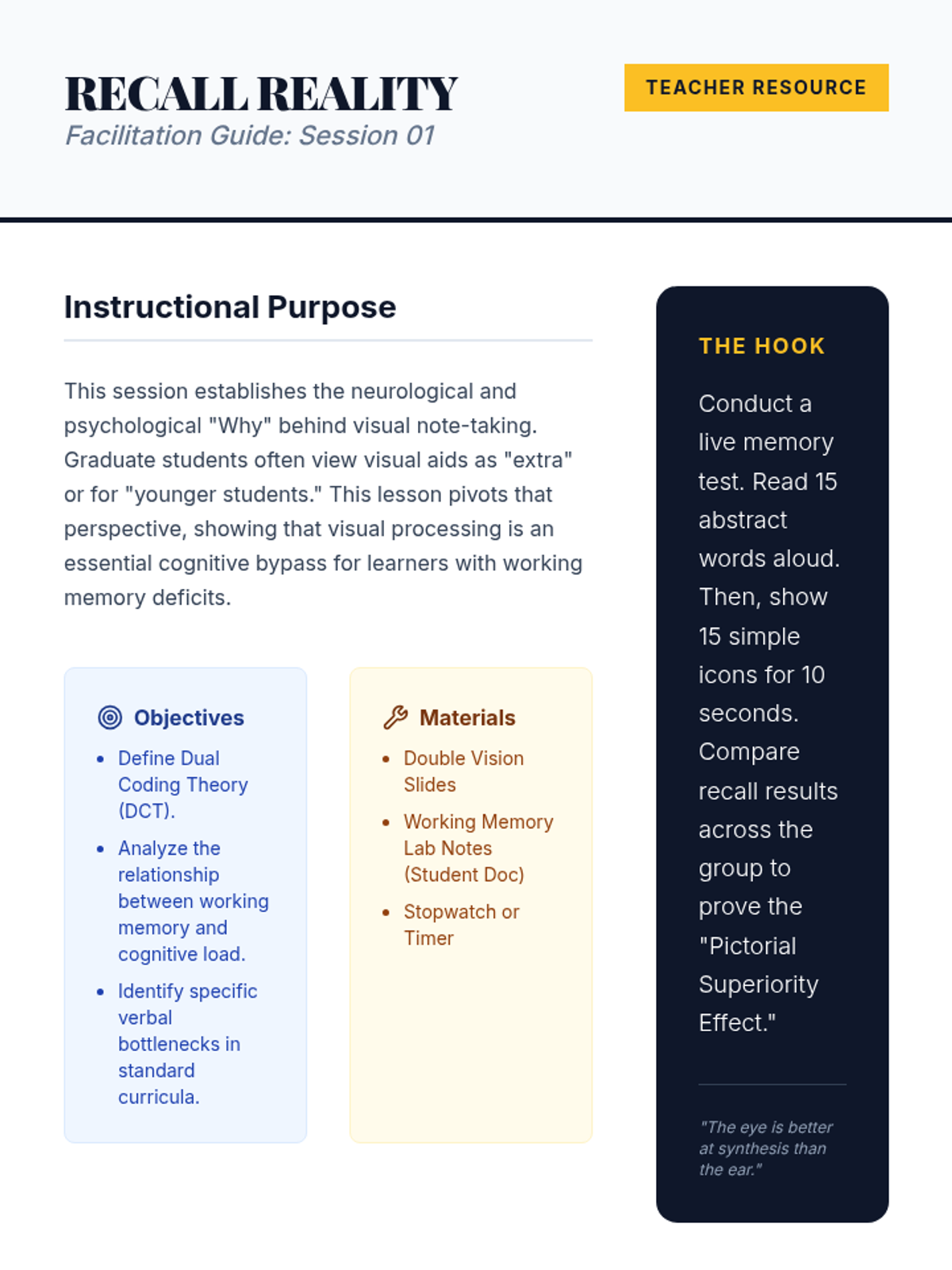 A graduate-level exploration of Dual Coding Theory and visual note-taking strategies designed to support learners with working memory deficits. Students will move from theoretical foundations to practical implementation of sketchnoting, concept mapping, and rubric design for non-linear synthesis.
