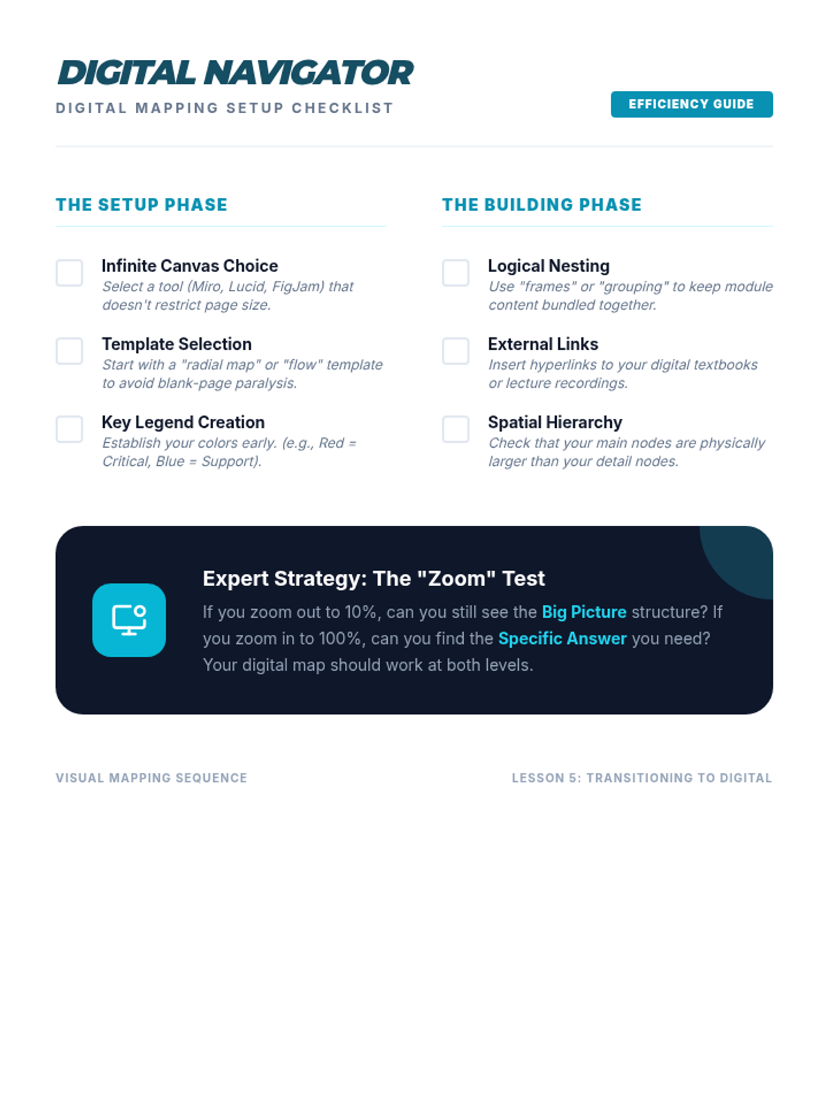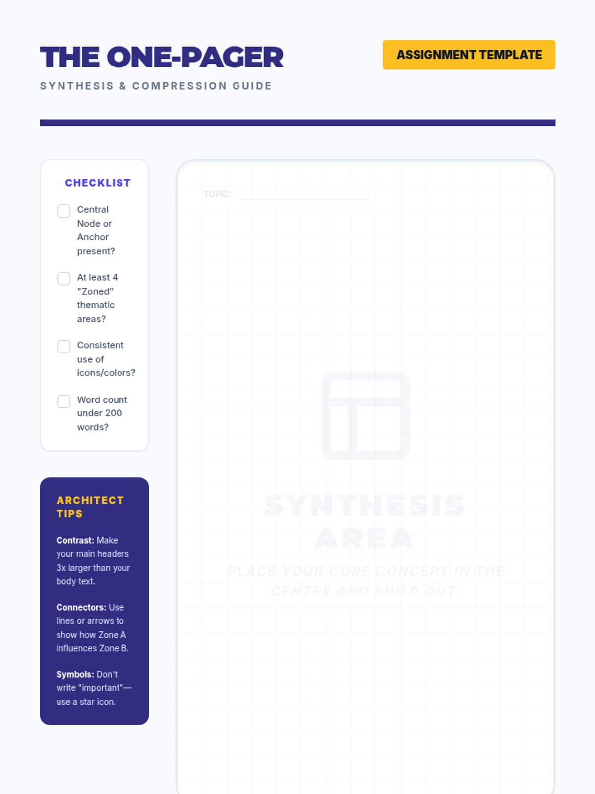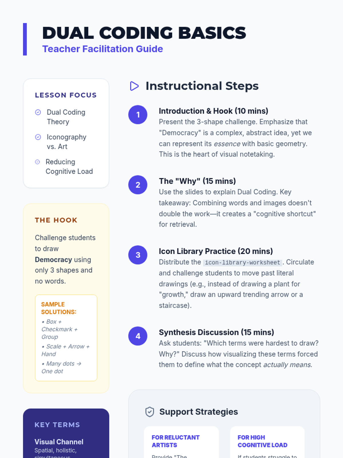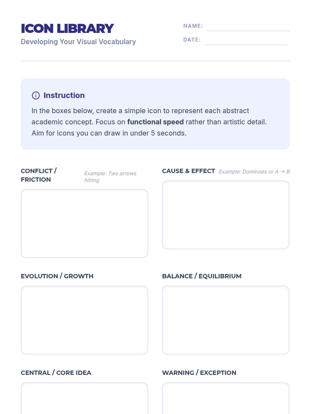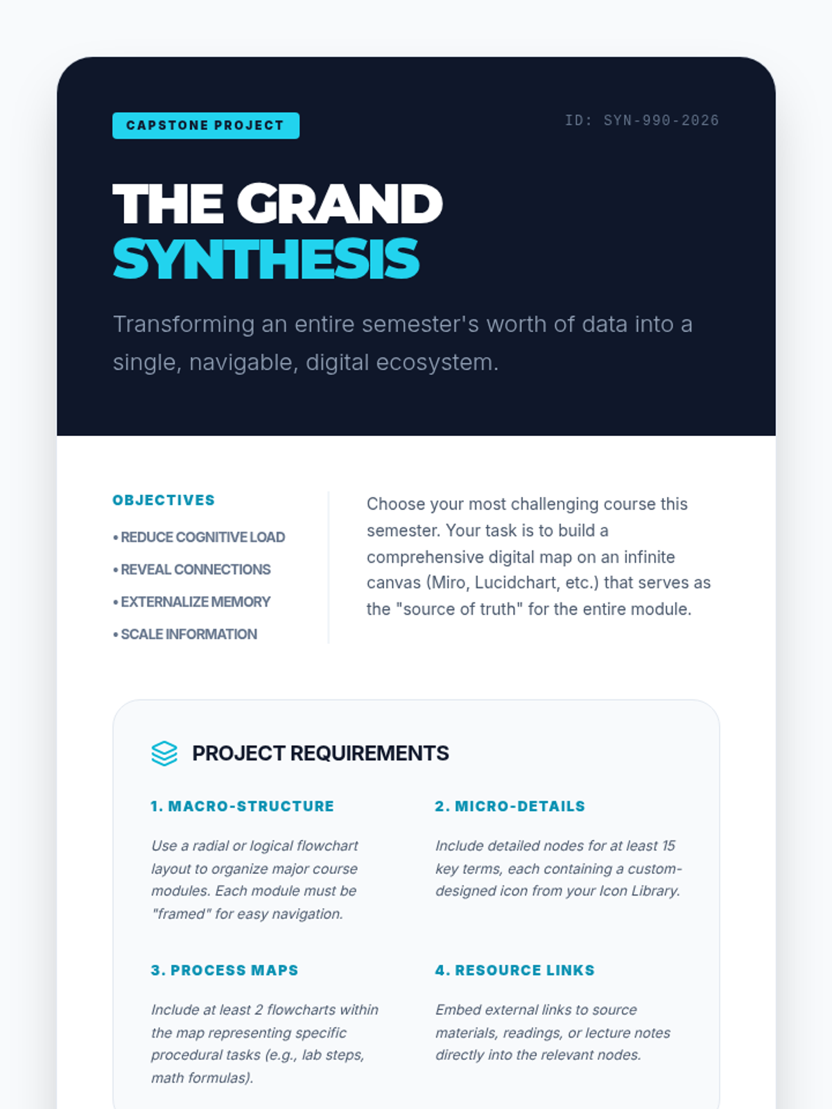 This sequence teaches undergraduate students how to use visual mapping (mind maps, flowcharts, dual coding) to reduce working memory load and organize complex academic concepts. Students progress from basic iconography to digital synthesis of entire course modules.
