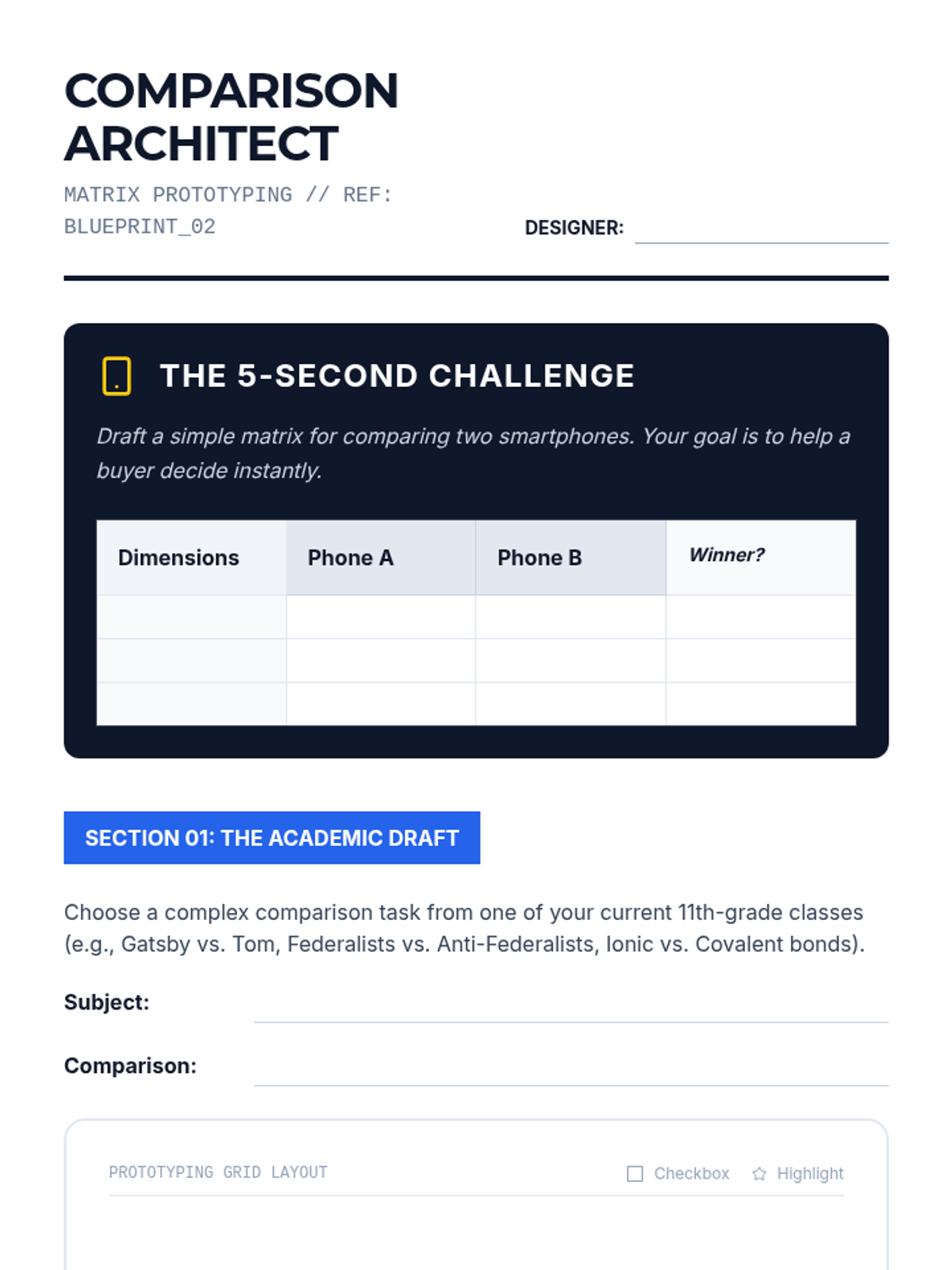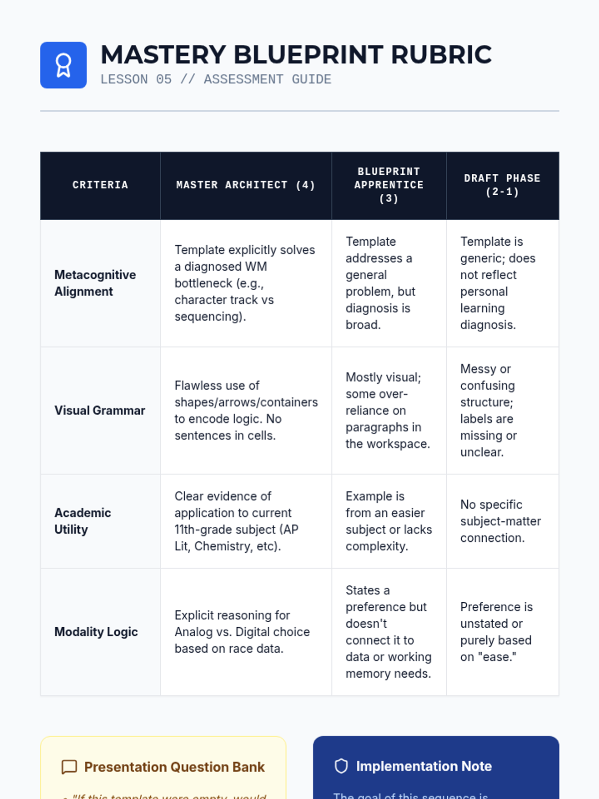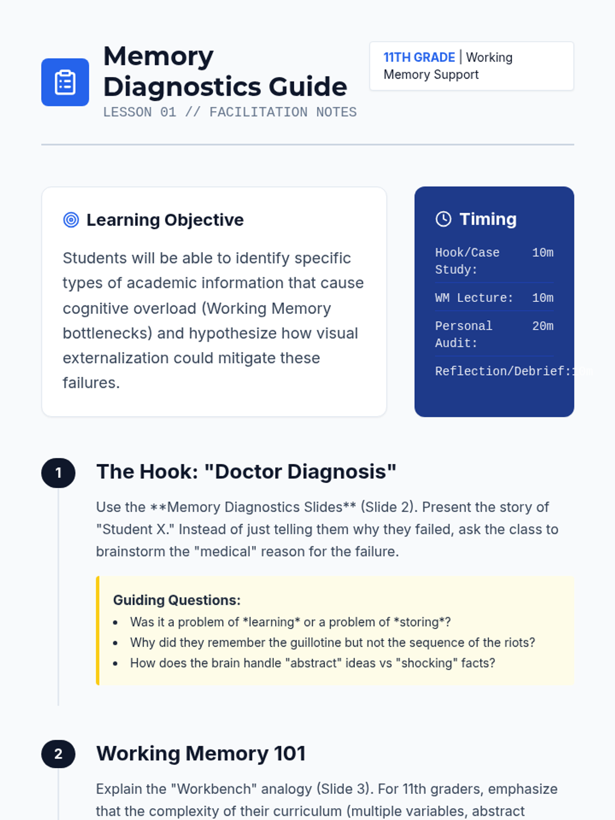 An 11th-grade sequence focused on metacognition and working memory support. Students move from diagnosing their own learning bottlenecks to designing, prototyping, and curating a personalized 'Visual Toolkit' of graphic organizers for complex academic tasks.