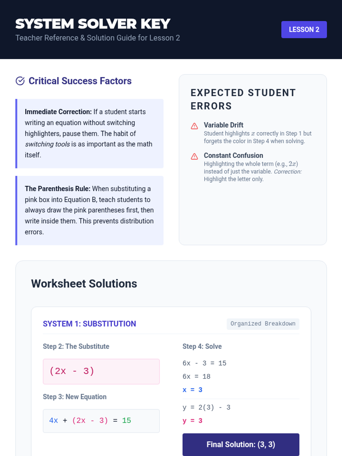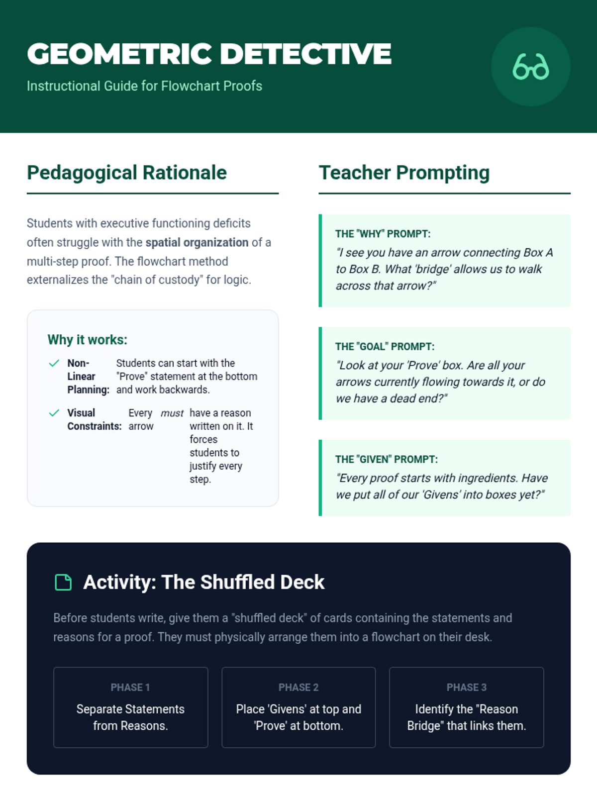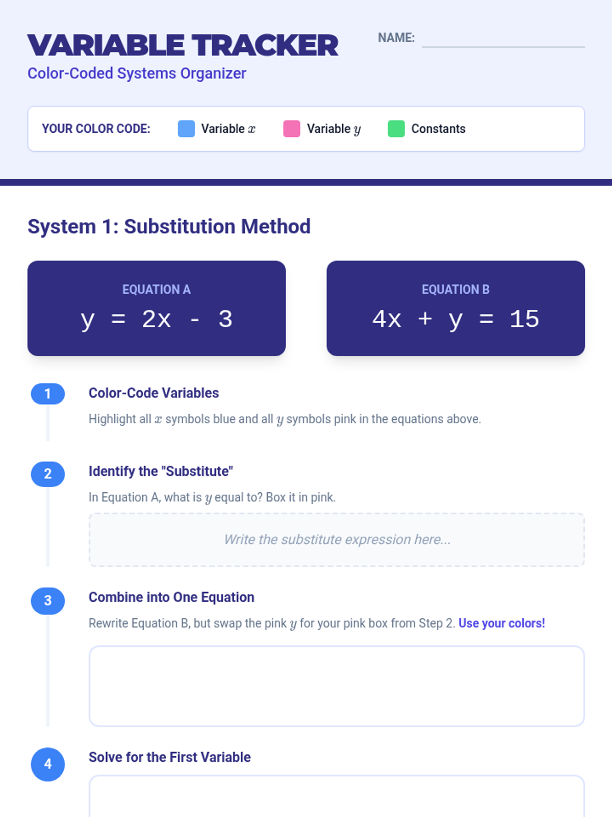 A sequence designed for 11th-grade students requiring academic support to break down complex mathematical problems using visual modeling, color-coding, and flowcharting. This approach reduces cognitive load and bypasses working memory deficits by externalizing abstract relationships into concrete visual structures.