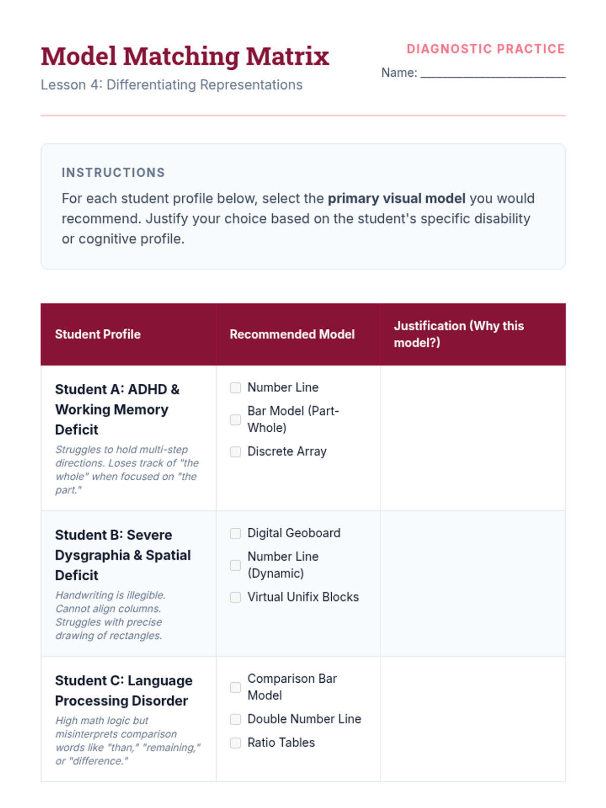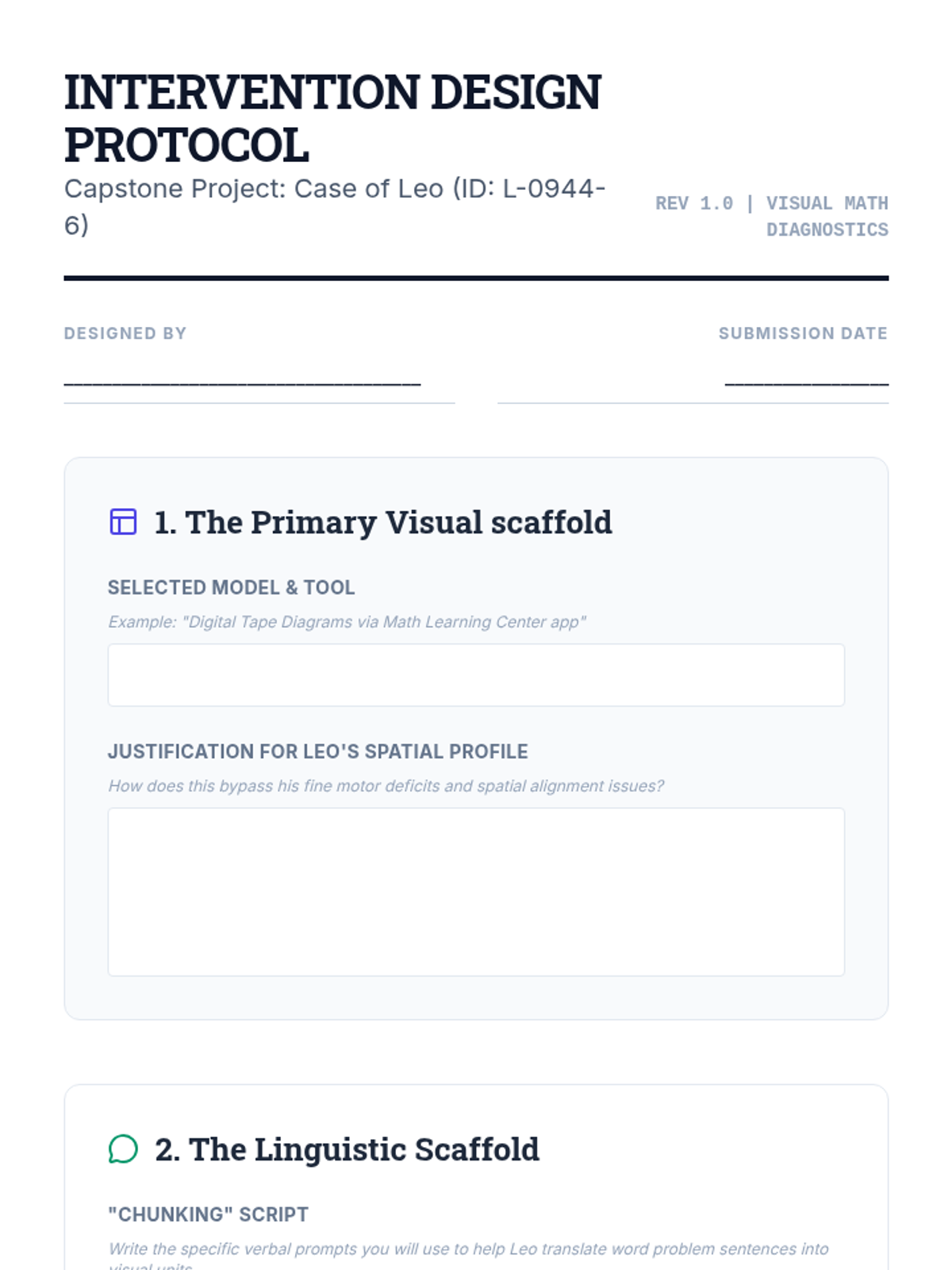 A graduate-level sequence focused on using visual mathematical representations as both a diagnostic lens for identifying student misconceptions and a scaffold for solving multi-step word problems. Students will move from error analysis to designing technology-integrated intervention plans.