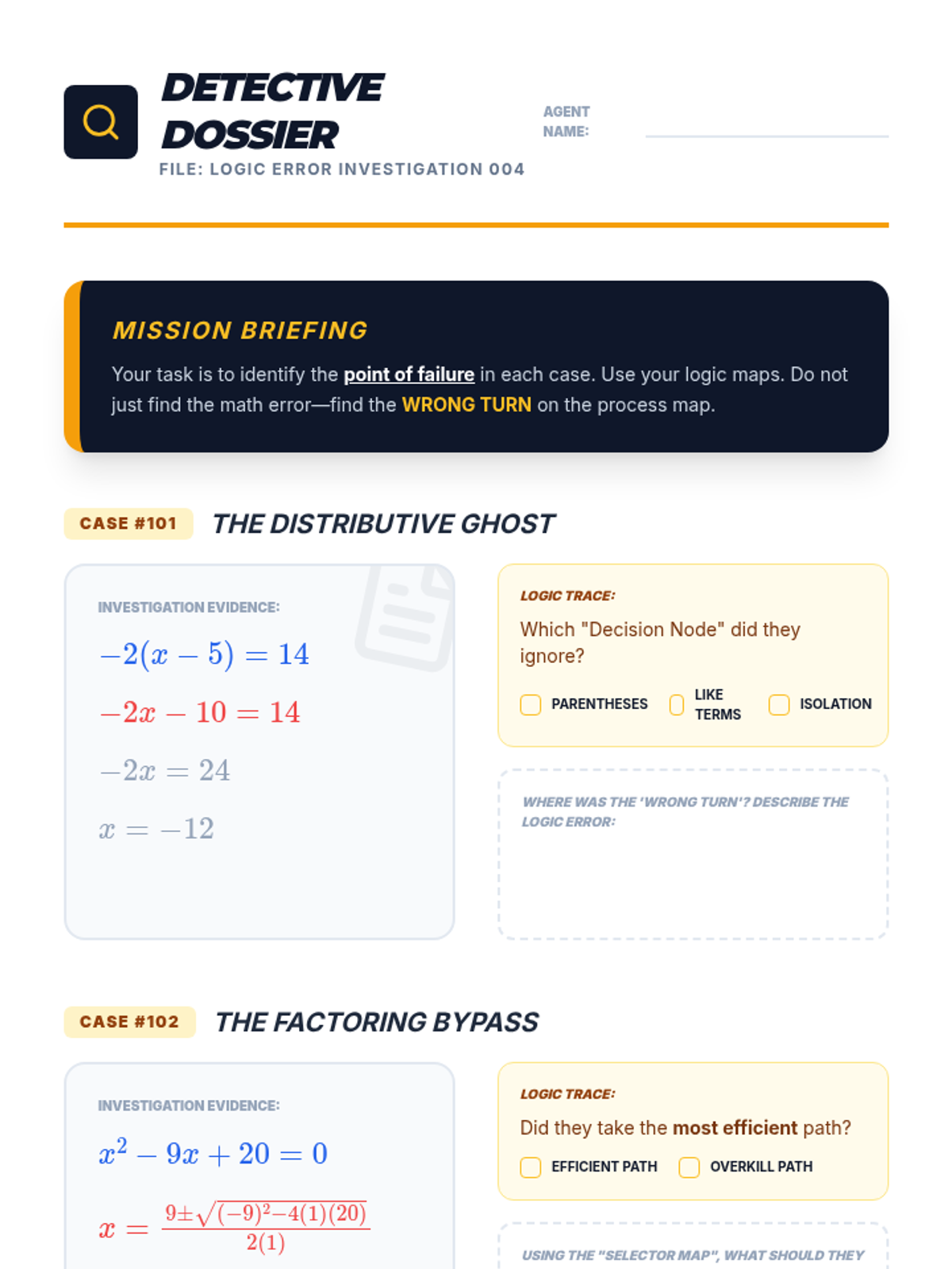 A specialized math sequence for 11th-grade students focusing on visual strategies like flowcharts and decision trees to support executive functioning and procedural memory. Students transition from following provided visual guides to designing their own logical maps for complex algebraic operations.