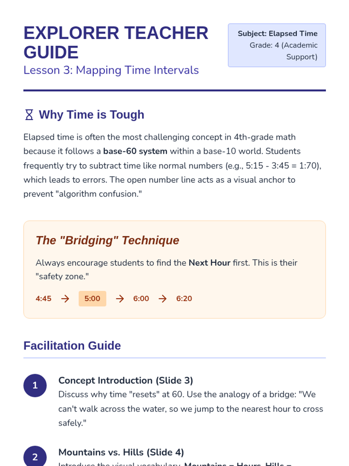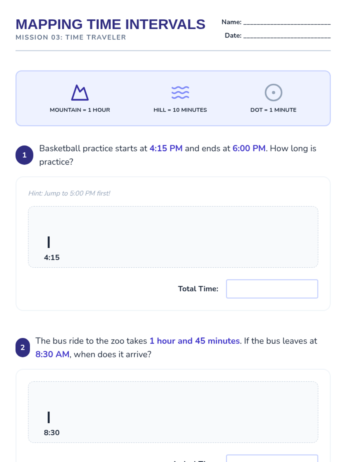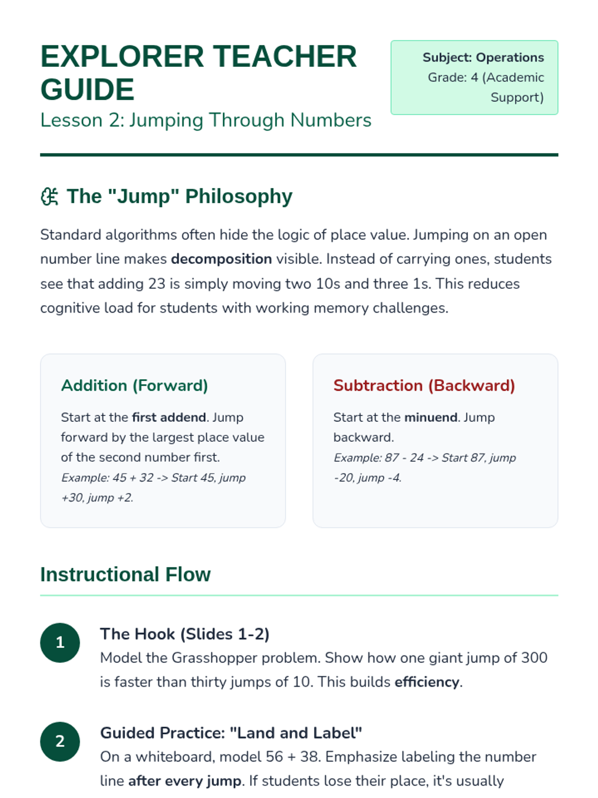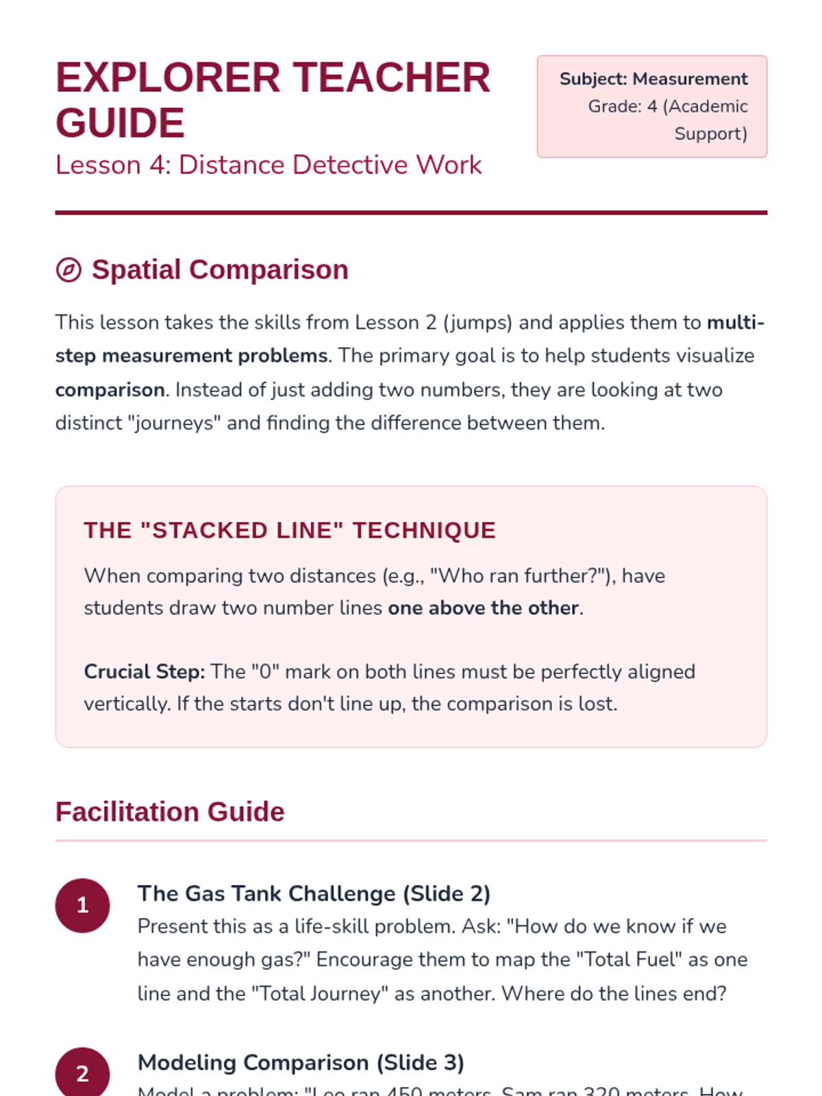 A 4th-grade sequence designed for students needing academic support to master the open number line. Students learn to visualize multi-digit operations, elapsed time, and measurement word problems by mapping them as 'distances' on a line, moving from physical movement to abstract mental math.