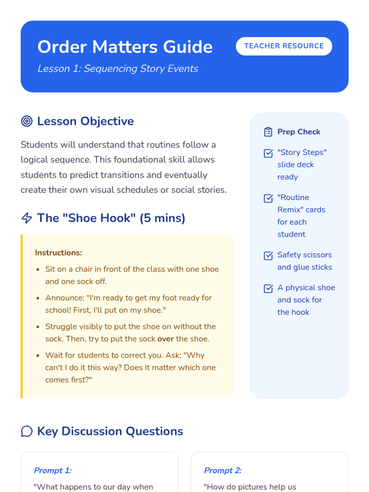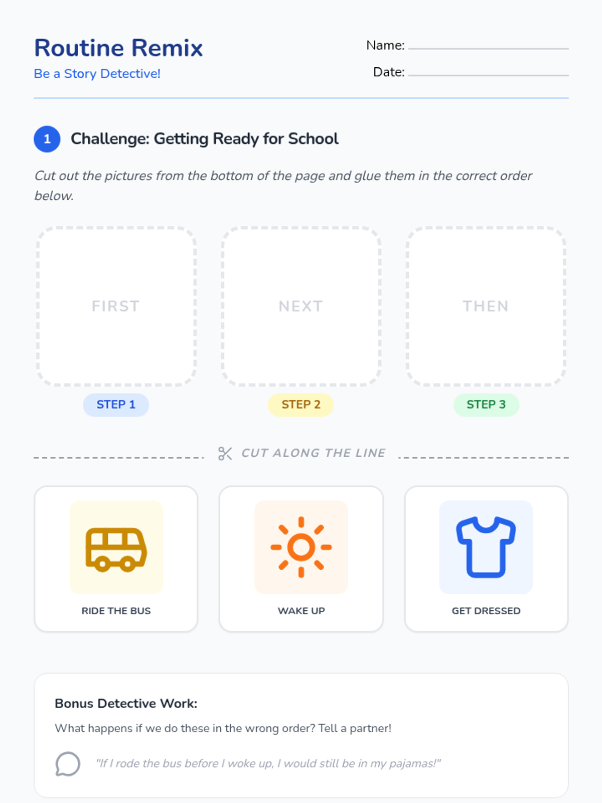 This sequence helps Kindergarten students understand the logic of social stories by practicing sequencing, visualizing transitions with 'First/Then' boards, and creating their own 'My School Day' mini-book to reinforce positive behavior and routines.