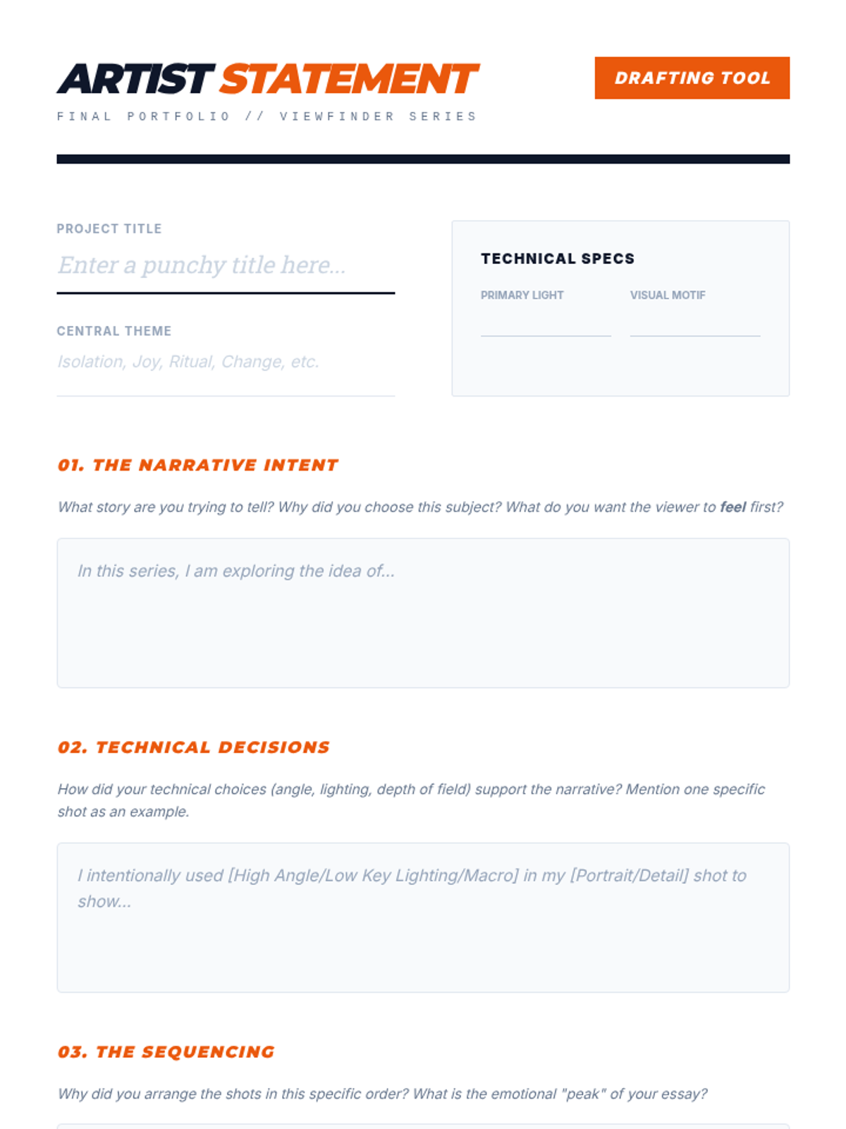 A comprehensive high school photography unit focused on visual storytelling and the creation of photo essays. Students transition from single images to intentional series, learning to storyboard, curate, and present a cohesive narrative body of work.