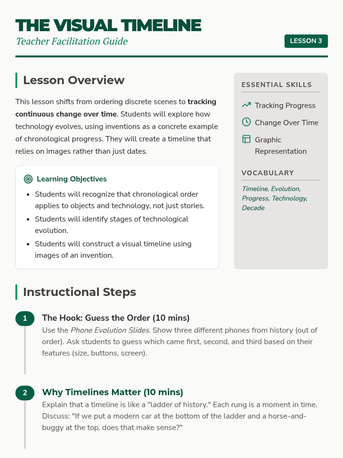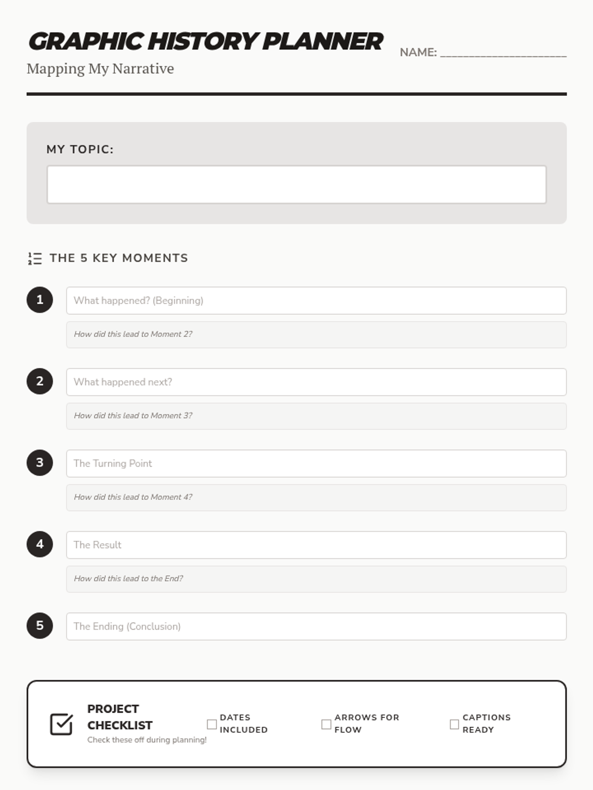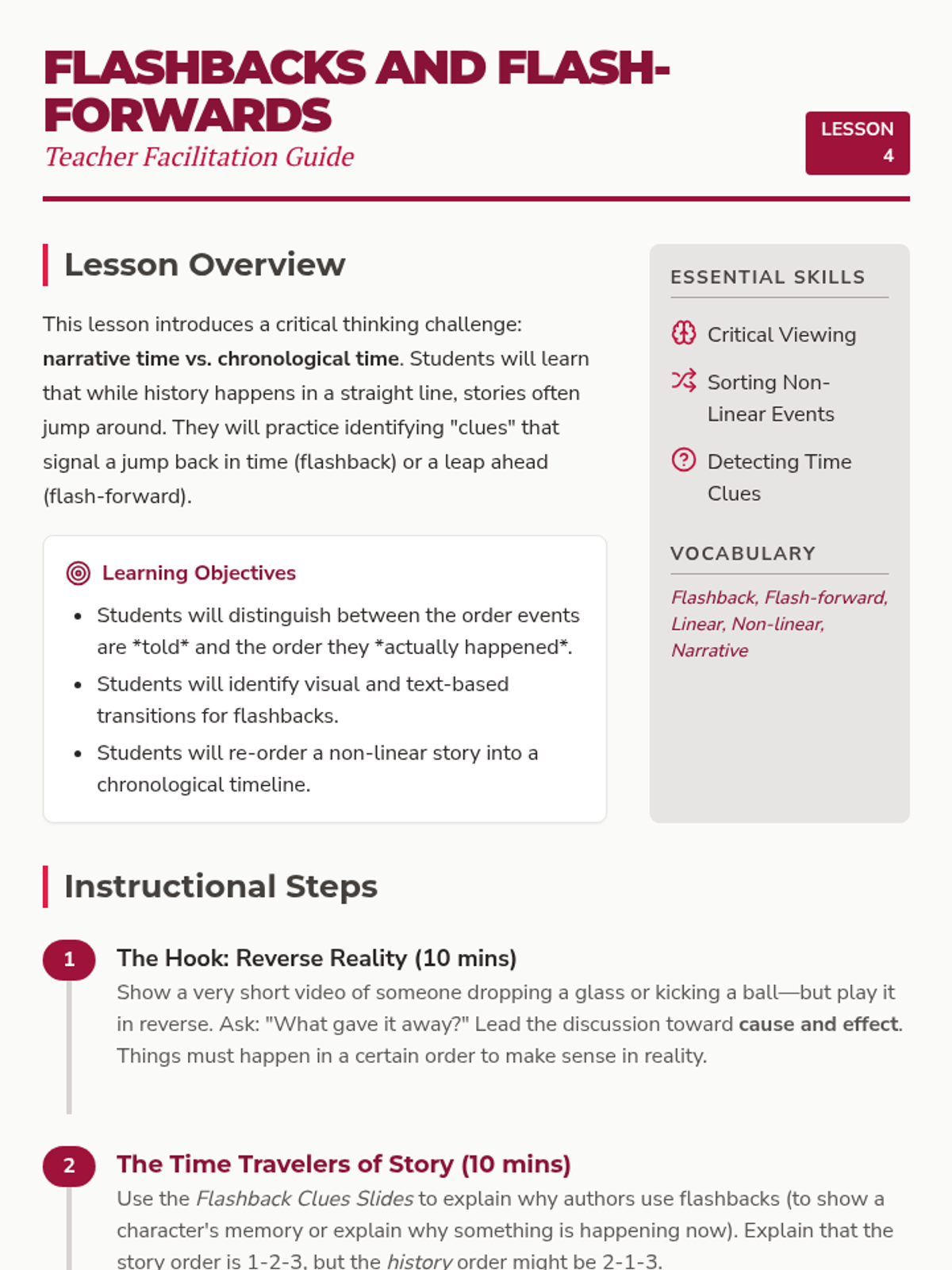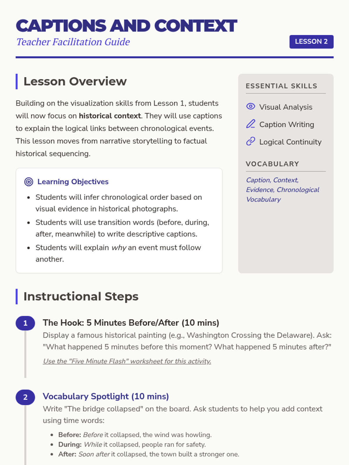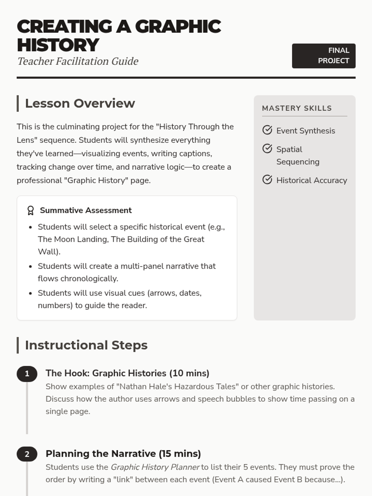 Students learn to order historical and narrative events by translating text into visual storyboards, timelines, and graphic histories. This sequence focuses on visual literacy and chronological thinking through a cinematic 'History's Lens' theme.