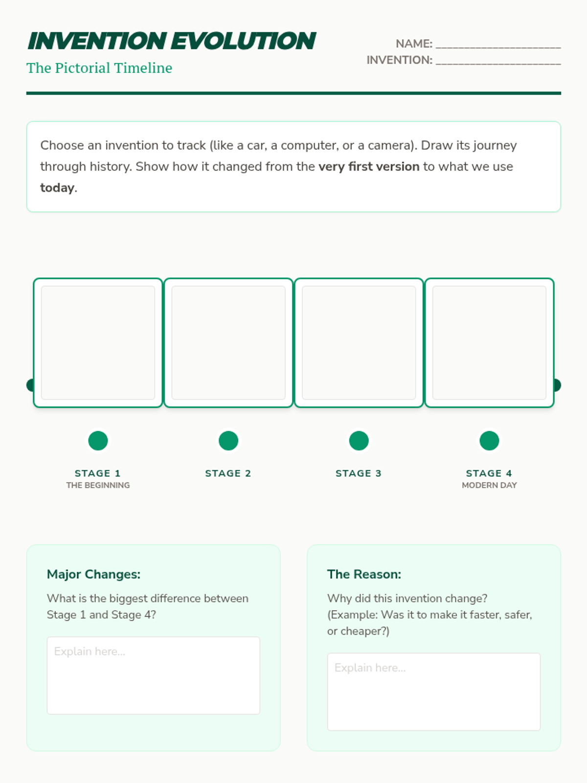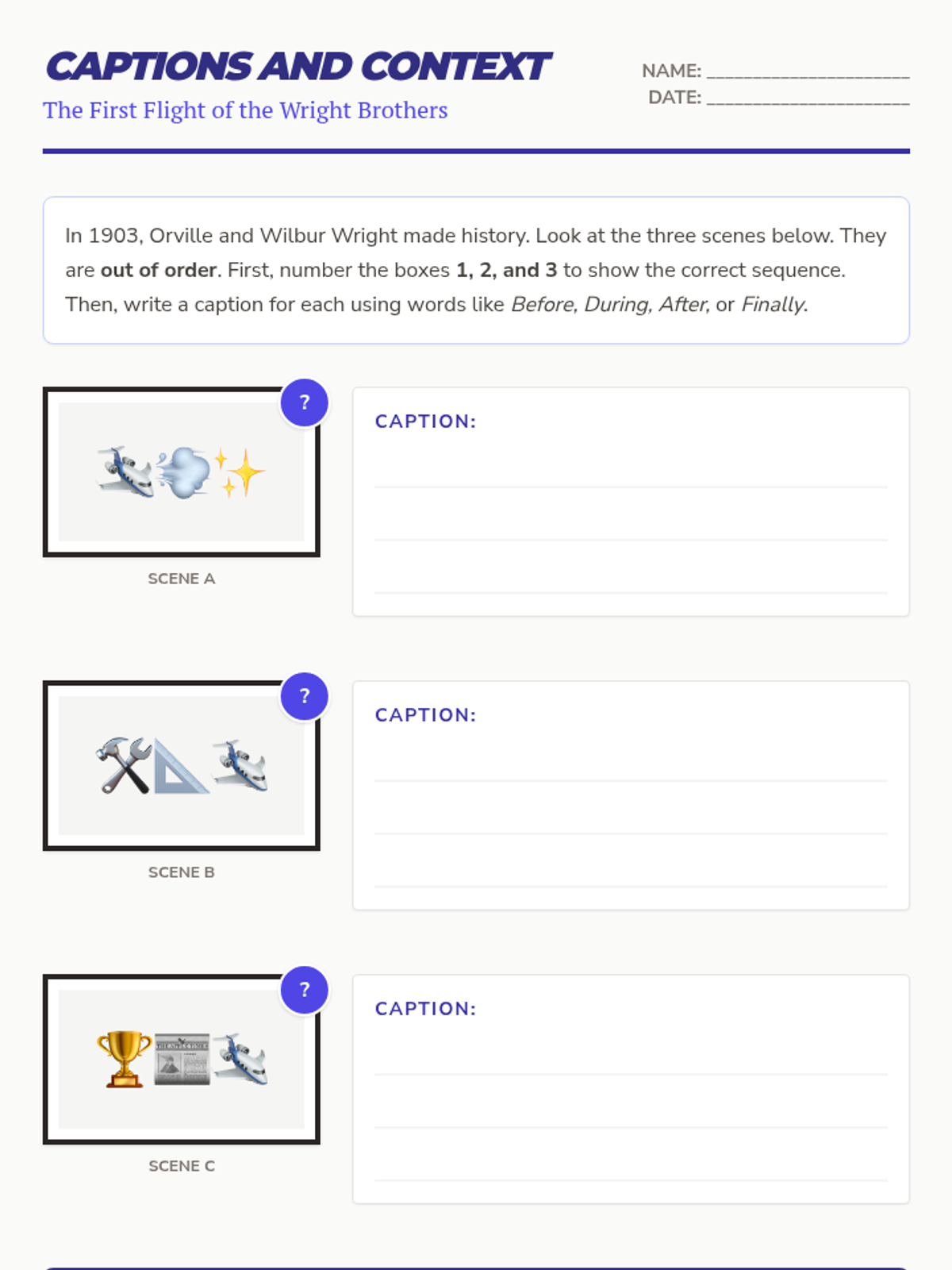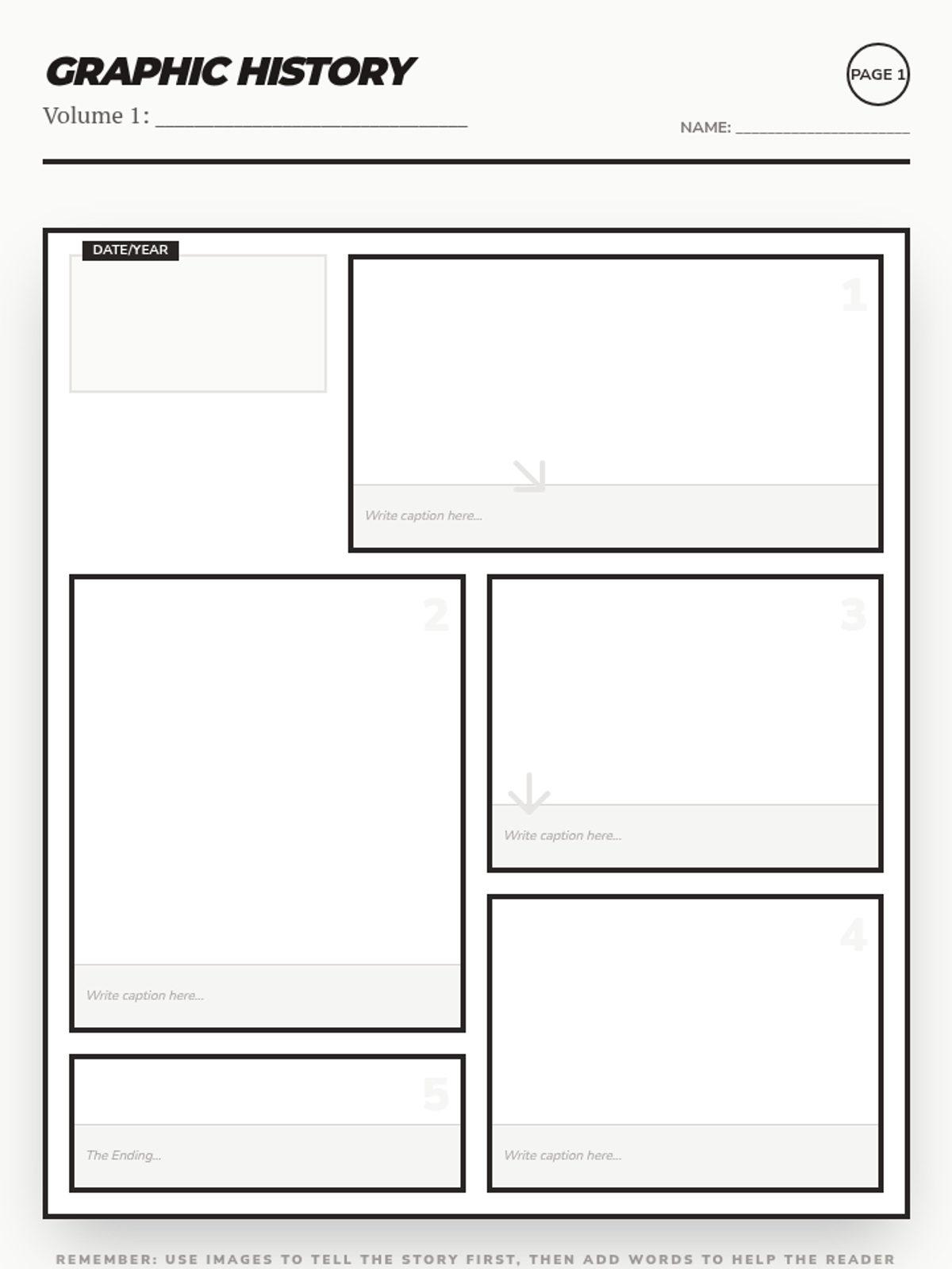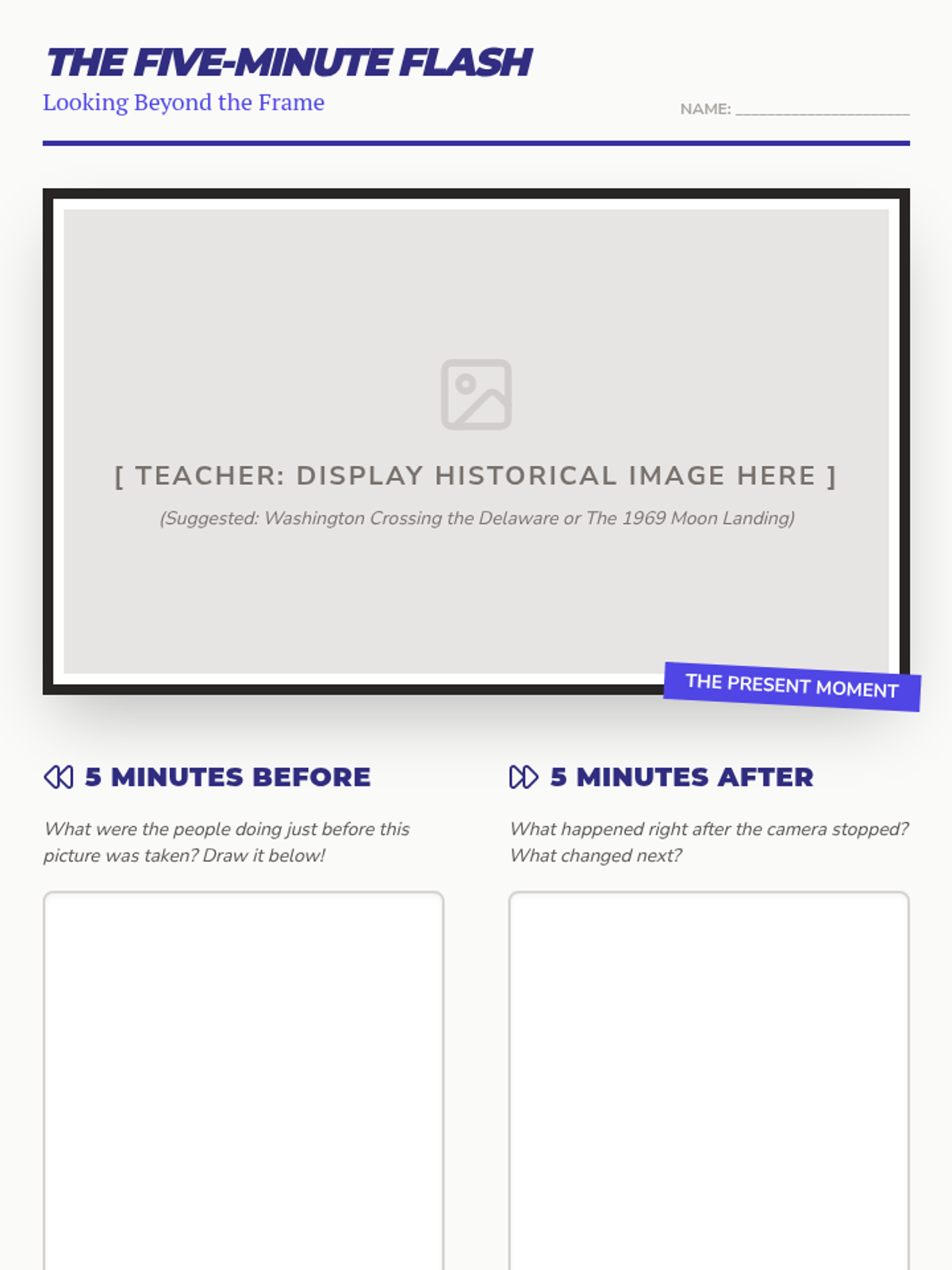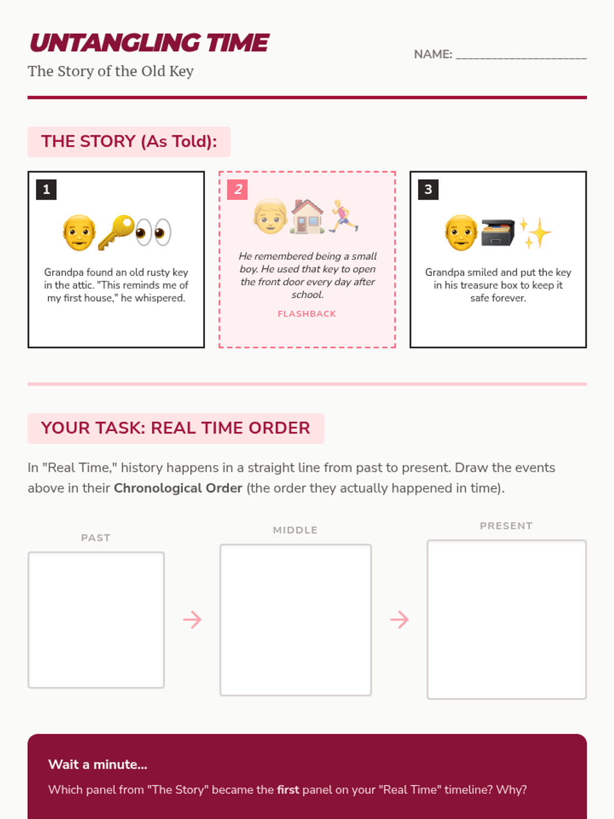 Students learn to order historical and narrative events by translating text into visual storyboards, timelines, and graphic histories. This sequence focuses on visual literacy and chronological thinking through a cinematic 'History's Lens' theme.