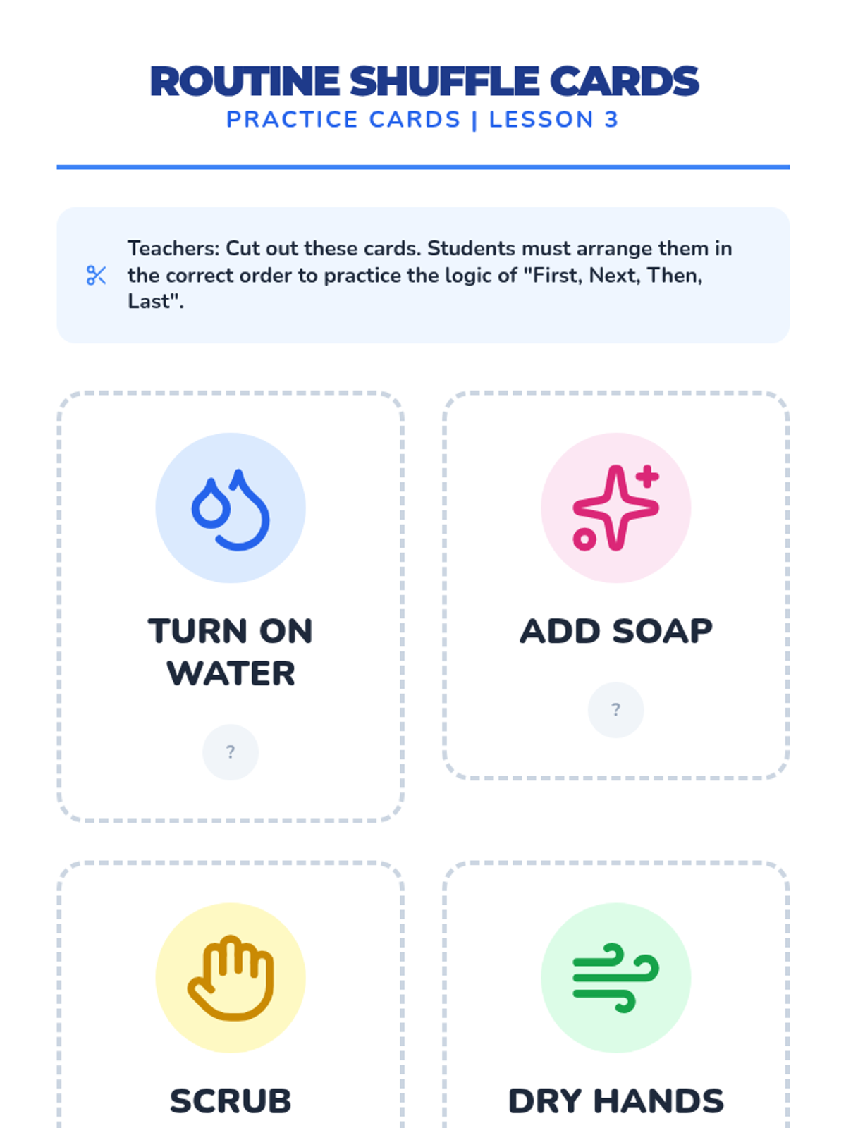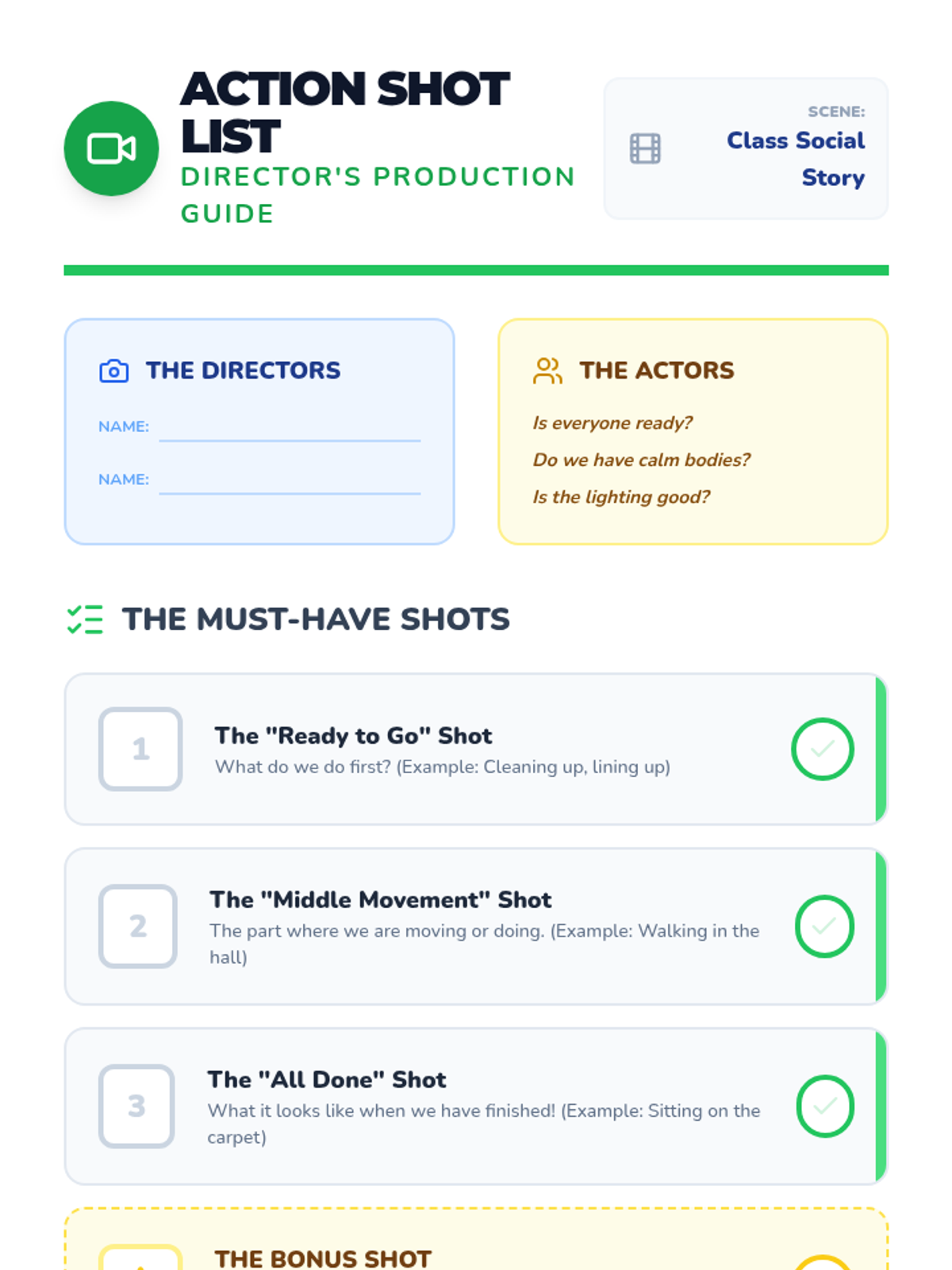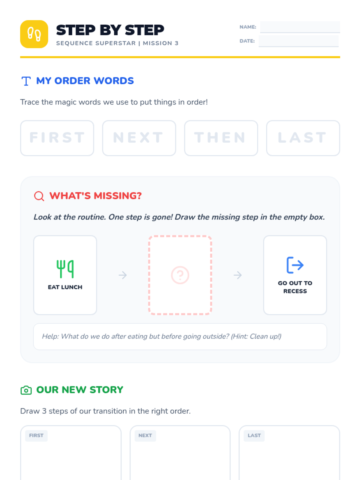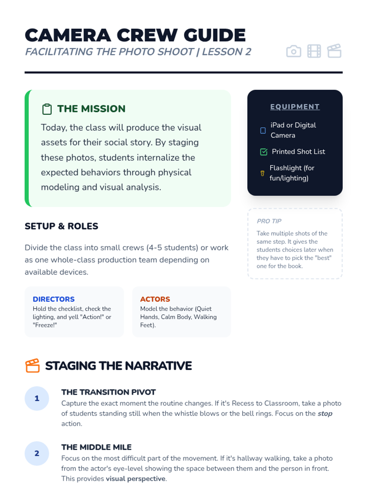 This sequence focuses on executive function and anxiety reduction by co-creating visual narratives for challenging school transitions. Students analyze routines, capture photos of expected behaviors, and sequence them into a personal social story guide.
