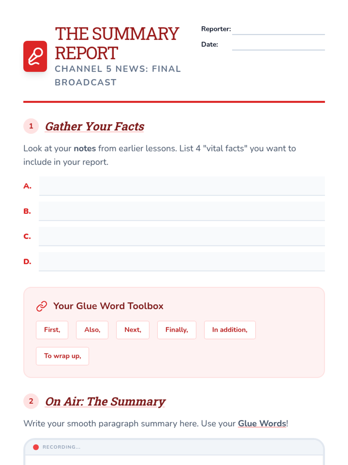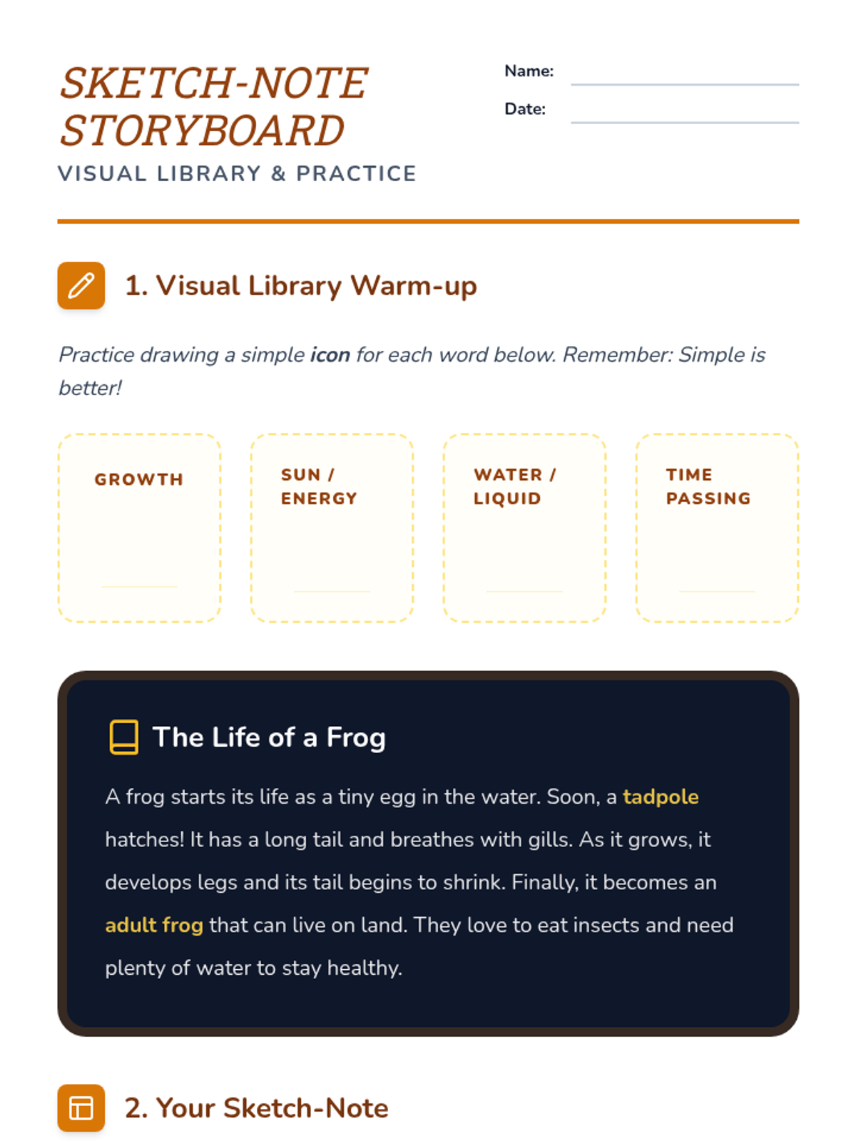 A 5-lesson series designed to transform 3rd-grade students into active learners through visual note-taking. Students move from simple categorization with T-charts to complex idea mapping and sketch-noting, culminating in the ability to synthesize notes into formal academic summaries.