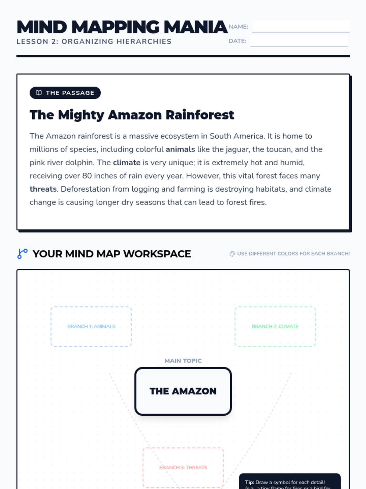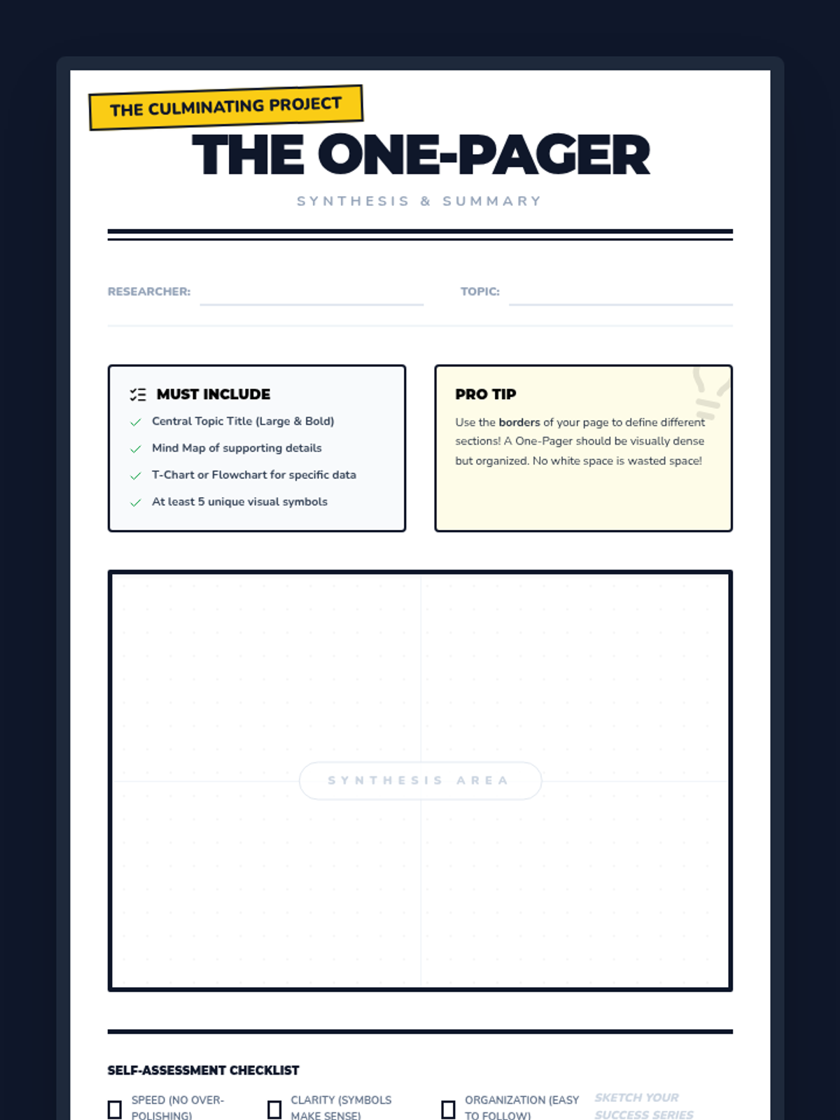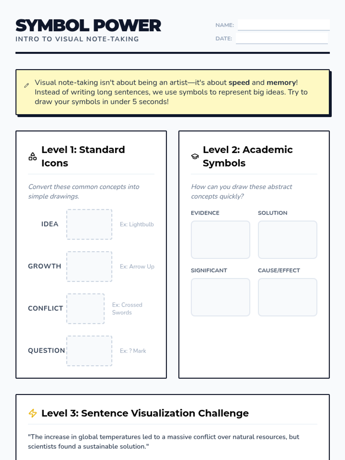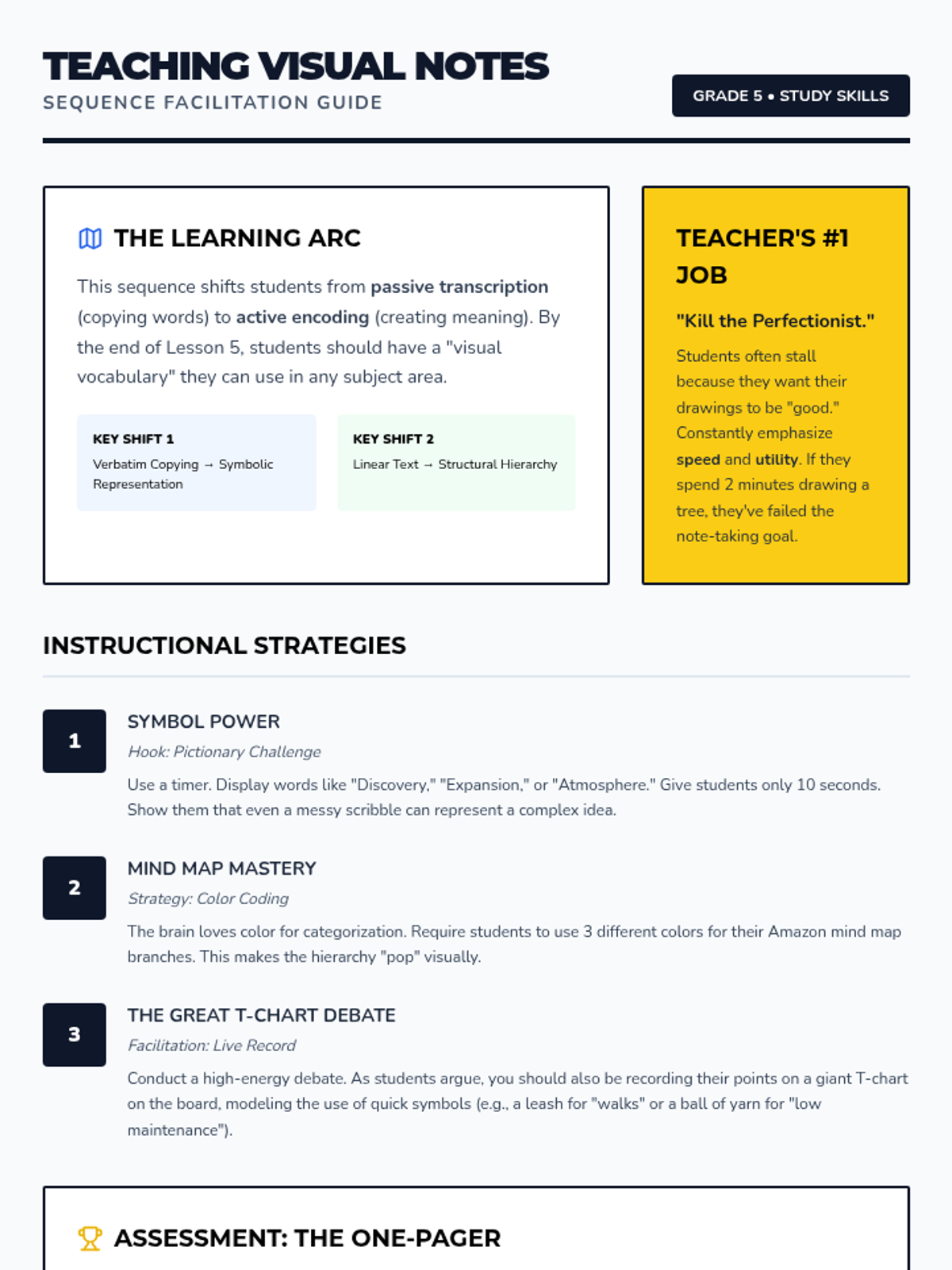 A 5-lesson sequence for 5th-grade students focused on visual note-taking techniques. Students learn to translate academic concepts into icons, organize ideas with mind maps and T-charts, track processes with flowcharts, and synthesize information into a comprehensive one-pager.