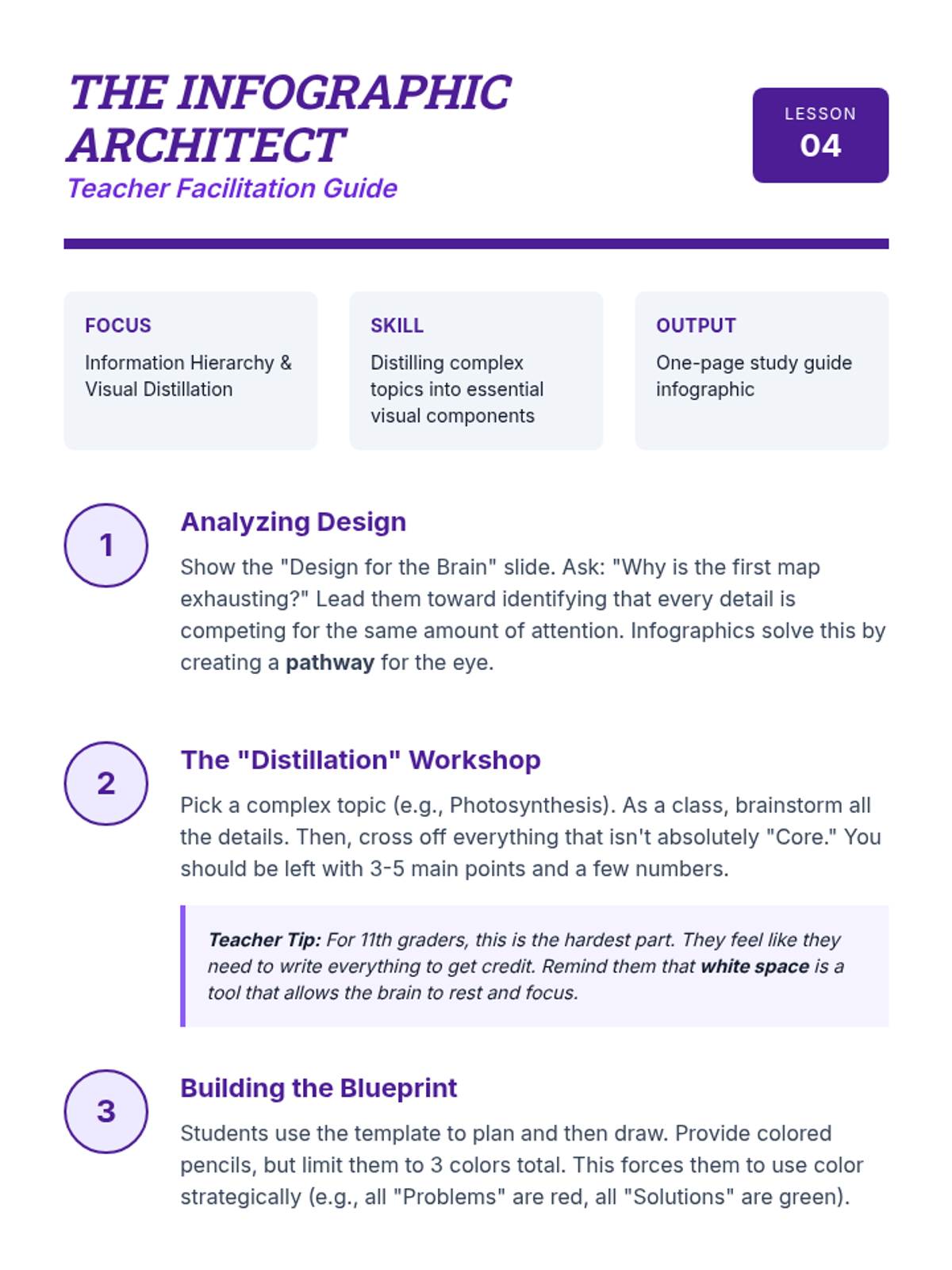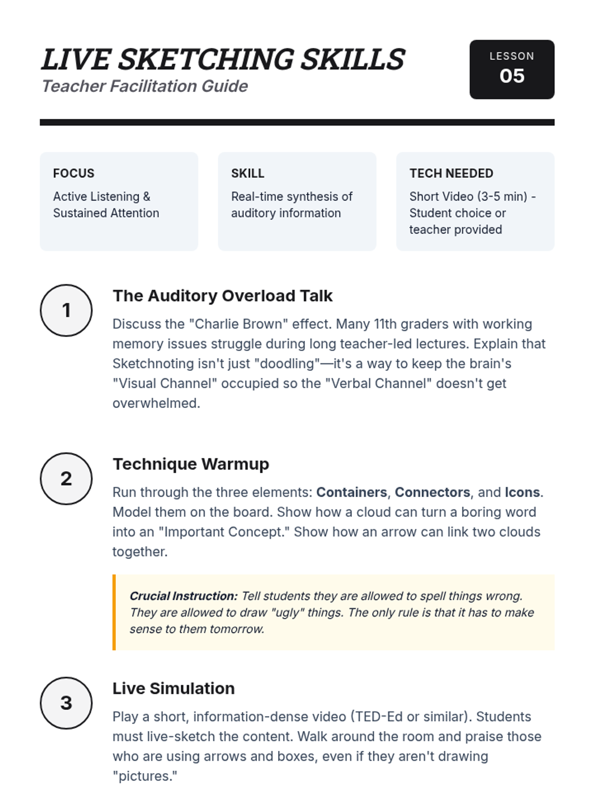 This sequence teaches 11th-grade students with working memory challenges how to use Dual Coding Theory and visual organization to improve information retention. Students progress from basic memory strategies to advanced concept mapping, infographic design, and real-time sketch-noting.