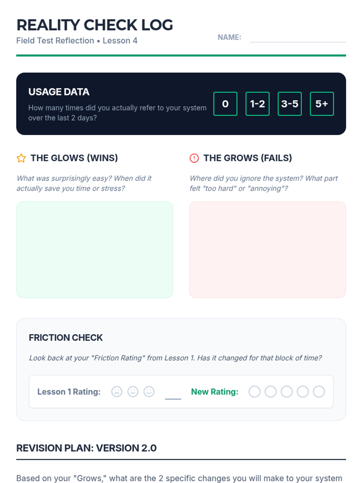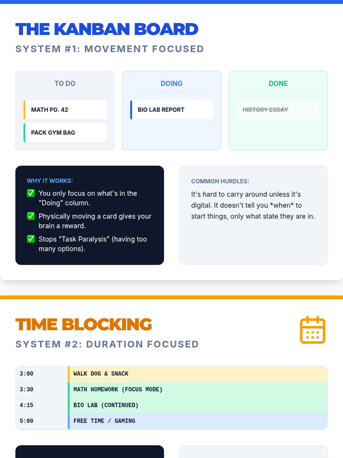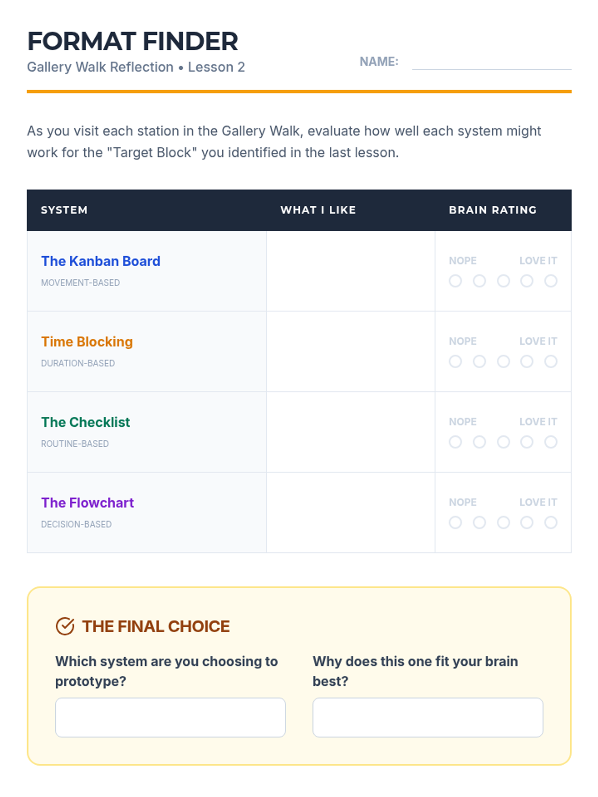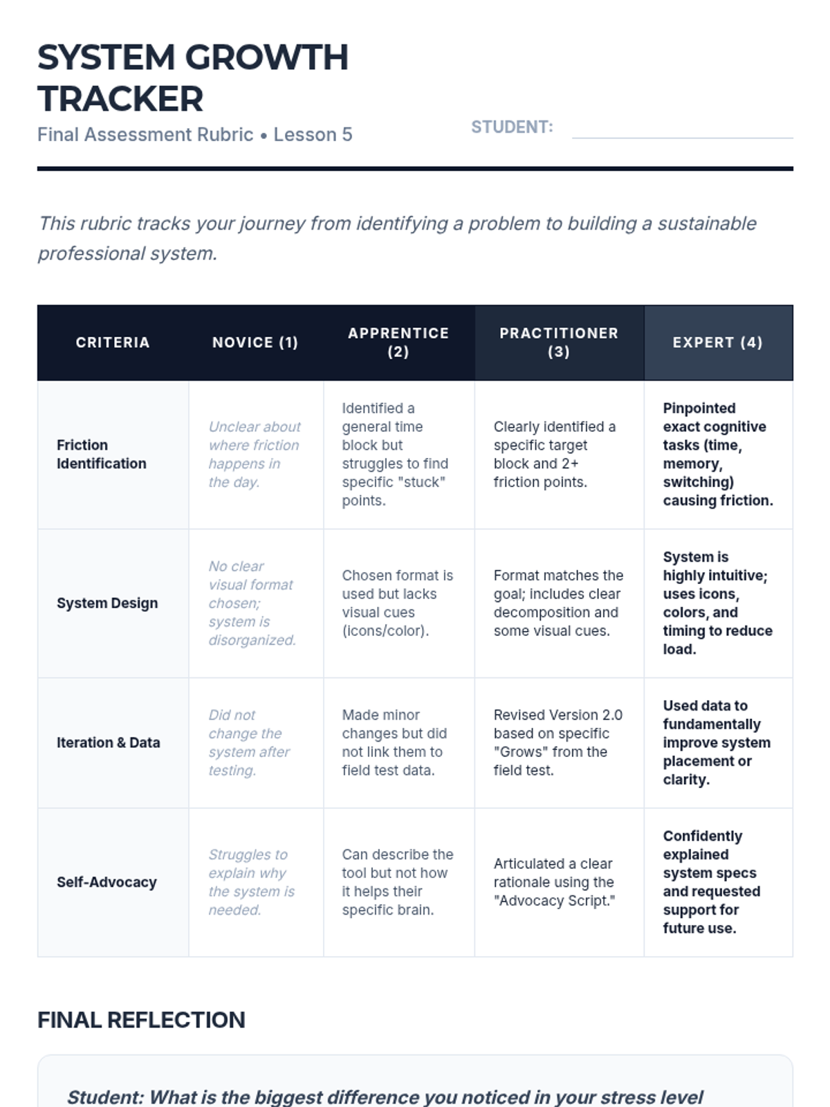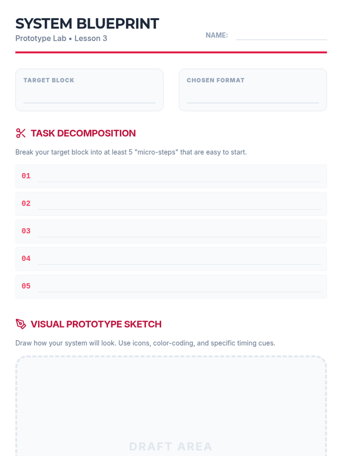 A 10th-grade sequence focused on transitioning students from teacher-directed schedules to personalized visual organization systems. Students identify executive functioning friction points, explore diverse visual formats (Kanban, time-blocking, checklists), and iterate on a custom prototype to increase independence and reduce anxiety.