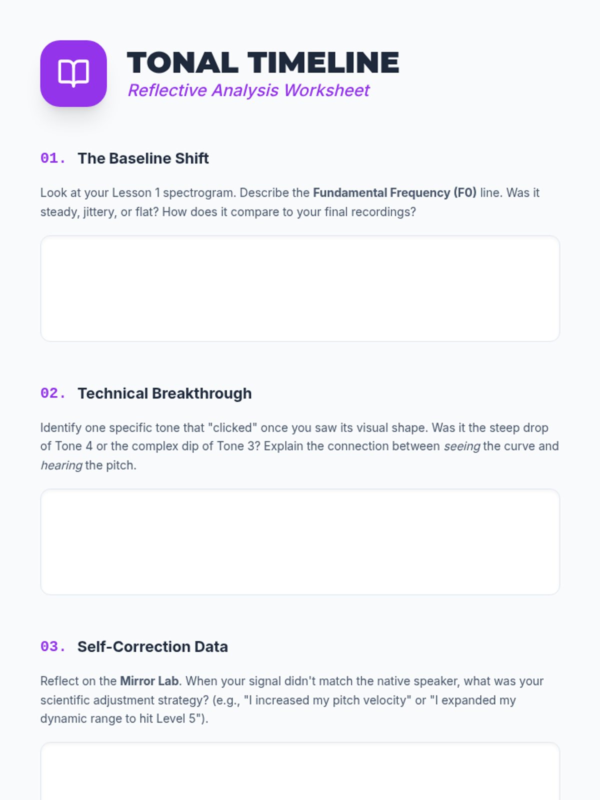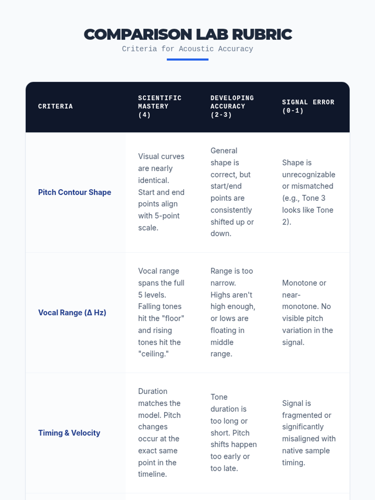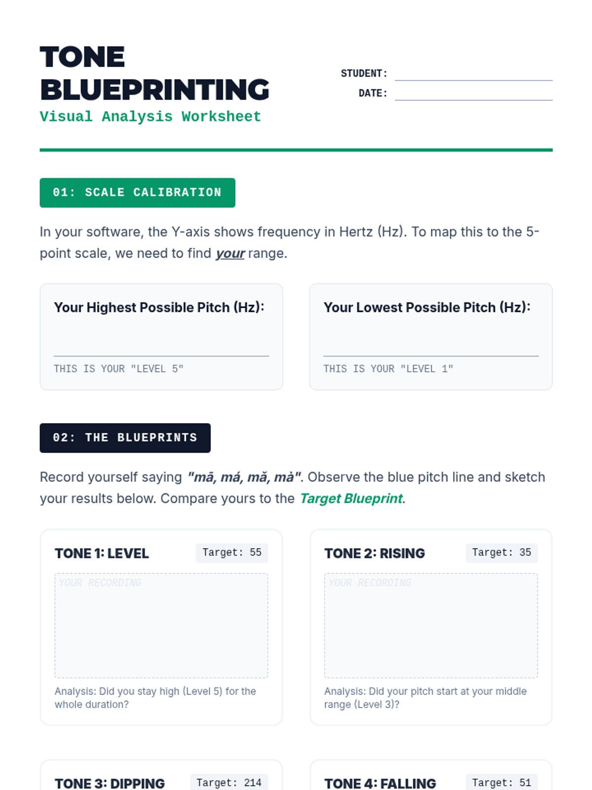 A high-tech approach to Mandarin tones for 10th graders, using acoustic analysis software to visualize pitch contours. Students treat pronunciation as a scientific inquiry, comparing their own voice waves to native speaker models.