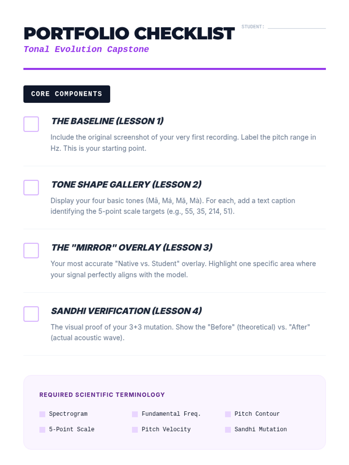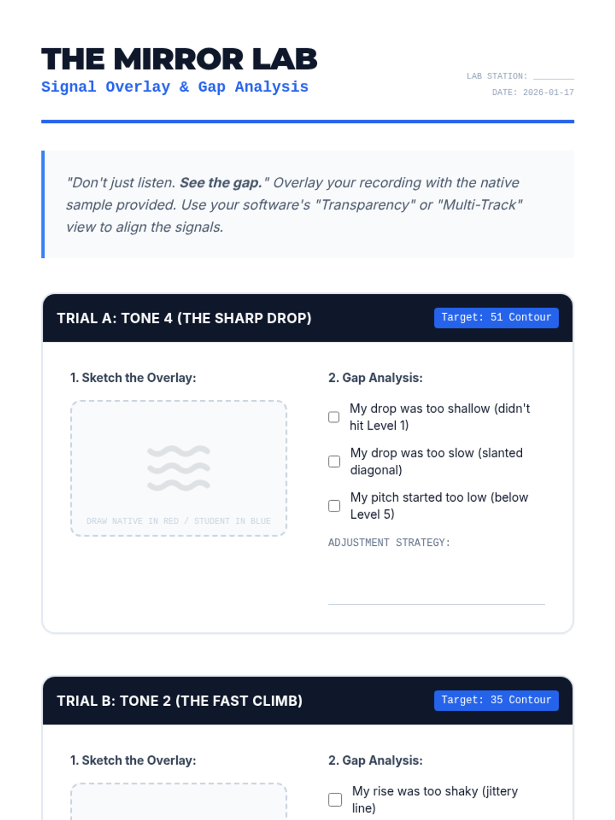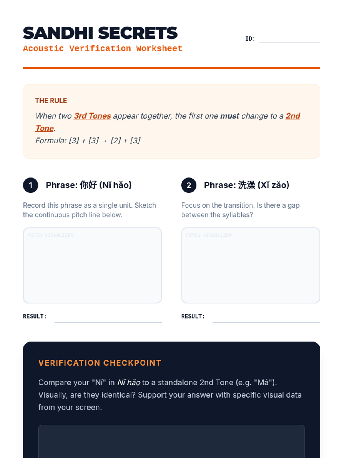 A high-tech approach to Mandarin tones for 10th graders, using acoustic analysis software to visualize pitch contours. Students treat pronunciation as a scientific inquiry, comparing their own voice waves to native speaker models.