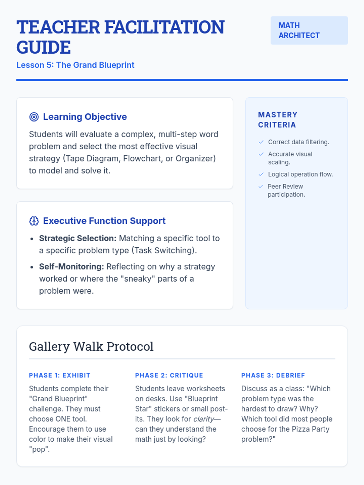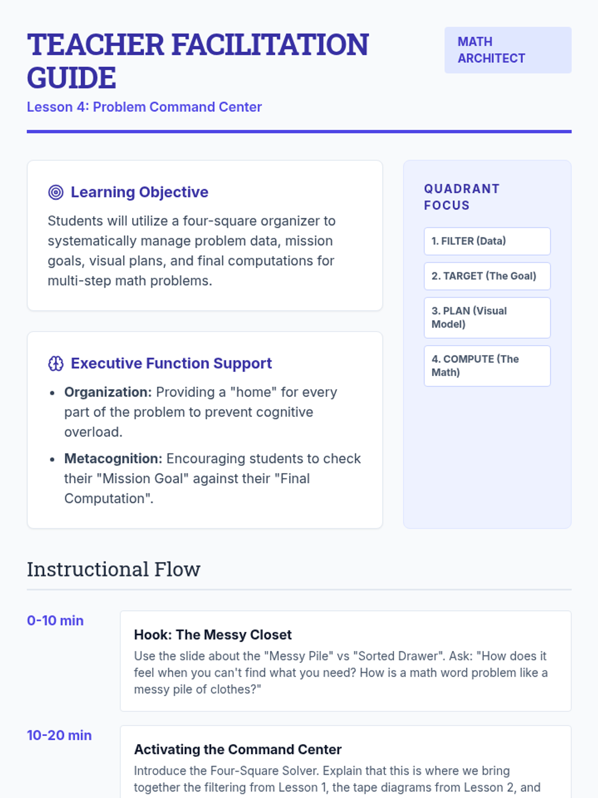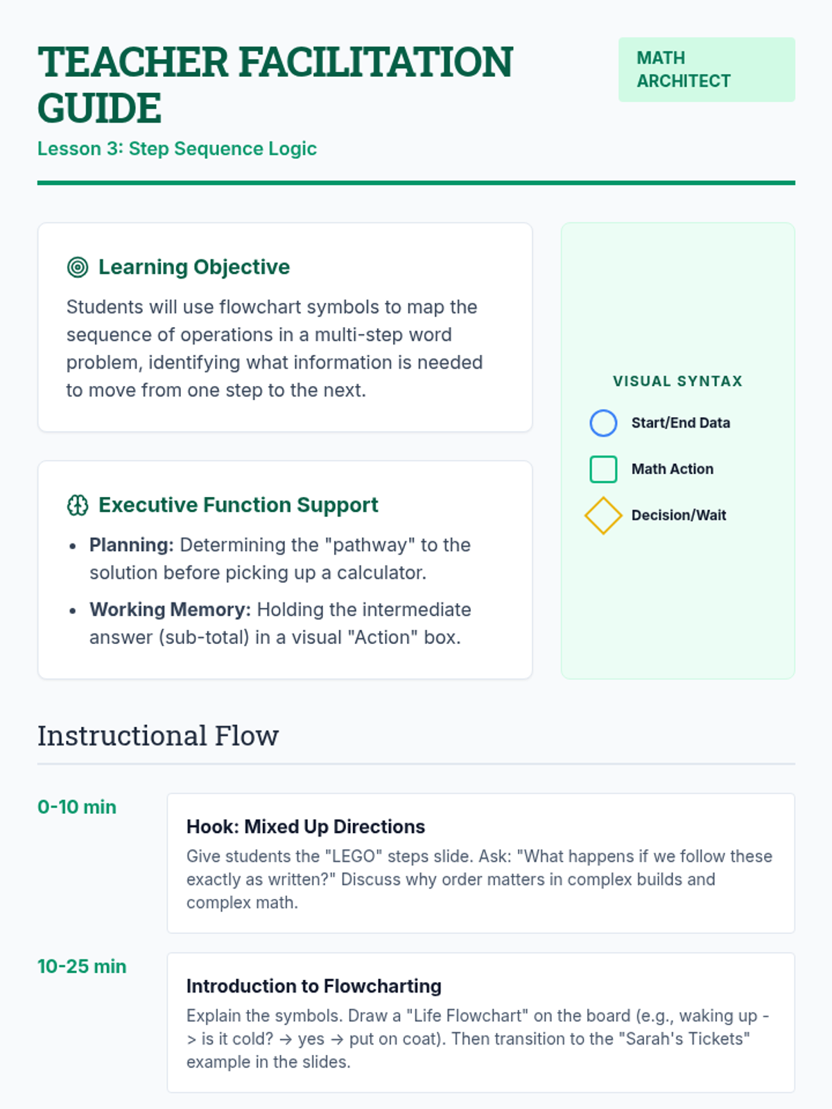 A sequence focused on executive function and working memory support for 6th-grade students, teaching them to externalize math thinking through visual modeling, parsing, and flowcharting complex word problems.
